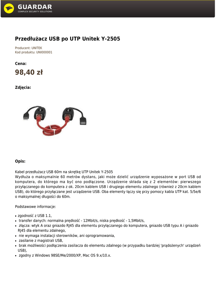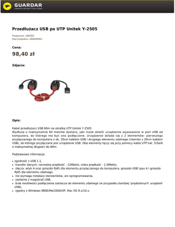 Przedłużacz USB po UTP Unitek Y-2505 Producent: UNITEK Kod produktu: UNI000001 Cena: 98,40 zł Zdjęcia: Opis: Kabel przedłużacz USB 60m na skrętkę UTP Unitek Y-2505 Wydłuża o maksymalnie 60 metrów dystans, jaki może dzielić urządzenie wyposażone w port USB od komputera, do którego ma być ono podłączone. Urządzenie składa się z 2 elementów: pierwszego przyłączanego do komputera z ok. 20cm kablem USB i drugiego elementu zdalnego (również z 20cm kablem USB), do którego przyłączane jest urządzenie USB. Oba elementy łączy się przy pomocy kabla UTP kat. 5/5e/6 o maksymalnej długości do 60m. Podstawowe informacje: ● ● ● ● ● ● ● zgodność z USB 1.1, transfer danych: normalna prędkość - 12Mbit/s, niska prędkość - 1,5Mbit/s, złącza: wtyk A oraz gniazdo RJ45 dla elementu przyłączanego do komputera, gniazdo USB typu A i gniazdo RJ45 dla elementu zdalnego, nie wymaga instalacji sterowników, ani oprogramowania, zasilanie z magistrali USB, brak możliwości podłączenia zasilacza do elementu zdalnego (w przypadku bardziej 'prądożenych' urządzeń USB), zgodny z Windows 98SE/Me/2000/XP, Mac OS 9.x/10.x.