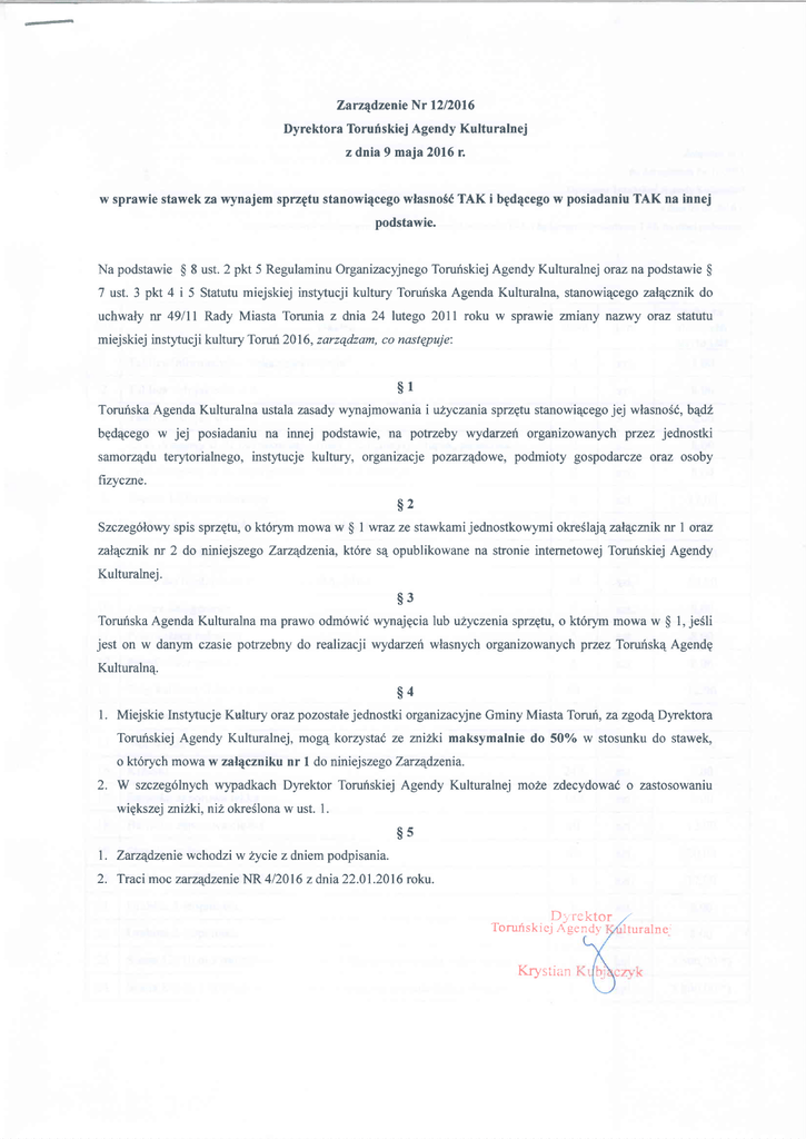 Zarządzenie Nr 12/2016 Dyrektora Toruńskiej Agendy Kulturalnej z