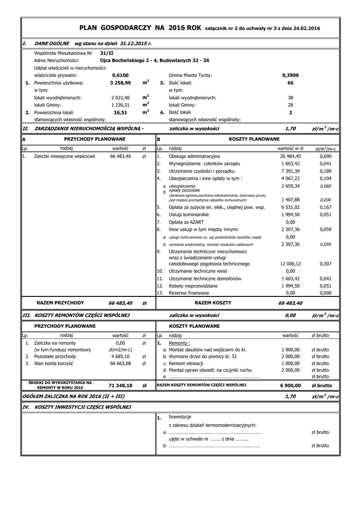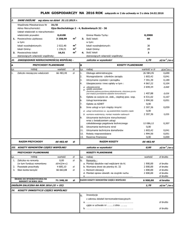 PLAN GOSPODARCZY NA 2016 ROK I. DANE OGÓLNE załącznik nr 2 do uchwały nr 3 z dnia 24.02.2016 wg stanu na dzień 31.12.2015 r. Wspólnota Mieszkaniowa Nr 31/II Adres Nieruchomości: Ojca Bocheńskiego 2 - 4, Budowlanych 32 - 36 Udział właścicieli w nieruchomości: właściciele prywatni: 0,6100 1. Powierzchnia użytkowa: 3 258,99 Gmina Miasta Tychy: m2 w tym: lokali wyodrębnionych: 2 022,48 m2 lokali wyodrębnionych: 38 lokali Gminy: 1 236,51 m2 lokali Gminy: 28 16,51 m2 4. Ilość lokali stanowiących własność wspólnoty: ZARZĄDZANIE NIERUCHOMOŚCIĄ WSPÓLNĄ PRZYCHODY PLANOWANE A rodzaj Lp. 1. 66 w tym: 2. Powierzchnia lokali stanowiących własność wspólnoty: II. 0,3900 3. Ilość lokali: Zaliczki miesięczne właścicieli 2 1,70 zł/m 2 /m-c wartość w zł zł/m2/m-c zaliczka w wysokości KOSZTY PLANOWANE B wartość zł Lp. rodzaj 66 483,40 zł 1. Obsługa administracyjna 26 984,45 0,690 2. Wynagrodzenie członków zarządu 1 603,42 0,041 3. Utrzymanie czystości i porządku 7 391,39 0,189 4. Ubezpieczenia i inne opłaty w tym : 4 067,22 0,104 2 659,34 0,068 a. ubezpieczenia b. opłaty pozostałe (bankowe,sądowe,pocztowe,odszkodowania, dzierzawa gruntu pod miejsca gromadzenia odpadów komunalnych) 1 407,88 0,036 5. Opłata za zużycie en. elek., cieplnej pow. wsp. 6 531,02 0,167 6. Usługi kominiarskie 1 994,50 0,051 7. Opłata za AZART 8. Inne usługi w tym między innymi: 0,00 2 307,36 b. wymiana wodomierzy, montaż modułów radiowych RAZEM PRZYCHODY 66 483,40 11. Utrzymanie techniczne domofonów 1 603,42 0,041 12. 13. Roboty nieprzewidziane Rezerwa finansowa 1 994,50 0,00 0,051 0,000 RAZEM KOSZTY zł 0,00 66 483,40 zaliczka w wysokości 0,00 zł/m 2 /m-c KOSZTY PLANOWANE Lp. Zaliczka na remonty (w tym fundusz remontowy Pozostałe przychody Stan konta korzyść 0,00 zł/m2/m-c) 4 685,10 66 663,08 zł 1. ŚRODKI DO WYKORZYSTANIA NA REMONTY W ROKU 2016 71 348,18 zł a. b. c. d. e. zł zł rodzaj wartość zł brutto Remonty : Montaż daszków nad wejściami do kl. Wymiana drzwi do piwnicy kl. 32 Remont elewacji Montaż opraw oświetl. na czujniki ruchu ……………………………………………………………… 1 2 1 2 zł zł zł zł zł RAZEM KOSZTY REMONTÓW CZĘŚCI WSPÓLNEJ OGÓŁEM ZALICZKA NA ROK 2016 (II + III) IV. 0,307 Utrzymanie techniczne wind zł 2. 3. 12 006,12 10. wartość 1. 0,059 Utrzymanie techniczne nieruchomosci wraz z świadczeniem usługi całodobowego pogotowia technicznego PRZYCHODY PLANOWANE rodzaj 2 307,36 9. III. KOSZTY REMONTÓW CZĘŚCI WSPÓLNEJ Lp. 0,059 0,00 a. usługi rozliczeniowe co. wg podzielników kosztów ciepła 900,00 000,00 000,00 000,00 6 900,00 1,70 brutto brutto brutto brutto brutto zł brutto zł/m 2 /m-c KOSZTY INWESTYCJI CZĘŚCI WSPÓLNEJ 1. Inwestycje z zakresu działań termomodernizacyjnych: a. …………………………..…………………………………. ujęte w uchwale nr …….. z dnia …….... b. …………………………..…………………………………. zł brutto zł brutto