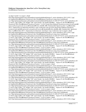 Publiczne Gimnazjum im. Jana Paw�a II w Nowej Brze�nicy Dzie�Edukacji Narodowej <p align="justify"><a target='_blank' href='http://gimnazjumbrzeznica.pl/mambots/content/multithumb/images/1..stories.aktualnosci.2013-10-03_1.jpg' rel='lightbox[Dzie�Edukacji Narodowej]' title='Dzie�Edukacji Narodowej'><img class='multithumb' src="http://gimnazjumbrzeznica.pl/mambots/content/multithumb/thumbs/b.133.100.16777215.0..stories.aktualnosci.20 13-10-03_1.jpg"width="178" height="100" style='border: 3px double #565B61;' hspace='6' alt='Dzie�Edukacji Narodowej' title='Dzie�Edukacji Narodowej' border='' /></a>Z okazji Dnia Edukacji Narodowej uczniowie pod opiek� nauczycieli przygotowali uroczyst� akademi� która odby�a si�w Gminnej Hali Sportowej dnia 11 pa�dziernika 2013 r. Zapraszamy do obejrzenia fotorelacji z tego wydarzenia.</p><p><p>Z okazji Dnia Edukacji Narodowej uczniowie pod opiek� nauczycieli przygotowali uroczyst� akademi� która odby�a si�w Gminnej Hali Sportowej dnia 11 pa�dziernika 2013 r. Zapraszamy do obejrzenia fotorelacji z tego wydarzenia.</p><a target='_blank' href='http://gimnazjumbrzeznica.pl/mambots/content/multithumb/images/1..stories.aktualnosci.2013-10-03_2.jpg' rel='lightbox[Dzie�Edukacji Narodowej]' title='Dzie�Edukacji Narodowej'><img class='multithumb' src="http://gimnazjumbrzeznica.pl/mambots/content/multithumb/thumbs/b.133.100.16777215.0..stories.aktualnosci.20 13-10-03_2.jpg"width="178" height="100" style='border: 3px double #565B61;' hspace='6' alt='Dzie�Edukacji Narodowej' title='Dzie�Edukacji Narodowej' border='' /></a><a target='_blank' href='http://gimnazjumbrzeznica.pl/mambots/content/multithumb/images/1..stories.aktualnosci.2013-10-03_3.jpg' rel='lightbox[Dzie�Edukacji Narodowej]' title='Dzie�Edukacji Narodowej'><img class='multithumb' src="http://gimnazjumbrzeznica.pl/mambots/content/multithumb/thumbs/b.133.100.16777215.0..stories.aktualnosci.20 13-10-03_3.jpg"width="178" height="100" style='border: 3px double #565B61;' hspace='6' alt='Dzie�Edukacji Narodowej' title='Dzie�Edukacji Narodowej' border='' /></a><a target='_blank' href='http://gimnazjumbrzeznica.pl/mambots/content/multithumb/images/1..stories.aktualnosci.2013-10-03_4.jpg' rel='lightbox[Dzie�Edukacji Narodowej]' title='Dzie�Edukacji Narodowej'><img class='multithumb' src="http://gimnazjumbrzeznica.pl/mambots/content/multithumb/thumbs/b.133.100.16777215.0..stories.aktualnosci.20 13-10-03_4.jpg"width="178" height="100" style='border: 3px double #565B61;' hspace='6' alt='Dzie�Edukacji Narodowej' title='Dzie�Edukacji Narodowej' border='' /></a><a target='_blank' href='http://gimnazjumbrzeznica.pl/mambots/content/multithumb/images/1..stories.aktualnosci.2013-10-03_5.jpg' rel='lightbox[Dzie�Edukacji Narodowej]' title='Dzie�Edukacji Narodowej'><img class='multithumb' src="http://gimnazjumbrzeznica.pl/mambots/content/multithumb/thumbs/b.133.100.16777215.0..stories.aktualnosci.20 13-10-03_5.jpg"width="178" height="100" style='border: 3px double #565B61;' hspace='6' alt='Dzie�Edukacji Narodowej' title='Dzie�Edukacji Narodowej' border='' /></a><a target='_blank' href='http://gimnazjumbrzeznica.pl/mambots/content/multithumb/images/1..stories.aktualnosci.2013-10-03_6.jpg' rel='lightbox[Dzie�Edukacji Narodowej]' title='Dzie�Edukacji Narodowej'><img class='multithumb' src="http://gimnazjumbrzeznica.pl/mambots/content/multithumb/thumbs/b.133.100.16777215.0..stories.aktualnosci.20 13-10-03_6.jpg"width="178" height="100" style='border: 3px double #565B61;' hspace='6' alt='Dzie�Edukacji Narodowej' title='Dzie�Edukacji Narodowej' border='' /></a><a target='_blank' href='http://gimnazjumbrzeznica.pl/mambots/content/multithumb/images/1..stories.aktualnosci.2013-10-03_7.jpg' rel='lightbox[Dzie�Edukacji Narodowej]' title='Dzie�Edukacji Narodowej'><img class='multithumb' src="http://gimnazjumbrzeznica.pl/mambots/content/multithumb/thumbs/b.133.100.16777215.0..stories.aktualnosci.20 13-10-03_7.jpg"width="178" height="100" style='border: 3px double #565B61;' hspace='6' alt='Dzie�Edukacji Narodowej' title='Dzie�Edukacji Narodowej' border='' /></a><a target='_blank' href='http://gimnazjumbrzeznica.pl/mambots/content/multithumb/images/1..stories.aktualnosci.2013-10-03_8.jpg' rel='lightbox[Dzie�Edukacji Narodowej]' title='Dzie�Edukacji Narodowej'><img class='multithumb' src="http://gimnazjumbrzeznica.pl/mambots/content/multithumb/thumbs/b.133.100.16777215.0..stories.aktualnosci.20 13-10-03_8.jpg"width="178" height="100" style='border: 3px double #565B61;' hspace='6' alt='Dzie�Edukacji Narodowej' title='Dzie�Edukacji Narodowej' border='' /></a><a target='_blank' href='http://gimnazjumbrzeznica.pl/mambots/content/multithumb/images/1..stories.aktualnosci.2013-10-03_9.jpg' rel='lightbox[Dzie�Edukacji Narodowej]' title='Dzie�Edukacji Narodowej'><img class='multithumb' src="http://gimnazjumbrzeznica.pl/mambots/content/multithumb/thumbs/b.133.100.16777215.0..stories.aktualnosci.20 13-10-03_9.jpg"width="178" height="100" style='border: 3px double #565B61;' hspace='6' alt='Dzie�Edukacji Narodowej' title='Dzie�Edukacji Narodowej' border='' /></a><a target='_blank' href='http://gimnazjumbrzeznica.pl/mambots/content/multithumb/images/1..stories.aktualnosci.2013-10-03_10.jpg' strona 1 / 2 Publiczne Gimnazjum im. Jana Paw�a II w Nowej Brze�nicy Dzie�Edukacji Narodowej rel='lightbox[Dzie�Edukacji Narodowej]' title='Dzie�Edukacji Narodowej'><img class='multithumb' src="http://gimnazjumbrzeznica.pl/mambots/content/multithumb/thumbs/b.133.100.16777215.0..stories.aktualnosci.20 13-10-03_10.jpg"width="178" height="100" style='border: 3px double #565B61;' hspace='6' alt='Dzie�Edukacji Narodowej' title='Dzie�Edukacji Narodowej' border='' /></a><a target='_blank' href='http://gimnazjumbrzeznica.pl/mambots/content/multithumb/images/1..stories.aktualnosci.2013-10-03_11.jpg' rel='lightbox[Dzie�Edukacji Narodowej]' title='Dzie�Edukacji Nar