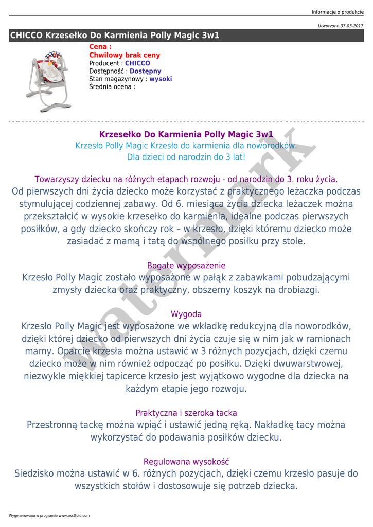 Informacje o produkcie Utworzono 07-03-2017 CHICCO Krzesełko Do Karmienia Polly Magic 3w1 Cena : Chwilowy brak ceny Producent : CHICCO Dostępność : Dostępny Stan magazynowy : wysoki Średnia ocena : er m ar k Krzesełko Do Karmienia Polly Magic 3w1 Krzesło Polly Magic Krzesło do karmienia dla noworodków. Dla dzieci od narodzin do 3 lat! Towarzyszy dziecku na różnych etapach rozwoju - od narodzin do 3. roku życia. Od pierwszych dni życia dziecko może korzystać z praktycznego leżaczka podczas stymulującej codziennej zabawy. Od 6. miesiąca życia dziecka leżaczek można przekształcić w wysokie krzesełko do karmienia, idealne podczas pierwszych posiłków, a gdy dziecko skończy rok – w krzesło, dzięki któremu dziecko może zasiadać z mamą i tatą do wspólnego posiłku przy stole. Bogate wyposażenie at Krzesło Polly Magic zostało wyposażone w pałąk z zabawkami pobudzającymi zmysły dziecka oraz praktyczny, obszerny koszyk na drobiazgi. Wygoda w Krzesło Polly Magic jest wyposażone we wkładkę redukcyjną dla noworodków, dzięki której dziecko od pierwszych dni życia czuje się w nim jak w ramionach mamy. Oparcie krzesła można ustawić w 3 różnych pozycjach, dzięki czemu dziecko może w nim również odpocząć po posiłku. Dzięki dwuwarstwowej, niezwykle miękkiej tapicerce krzesło jest wyjątkowo wygodne dla dziecka na każdym etapie jego rozwoju. Praktyczna i szeroka tacka Przestronną tackę można wpiąć i ustawić jedną ręką. Nakładkę tacy można wykorzystać do podawania posiłków dziecku. Regulowana wysokość Siedzisko można ustawić w 6. różnych pozycjach, dzięki czemu krzesło pasuje do wszystkich stołów i dostosowuje się potrzeb dziecka. Wygenerowano w programie www.oscGold.com Kompaktowość Krzesło Polly Magic łatwo się składa i zajmuje bardzo mało miejsca. Po złożeniu można je z łatwością przechowywać w pozycji pionowej. Dostępne opcje CHICCO Krzesełko Do Karmienia Polly Magic 3w1 w at er m ar k » CHICCO: MIRAGE pm3w1, COCOA pm3w1, AQUARELLE pm3w1, GRAPHITE pm3w1, LILLA pm3w1, PAPRIKA pm3w1.