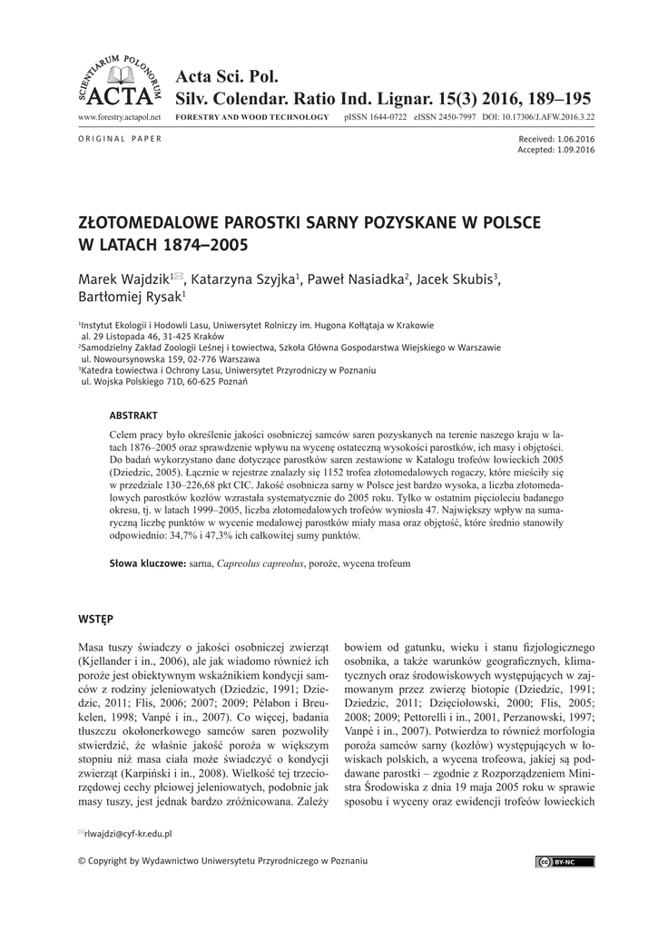 SC I E N TI UM P O L O R NO AR UM ACTA www.forestry.actapol.net Acta Sci. Pol. Silv. Colendar. Ratio Ind. Lignar. 15(3) 2016, 189–195 FORESTRY AND WOOD TECHNOLOGY pISSN 1644-0722 eISSN 2450-7997 DOI: 10.17306/J.AFW.2016.3.22 ORIGINAL PAPER Received: 1.06.2016 Accepted: 1.09.2016 ZŁOTOMEDALOWE PAROSTKI SARNY POZYSKANE W POLSCE W LATACH 1874–2005 Marek Wajdzik1, Katarzyna Szyjka1, Paweł Nasiadka2, Jacek Skubis3, Bartłomiej Rysak1 1 Instytut Ekologii i Hodowli Lasu, Uniwersytet Rolniczy im. Hugona Kołłątaja w Krakowie al. 29 Listopada 46, 31-425 Kraków 2 Samodzielny Zakład Zoologii Leśnej i Łowiectwa, Szkoła Główna Gospodarstwa Wiejskiego w Warszawie ul. Nowoursynowska 159, 02-776 Warszawa 3 Katedra Łowiectwa i Ochrony Lasu, Uniwersytet Przyrodniczy w Poznaniu ul. Wojska Polskiego 71D, 60-625 Poznań ABSTRAKT Celem pracy było określenie jakości osobniczej samców saren pozyskanych na terenie naszego kraju w latach 1876–2005 oraz sprawdzenie wpływu na wycenę ostateczną wysokości parostków, ich masy i objętości. Do badań wykorzystano dane dotyczące parostków saren zestawione w Katalogu trofeów łowieckich 2005 (Dziedzic, 2005). Łącznie w rejestrze znalazły się 1152 trofea złotomedalowych rogaczy, które mieściły się w przedziale 130–226,68 pkt CIC. Jakość osobnicza sarny w Polsce jest bardzo wysoka, a liczba złotomedalowych parostków kozłów wzrastała systematycznie do 2005 roku. Tylko w ostatnim pięcioleciu badanego okresu, tj. w latach 1999–2005, liczba złotomedalowych trofeów wyniosła 47. Największy wpływ na sumaryczną liczbę punktów w wycenie medalowej parostków miały masa oraz objętość, które średnio stanowiły odpowiednio: 34,7% i 47,3% ich całkowitej sumy punktów. Słowa kluczowe: sarna, Capreolus capreolus, poroże, wycena trofeum WSTĘP Masa tuszy świadczy o jakości osobniczej zwierząt (Kjellander i in., 2006), ale jak wiadomo również ich poroże jest obiektywnym wskaźnikiem kondycji samców z rodziny jeleniowatych (Dziedzic, 1991; Dziedzic, 2011; Flis, 2006; 2007; 2009; Pélabon i Breukelen, 1998; Vanpé i in., 2007). Co więcej, badania tłuszczu okołonerkowego samców saren pozwoliły stwierdzić, że właśnie jakość poroża w większym stopniu niż masa ciała może świadczyć o kondycji zwierząt (Karpiński i in., 2008). Wielkość tej trzeciorzędowej cechy płciowej jeleniowatych, podobnie jak masy tuszy, jest jednak bardzo zróżnicowana. Zależy  bowiem od gatunku, wieku i stanu fizjologicznego osobnika, a także warunków geograficznych, klimatycznych oraz środowiskowych występujących w zajmowanym przez zwierzę biotopie (Dziedzic, 1991; Dziedzic, 2011; Dzięciołowski, 2000; Flis, 2005; 2008; 2009; Pettorelli i in., 2001, Perzanowski, 1997; Vanpé i in., 2007). Potwierdza to również morfologia poroża samców sarny (kozłów) występujących w łowiskach polskich, a wycena trofeowa, jakiej są poddawane parostki – zgodnie z Rozporządzeniem Ministra Środowiska z dnia 19 maja 2005 roku w sprawie sposobu i wyceny oraz ewidencji trofeów łowieckich [email protected] © Copyright by Wydawnictwo Uniwersytetu Przyrodniczego w Poznaniu Wajdzik, M., Szyjka, K., Nasiadka, P., Skubis, J., Rysak, B. (2016). Złotomedalowe parostki sarny pozyskane w Polsce w latach 1874–2005. Acta Sci. Pol. Silv. Colendar. Ratio Ind. Lignar., 15(3), 189–195. DOI: 10.17306/J.AFW.2016.3.22 (Dz.U. 2005, nr 96, poz. 820) – pozwala na szczegółową analizę ich cech biometrycznych. Celem pracy było określenie jakości osobniczej samców saren pozyskanych na terenie naszego kraju w latach 1876–2005 na podstawie analizy parostków złotomedalowych oraz sprawdzenie wpływu na wycenę ostateczną: wysokości parostków, ich masy i objętości, rozłogi oraz tzw. punktów dodatkowych. METODYKA BADAŃ Do przeprowadzenia analiz wykorzystano dane dotyczące parostków saren pozyskanych na terenie naszego kraju w latach 1874–2005, które zestawiono w Katalogu trofeów łowieckich 2005 (Dziedzic, 2005). Wyceny wszystkich zamieszczonych w katalogu parostków przeprowadzono na podstawie formuły wyceny trofeów łowieckich, opracowanej przez Międzynarodową Radę Łowiecką (CIC). Zgodnie z wytycznymi CIC na wycenę ostateczną parostków składały się elementy pomiarowe: (1) długość tyk – mierzona od dolnej krawędzi róży wzdłuż osi tyki do czubka grotu (rys. 1) z dokładnością do 1 mm, masa poroża określona z dokładnością do 1 g, (2) rozłoga – największy odstęp pomiędzy wewnętrznymi brzegami tyk, mierzona prostopadle do osi czaszki z dokładnością do 1 mm (rys. 1) i wyrażona jako wartość punktowa (0–4), (3) objętość poroża – różnica między masą parostków zważonych w powietrzu a zanurzonych w wodzie do dolnej krawędzi róży oraz punkty dodatkowe (za tzw. piękno) przyznawane za barwę, uperlenie, róże, zakończenie i rozwój odnóg oraz ukształtowanie parostków (Stachowiak, 1994). Łącznie w rejestrze znalazły się 1152 trofea złotomedalowych rogaczy, które mieściły się w przedziale 130– 226,68 pkt CIC. Dla 329 trofeów nie było pełnych danych pomiarowych i dlatego zostały one pominięte w niektórych analizach. Dla 85 parostków brakowało danych dotyczących miejsca ich pozyskania, co również zadecydowało o niewłączeniu ich do analiz. Wyniki pomiarów zestawiono w szeregach rozdzielczych i dla każdego z nich wyliczono wartości średnie (xśr), odchylenie standardowe (SD), współczynnik zmienności (V) oraz ustalono wartości minimalne (min) i maksymalne (max) pomierzonych cech. 190 WYNIKI Średnie długości tyk u wszystkich rogaczy osiągały około 26 cm. Najdłuższe tyki (26,7 cm) miały rogacze, które w wycenie ostatecznej określono na 170–189,99 pkt. Natomiast najkrótszymi (25,19 cm) charakteryzowały się kozły, które w wycenie medalowej zdobyły 130–139,99 pkt (rys. 1). Odchylenie standardowe wzrastało wraz z sumaryczną licz