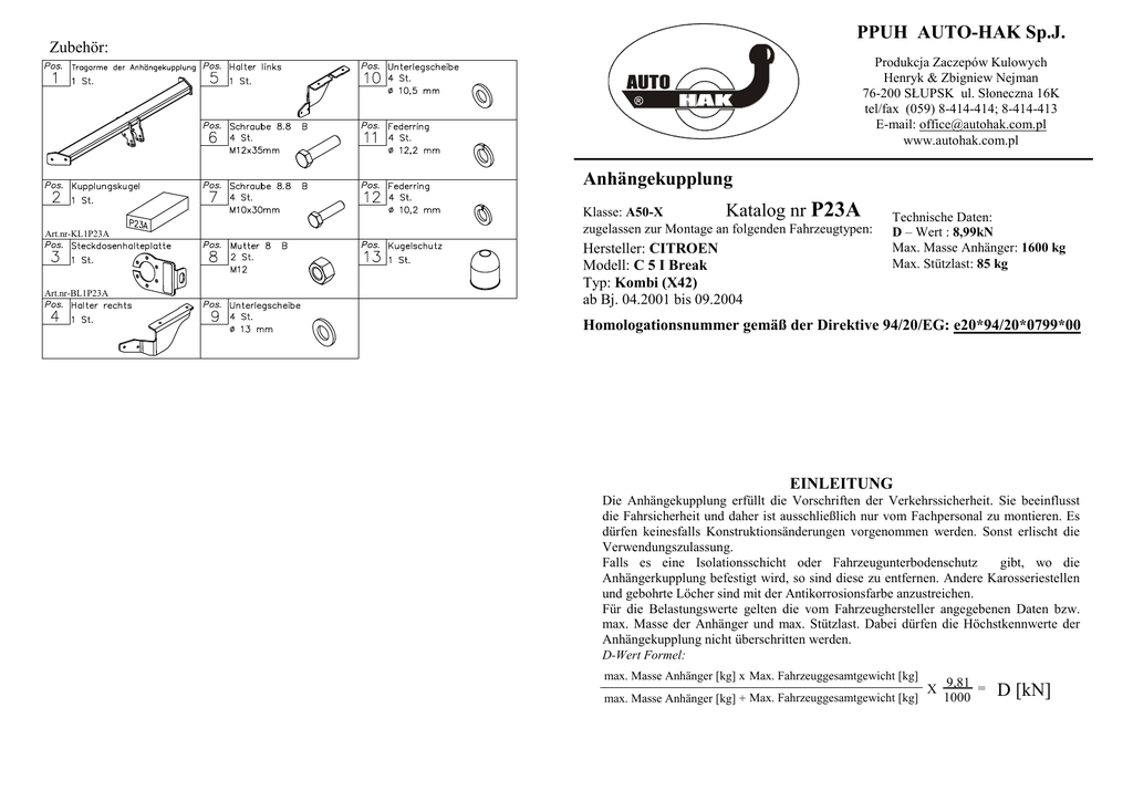 PPUH AUTO-HAK Sp.J. Zubehör: Produkcja Zaczepów Kulowych Henryk & Zbigniew Nejman 76-200 SŁUPSK ul. Słoneczna 16K tel/fax (059) 8-414-414; 8-414-413 E-mail: [email protected] www.autohak.com.pl Anhängekupplung P23A Art.nr-KL1P23A Art.nr-BL1P23A Klasse: A50-X Katalog nr zugelassen zur Montage an folgenden Fahrzeugtypen: Hersteller: CITROEN Modell: C 5 I Break Typ: Kombi (X42) ab Bj. 04.2001 bis 09.2004 Technische Daten: D – Wert : 8,99kN Max. Masse Anhänger: 1600 kg Max. Stützlast: 85 kg Homologationsnummer gemäß der Direktive 94/20/EG: e20*94/20*0799*00 EINLEITUNG Die Anhängekupplung erfüllt die Vorschriften der Verkehrssicherheit. Sie beeinflusst die Fahrsicherheit und daher ist ausschließlich nur vom Fachpersonal zu montieren. Es dürfen keinesfalls Konstruktionsänderungen vorgenommen werden. Sonst erlischt die Verwendungszulassung. Falls es eine Isolationsschicht oder Fahrzeugunterbodenschutz gibt, wo die Anhängerkupplung befestigt wird, so sind diese zu entfernen. Andere Karosseriestellen und gebohrte Löcher sind mit der Antikorrosionsfarbe anzustreichen. Für die Belastungswerte gelten die vom Fahrzeughersteller angegebenen Daten bzw. max. Masse der Anhänger und max. Stützlast. Dabei dürfen die Höchstkennwerte der Anhängekupplung nicht überschritten werden. D-Wert Formel: max. Masse Anhänger [kg] x Max. Fahrzeuggesamtgewicht [kg] max. Masse Anhänger [kg] + Max. Fahrzeuggesamtgewicht [kg] X 9,81 = 1000 D [kN] MONTAGE - und BETRIEBSANLEITUNG DER ANHÄNGEKUPPLUNG Anbauanleitung 1. 5 2. 6 3. 7 4. 1 5. 6. 4 7 7. Den Kunststoffspoiler vom unteren Teil der Stoßstange abschrauben. (er wird nicht mehr montiert). Die Halter 4 u. 5 an den originalen vorgesehenen Stellen mit den Schrauben M10x30mm (Pos. 7) verschrauben. Die Tragarme der Anhängerkupplung (Pos.1) zwischen die vorher angebrachten Halter 4 u. 5 setzen und mit den Schrauben M12x35mm (Pos.6) verschrauben. Die Kupplungskugel gemäß der Anbauanleitung der Anhängekupplung mit dem schnelldemontierbaren Aufsatz anbringen. Den Steckdosenhalter (Pos. 3) mit verschrauben. Alle Schrauben gemäß den Angaben in der Tabelle festziehen. Die Elektroinstallation gemäß der Bedienungsanleitung des Herstellers anschließen. Falls nötig, den durch die Montage beschädigten Farbanstrich an der Anhängerkupplung ausbessern. 3 7 2 6 Die Anhängekupplung (Katalognummer P23A) ist für folgende Fahrzeugtypen zugelassen: CITROEN C5 I BREAK, KOMBI (X42), ab Bj. 04.2001 bis 09.2004, dient zum Ziehen der Anhänger mit der Gesamtlast von 1600 kg und der Kugelstützlast von max.85 kg. VON DEM HERSTELLER Die Zuverlässigkeit der Anhängekupplung ist jedoch auch von der ordnungsgemäßen Montage und der richtigen Nutzung abhängig. Daher werden Sie gebeten, sorgfältig die folgende Montageanleitung zu lesen und sich an die entsprechenden Anweisungen zu beachten. Die Anhängekupplung muss an den vom Fahrzeughersteller vorgeschriebenen Befestigungsstellen montiert werden. Drehmomente für Schrauben und Muttern 8.8: M6 - 11 Nm M 8 - 25 Nm M 10 - 50 Nm M 12 - 87 Nm M 14 - 138 Nm M16 - 210 Nm ACHTUNG Nach dem Anbau der Anhängekupplung sind die nationalen Vorschriften zur Anbauabnahme und zur Änderung der Fahrzeugpapiere zu beachten. Das Fahrzeug sollte mit seitlichen Blinkern und Rückspiegeln, deren Abstand mindestens der Anhängerbreite entspricht, ausgestattet werden. Alle Befestigungsschrauben sind nach ca. 1 000 km Anhängerbetrieb zu prüfen und nachzuziehen. Die Kugel der Anhängekupplung ist sauber zu halten und zu fetten. (D) (CZ) (F) (GB) (PL) (SK) Der Freiraum nach Anhang VII, Abbildung 30 der Richtlinie 94/20/EG ist zu gewährleisten. Volný prostor ve smyslu Přílohy VII,obr. 30 Směrnice č. 94/20/EG musí být zaručen. L´espace libre doit être garanti conformément à ľannexe VII, illustracion 30 de la directive 94/20/ CE. The clearance specified in apendix VII, diagram 30 of guideline 94/20/EC must be guaranteed. Zagwarantować swobodną przestrzeń zgodnie z załącznikiem VII, rysunek 30 dyrektywy 94/20/CE. Volný priestor v zmysle Prílohy VII, obr. 30 Smernice 94/20/EC musí byť zaručená. (D) (CZ) (F) (GB) (PL) (SK) * bei zulässigem Gesamtgewicht des Fahrzeuges * při celkové přípustné hmotnosti vozidla * pour poids total en charge autorizé du véhicule * at gross vehicle weight rating * przy dopuszczalnym ciężarze całkowitym pojazdu * pri celkovej prípustnej hmotnosti vozidla FITTING INSTRUCTION Clamp mark in acc. with ISO PN 1 L 2 + 3 31 4 R 5 58R 6 54 7 58L Fitting instructions Cables joining Left directional lights Rear fog lights Ground Right directional lights Right side parking lights Stoplights Left side parking lights 1. Disassemble the plastic part of the bumper (this part is not used any more) 2. Fix the side brackets (pos. 4 and 5) through the original holes using bolts M10x35mm pos. 7 (do it loosely) 3. Slide the bar of towbar (pos. 1) between fixed side brackets then fix it using bolts M12x35mm (pos. 6). 4. Tighten all nuts and bolts according to the torque shown in the table 5. Fix body of the automat and place tow-ball according to supplied instruction. Note! Remember to place socket plate (pos. 3) as shown on the drawing. 6. Connect the electric wires according to the instructions of the car. 7. Complete the paint cover of towbar (during the mounting paint cover could be destroyed). 5 6 7 1 4 7 3 7 2 6 This towbar is designed to assembly in following cars: CITROEN C5 I Break, Estate (X42) produced since 04.2001 till 09.2004, catalogue number P23A and is prepared to tow trailers max total weight 1600 kg and max vertical load 85 kg. Torque settings for nuts and bolts (8,8): M6 - 11 Nm M8 - 25 Nm M10 - 50 Nm M12 - 87 Nm M14 - 138 Nm M16 - 210 Nm From manufacturer NOTE Thank you for buying our product. Their reliability has been confirmed in many tests. Reliability of towbar depends also on correct assembly and right operation. For this reasons we kindly ask to read carefully this instr