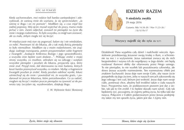 Bóg mi pomoże Kiedy zachorowałam, moi rodzice byli bardzo zaniepokojeni i zdecydowali, że zaniosą mnie do szamana. Ja się sprzeciwiałam: „Ja wierzę w Boga i on mi pomoże”. Modliłam się, a czas mijał bez żadnej poprawy. Mój ojciec musiał wyjechać do pracy, mama miała jechać z nim. Zanim odjechał, zostawił mi pieniądze na życie dla mnie i mojego rodzeństwa. To było wszystko, co mógł nam zostawić, ale za mało, żebym mogła też się leczyć. W międzyczasie mój stan się pogorszył, bałam się i nie wiedziałam, co robić. Powinnam iść do lekarza, ale z tak małą ilością pieniędzy to było niemożliwe. Modliłam się z moim rodzeństwem, nie znajdując żadnego rozwiązania, potem przypomniałam sobie fragment z Ewangelii: „Szukajcie Królestwa Bożego i jego sprawiedliwości, a wszystko inne będzie wam dodane...”. Próbując zrobić z mojej strony wszystko, co możliwe, zebrałam się na odwagę i wzięłam wszystkie pieniądze i poszłam do lekarza, przyjaciela ojca, który mnie znał. Przyjął mnie, dał skierowania na inne badania, których koszt bardzo przewyższał wszystko, co miałam. Myśląc o fragmencie Ewangelii poszłam je zrobić. Kiedy poszłam odebrać wyniki, lekarz uśmiechnął się do mnie i powiedział mi, że wszystko gratis, i podarował mi jeszcze lekarstwa, które potrzebowałam. Co za radość, mogłam się leczyć i miałam jeszcze pieniądze na żywność aż do powrotu taty. Leczyłam się, wyzdrowiałam, dziękuję Bogu. E. W. Wybrzeże Kości Słoniowej Życie, które staje się słowem Idziemy razem 9 niedziela zwykła 29 maja 2016 Czytania: R dz 14,18–20 / 1Kor 11,23–26 / / Łk 9,11b-17 Wszyscy najedli się do syta (Łk 9,17) Działalność Pana wypełnia cały dzień i nadchodzi wieczór. Apostołowie przedstawiają Jezusowi swoją troskę o tłum, o schronienie na noc i o wyżywienie. Jezus natomiast zwraca się do nich bezpośrednio i wzywa ich do współpracy w Jego dziele: oni będą rozdawać tłumowi obfity dar ofiarowany przez Niego samego. To nie pieniądze, to nie wysiłek lub poszukiwania człowieka, ale słowo Jezusa uczyniło rozmnożenie. Ten rozmnożony chleb jest znakiem Eucharystii: Jezus daje nam swoje Ciało, aby nasze życie przepełniło się Jego życiem, żeby w naszych sercach zakorzeniła się Jego odwaga i ten cud, którym jest wolność. Jezus daje nam swoje ciało, ponieważ chce, abyśmy byli troskliwi także o ciała naszych braci. Przypomina nam, że podstawowym prawem jest dar z siebie, tak jak to On zrobił. I to będzie dawało nam sytość. Gdy tak będziemy żyć, poczujemy, że żyjemy pełnią życia, bo tylko taki dar nasyca. Połączeni z Ciałem podarowanym przez Jezusa podejmijmy także my ten sposób życia, jakim jest dar. I żyjmy nim. Słowo, które staje się życiem