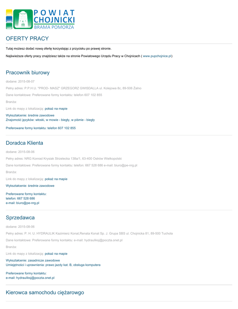Najświeższe oferty pracy znajdziesz także na stronie Powiatowego Urzędu Pracy w Chojnicach ( www.pupchojnice.pl)