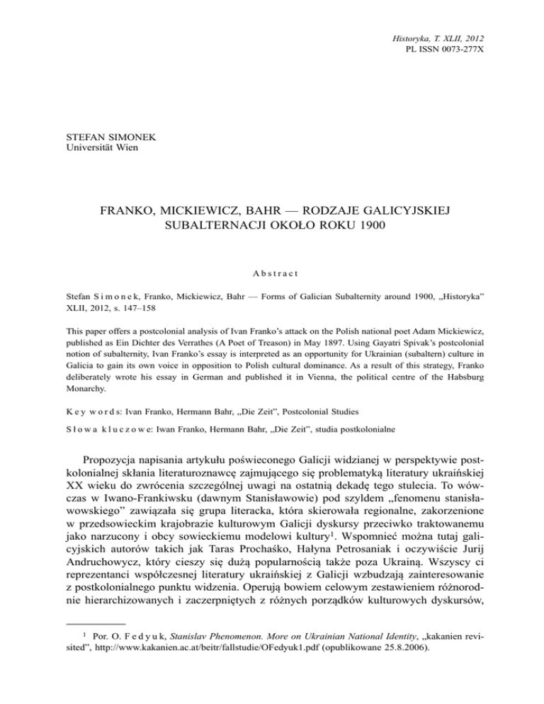 Historyka, T. XLII, 2012 PL ISSN 0073-277X STEFAN SIMONEK Universität Wien FRANKO, MICKIEWICZ, BAHR — RODZAJE GALICYJSKIEJ SUBALTERNACJI OKOŁO ROKU 1900 Abstract Stefan S i m o n e k, Franko, Mickiewicz, Bahr — Forms of Galician Subalternity around 1900, „Historyka” XLII, 2012, s. 147–158 This paper offers a postcolonial analysis of Ivan Franko’s attack on the Polish national poet Adam Mickiewicz, published as Ein Dichter des Verrathes (A Poet of Treason) in May 1897. Using Gayatri Spivak’s postcolonial notion of subalternity, Ivan Franko’s essay is interpreted as an opportunity for Ukrainian (subaltern) culture in Galicia to gain its own voice in opposition to Polish cultural dominance. As a result of this strategy, Franko deliberately wrote his essay in German and published it in Vienna, the political centre of the Habsburg Monarchy. K e y w o r d s: Ivan Franko, Hermann Bahr, „Die Zeit”, Postcolonial Studies S ł o w a k l u c z o w e: Iwan Franko, Hermann Bahr, „Die Zeit”, studia postkolonialne Propozycja napisania artykułu poświeconego Galicji widzianej w perspektywie postkolonialnej skłania literaturoznawcę zajmującego się problematyką literatury ukraińskiej XX wieku do zwrócenia szczególnej uwagi na ostatnią dekadę tego stulecia. To wówczas w Iwano-Frankiwsku (dawnym Stanisławowie) pod szyldem „fenomenu stanisławowskiego” zawiązała się grupa literacka, która skierowała regionalne, zakorzenione w przedsowieckim krajobrazie kulturowym Galicji dyskursy przeciwko traktowanemu jako narzucony i obcy sowieckiemu modelowi kultury1. Wspomnieć można tutaj galicyjskich autorów takich jak Taras Prochaśko, Hałyna Petrosaniak i oczywiście Jurij Andruchowycz, który cieszy się dużą popularnością także poza Ukrainą. Wszyscy ci reprezentanci współczesnej literatury ukraińskiej z Galicji wzbudzają zainteresowanie z postkolonialnego punktu widzenia. Operują bowiem celowym zestawieniem różnorodnie hierarchizowanych i zaczerpniętych z różnych porządków kulturowych dyskursów, 1 Por. O. F e d y u k, Stanislav Phenomenon. More on Ukrainian National Identity, „kakanien revisited”, http://www.kakanien.ac.at/beitr/fallstudie/OFedyuk1.pdf (opublikowane 25.8.2006). 148 Stefan Simonek jak na przykład tych związanych z Monarchią Habsburską, która funkcjonalizowana jest m.in. przez Andruchowycza jako przeciwwaga do jednorodnego dyskursu sowieckiego w Galicji2. Jednak ta spowodowana upadkiem Związku Radzieckiego postsowiecka konfiguracja kulturowa Galicji nie pozostaje w kulturowo-historycznej próżni, lecz jest związana w niektórych istotnych punktach (jak w reakcji na wzorce kulturowej dominacji i hierarchizacji) z wzorcami przedsowieckimi, o których poniżej przynajmniej pośrednio będzie mowa. Na początku dwudziestego wieku punktami odniesienia dla ukraińskich autorów w Galicji były kultury polska i niemieckojęzyczna, nie zaś rosyjska. Postrzegano je zarówno jako wartościowe i powiązane z ogólnoeuropejskim rozwojem kulturowym, jak i ograniczające i protekcjonalne. Owe kultury prezentowano również w ukraińskich szkołach Galicji jako model do naśladowania, co automatycznie uruchomiło procesy hierarchizacji kulturowej, w wyniku których (własnej) kulturze i literaturze ukraińskiej wyznaczona została wyłącznie pozycja podporządkowanego (subaltern). Ostatecznie dla ukraińskich autorów z Galicji takie procesy hierarchizowania były nie tylko intensywnie odczuwalne jako zmuszające do poruszania się pomiędzy kilkoma językami (ukraińskim, polskim i niemieckim) i związanymi z nimi kulturami. Jednocześnie sytuacja taka nie stanowiła dla nich wyjątku, lecz raczej normę. Polski Kraków i Wiedeń jako stolica Monarchii Naddunajskiej oraz związane z tymi miastami instytucje kulturalne (czasopisma, biblioteki, opery, teatry, muzea), a także będące pod wpływem modernizmu ruchy odnowicielskie jak Młody Wiedeń czy Młoda Polska, miały dla pierwszoplanowych ukraińskich autorów — jak Vasyl’ Stefanyk czy Bohdan Lepkyj — szczególne, również ugruntowane biograficznie znaczenie. Owa wielobiegunowość kulturowych odniesień w szczególny sposób dotyczy Iwana Franki, zapewne jednego z najważniejszych galicyjskich autorów, z uwagi na edukację, jaką odebrał (studia slawistyczne w Wiedniu3), a jeszcze bardziej poprzez współpracę z licznymi polskimi i niemieckojęzycznymi czasopismami. W nich to opublikował nie po ukraińsku, lecz po polsku albo po niemiecku wiele tekstów beletrystycznych, eseistycznych i naukowych, które często były tłumaczone przez niego potem na jeden z tych trzech języków4. Spośród dużej liczby niemieckojęzycznych czasopism, w których Franko był obecny poprzez osobiście przez niego przetłumaczone na język niemiecki artykuły, niewątpliwie należy na pierwszym miejscu wymienić założony w Wiedniu jesienią 1894 2 Na temat Andruchowycza z perspektywy postkolonialnej por. M. A n d r y c z y k, Three Posts in the Center of Europe: Postmodern Characteristics in Yuri Andrukhovych’s Post-colonial Prose, [w:] Ukraine at a Crossroads, red. N. H a y o z, A.N. L u s h n y c k y, Bern i in. 2005, s. 233–252. 3 Por. w tej kwestii G. W y t r z e n s, Ivan Franko als Student und Doktor der Wiener Universität, „Wiener Slavistisches Jahrbuch” 1960, t. 8, s. 228–241. 4 Por. odnośnie do współpracy Franki z niemieckojęzycznymi czasopismami (wybór): Я. П о г р е б е н н и к, Невідомий німецький переклад „Каменярів” І. Франка, „Радянське літературознавство” 1980, nr 9, s. 73–76; G. W y t r z e n s, Zum literarischen Schaffen Ivan Frankos in deutscher Sprache, „Wiener Slavistisches Jahrbuch” 1991, t. 37, s. 103–112; Л. Р у д н и ц ь к и й, Трьома мовами для трьох культур, „Слово і час” 1996, nr 10, s. 70–74