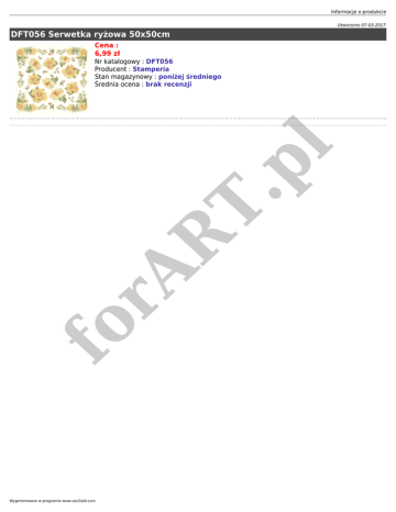 Informacje o produkcie Utworzono 07-03-2017 DFT056 Serwetka ryżowa 50x50cm Cena : 6,99 zł fo rA R T. pl Nr katalogowy : DFT056 Producent : Stamperia Stan magazynowy : poniżej średniego Średnia ocena : brak recenzji Wygenerowano w programie www.oscGold.com