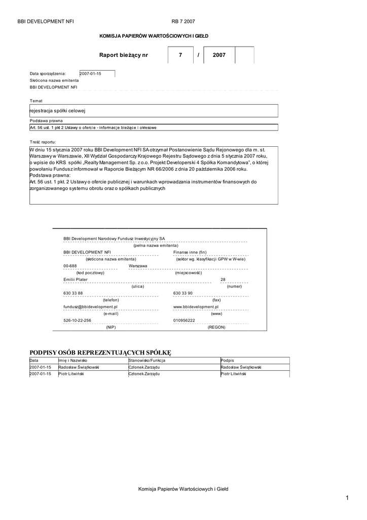 BBI DEVELOPMENT NFI RB 7 2007 KOMISJA PAPIERÓW WARTOŚCIOWYCH I GIEŁD Raport bieŜący nr 7 / 2007 2007-01-15 Data sporządzenia: Skrócona nazwa emitenta BBI DEVELOPMENT NFI Temat rejestracja spółki celowej Podstawa prawna Treść raportu: W dniu 15 stycznia 2007 roku BBI Development NFI SA otrzymał Postanowienie Sądu Rejonowego dla m. st. Warszawy w Warszawie, XII Wydział Gospodarczy Krajowego Rejestru Sądowego z dnia 5 stycznia 2007 roku, o wpisie do KRS spółki „Realty Management Sp. z o.o. Projekt Developerski 4 Spółka Komandytowa”, o której powołaniu Fundusz informował w Raporcie BieŜącym NR 66/2006 z dnia 20 października 2006 roku. Podstawa prawna: Art. 56 ust. 1 pkt. 2 Ustawy o ofercie publicznej i warunkach wprowadzania instrumentów finansowych do zorganizowanego systemu obrotu oraz o spółkach publicznych BBI Development Narodowy Fundusz Inwestyc yjny SA (pełna nazwa emitenta) BBI DEVELOPMENT NFI Finanse inne (fin) (skróc ona nazwa emitenta) 00-688 (sektor wg. klasyfikacji GPW w W-wie) Warszawa (kod pocztowy) (miejscowość) Emilii Plater 28 (ulica) 630 33 88 (numer) 630 33 90 (telefon) (fax) [email protected] www.bbidevelopment.pl (e-mail) (www) 526-10-22-256 010956222 (NIP) (REGON) PODPISY OSÓB REPREZENTUJĄCYCH SPÓŁKĘ Data Imię i Nazwisko Stanowisko/Funkc ja Podpis 2007-01-15 Radosław Świątkowski Członek Zarządu Radosław Świątkowski 2007-01-15 Piotr Litwiński Członek Zarządu Piotr Litwiński Komisja Papierów Wartościowych i Giełd 1