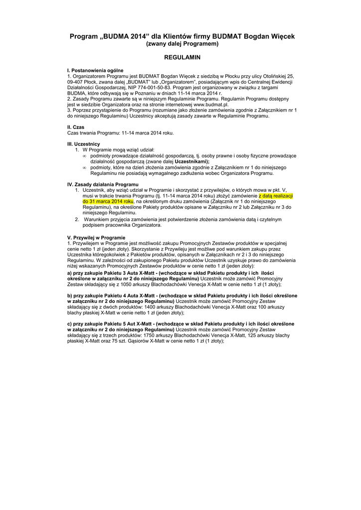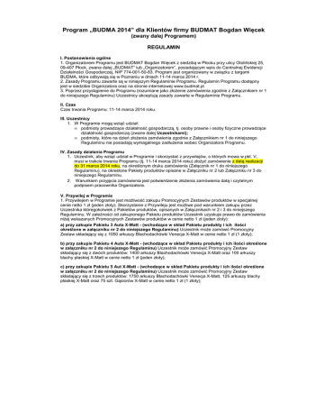 Program „BUDMA 2014” dla Klientów firmy BUDMAT Bogdan Więcek (zwany dalej Programem) REGULAMIN I. Postanowienia ogólne 1. Organizatorem Programu jest BUDMAT Bogdan Więcek z siedzibą w Płocku przy ulicy Otolińskiej 25, 09-407 Płock, zwana dalej „BUDMAT” lub „Organizatorem”, posiadającym wpis do Centralnej Ewidencji Działalności Gospodarczej, NIP 774-001-50-83. Program jest organizowany w związku z targami BUDMA, które odbywają się w Poznaniu w dniach 11-14 marca 2014 r. 2. Zasady Programu zawarte są w niniejszym Regulaminie Programu. Regulamin Programu dostępny jest w siedzibie Organizatora oraz na stronie internetowej www.budmat.pl. 3. Poprzez przystąpienie do Programu (rozumiane jako złożenie zamówienia zgodnie z Załącznikiem nr 1 do niniejszego Regulaminu) Uczestnicy akceptują zasady zawarte w Regulaminie Programu. II. Czas Czas trwania Programu: 11-14 marca 2014 roku. III. Uczestnicy 1. W Programie mogą wziąć udział: • podmioty prowadzące działalność gospodarczą, tj. osoby prawne i osoby fizyczne prowadzące działalność gospodarczą (zwane dalej Uczestnikami); • podmioty, które na dzień złożenia zamówienia zgodnie z Załącznikiem nr 1 do niniejszego Regulaminu nie posiadają wymagalnego zadłużenia wobec Organizatora Programu. IV. Zasady działania Programu 1. Uczestnik, aby wziąć udział w Programie i skorzystać z przywilejów, o których mowa w pkt. V, musi w trakcie trwania Programu (tj. 11-14 marca 2014 roku) złożyć zamówienie z datą realizacji do 31 marca 2014 roku, na określonym druku zamówienia (Załącznik nr 1 do niniejszego Regulaminu), na określone Pakiety produktów opisane w Załączniku nr 2 lub Załączniku nr 3 do niniejszego Regulaminu. 2. Warunkiem przyjęcia zamówienia jest potwierdzenie złożenia zamówienia datą i czytelnym podpisem pracownika Organizatora. V. Przywilej w Programie 1. Przywilejem w Programie jest możliwość zakupu Promocyjnych Zestawów produktów w specjalnej cenie netto 1 zł (jeden złoty). Skorzystanie z Przywileju jest możliwe pod warunkiem zakupu przez Uczestnika któregokolwiek z Pakietów produktów, opisanych w Załącznikach nr 2 i 3 do niniejszego Regulaminu. W zależności od zakupionego Pakietu produktów Uczestnik uzyskuje prawo do zamówienia niżej wskazanych Promocyjnych Zestawów produktów w cenie netto 1 zł (jeden zloty): a) przy zakupie Pakietu 3 Auta X-Matt - (wchodzące w skład Pakietu produkty i ich ilości określone w załączniku nr 2 do niniejszego Regulaminu) Uczestnik może zamówić Promocyjny Zestaw składający się z 1050 arkuszy Blachodachówki Venecja X-Matt w cenie netto 1 zł (1 złoty); b) przy zakupie Pakietu 4 Auta X-Matt - (wchodzące w skład Pakietu produkty i ich ilości określone w załączniku nr 2 do niniejszego Regulaminu) Uczestnik może zamówić Promocyjny Zestaw składający się z dwóch produktów: 1400 arkuszy Blachodachówki Venecja X-Matt oraz 100 arkuszy blachy płaskiej X-Matt w cenie netto 1 zł (jeden złoty); c) przy zakupie Pakietu 5 Aut X-Matt - (wchodzące w skład Pakietu produkty i ich ilości określone w załączniku nr 2 do niniejszego Regulaminu) Uczestnik może zamówić Promocyjny Zestaw składający się z trzech produktów: 1750 arkuszy Blachodachówki Venecja X-Matt, 125 arkuszy blachy płaskiej X-Matt oraz 75 szt. Gąsiorów X-Matt w cenie netto 1 zł (1 złoty); d) przy zakupie Pakietu 3 Auta D-Matt - (wchodzące w skład Pakietu produkty i ich ilości określone w załączniku nr 3 do niniejszego Regulaminu) Uczestnik może zamówić Promocyjny Zestaw składający się z 1050 arkuszy Blachodachówki Venecja D-Matt w cenie netto 1 zł (jeden złoty); e) przy zakupie Pakietu 4 Auta D-Matt - (wchodzące w skład Pakietu produkty i ich ilości określone w załączniku nr 3 do niniejszego Regulaminu) Uczestnik może zamówić Promocyjny Zestaw składający się z dwóch produktów: 1400 arkuszy Blachodachówki Venecja D-Matt oraz 100 arkuszy blachy płaskiej D-Matt w cenie netto 1 zł (jeden złoty); f) przy zakupie Pakietu 5 Aut D-Matt - (wchodzące w skład Pakietu produkty i ich ilości określone w załączniku nr 3 do niniejszego Regulaminu) Uczestnik może zamówić Promocyjny Zestaw składający się z trzech produktów: 1750 arkuszy Blachodachówki Venecja D-Matt, 125 arkuszy blachy płaskiej D-Matt oraz 75 szt. Gąsiorów D-Matt w cenie netto 1 zł (jeden złoty). 2. Ceny produktów wchodzących w skład Pakietów, wskazanych w punkcie 1 ppkt a-f powyżej, zawarte są w cenniku stanowiącym Załącznik nr 4 do niniejszego Regulaminu. 3. Warunkiem uzyskania przez Uczestnika ceny netto 1 zł (jeden złoty) za Promocyjne Zestawy produktów, o których mowa w punkcie 1 ppkt a-f powyżej, jest terminowa zapłata za zakupiony przez Uczestnika Pakiet produktów, o których również mowa w punkcie 1 ppkt a-f powyżej. W przypadku braku terminowej zapłaty za zamówiony Pakiet produktów, Uczestnik będzie zobowiązany do zapłaty za zamówiony Promocyjny Zestaw produktów zgodnie z obowiązującym cennikiem Organizatora. 4. Reklamacje dotyczące Programu powinny zostać zgłoszone do Działu Obsługi Sprzedaży Organizatora najpóźniej do dnia 21 marca 2014. Reklamacje zgłoszone po upływie tego terminu nie będą przyjmowane. VI. Pozostałe warunki i regulacje prawne 1. Budmat ma wyłączne prawo interpretacji postanowień niniejszego Regulaminu oraz rozstrzygania sytuacji, których one nie przewidują. 2. Budmat zastrzega sobie prawo wprowadzenia w Regulaminie zmian, o których Uczestnicy zostaną poinformowani, poprzez umieszczenie informacji na stronie www.budmat.pl. 3. Wszelkie spory i roszczenia związane z Programem będą rozstrzygane przez sądy powszechne właściwe dla siedziby Organizatora. 4. W kwestiach nieuregulowanych niniejszym Regulaminem stosuje się obowiązujące przepisy prawa, w szczególności przepisy kodeksu cywilnego. Organizator Załącznik nr 2 do Programu „BUD