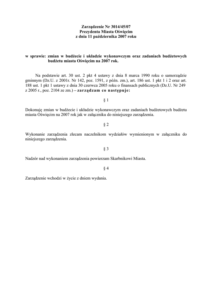 Zarządzenie Nr 3014/45/07 Prezydenta Miasta Oświęcim z dnia 11