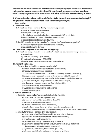 Istotne warunki zmówienia oraz dodatkowe informacje dotyczące zawartości składników związanych z wyceną poszczególnych robót określonych w „zaproszeniu do składania ofert” na wykonywanie robót w zasobach Olkuskiej Spółdzielni Mieszkaniowej w 2017r. I. Wykonanie załączników graficznych /kolorystyka elewacji wraz z opisem technologii / do zgłoszenia robót ociepleniowych ścian zewnętrznych budynku Cena za 1kpl. II. Ocieplenie ścian 1. Ocieplenie ścian - cena za 1 m2 powinna uwzględniać: a) montaż i demontaż rusztowań, b) styropian FS 15 gr. 10cm, c) 2 x siatka w warstwie zbrojącej na wysokości 3,0 m od dołu, d) tynk akrylowy gr. 2mm, różne kolory i struktura, e) demontaż i montaż rur spustowych, 2. Rozbiórka ociepleń z płyt „Acekol” – cena za 1 m2 powinna uwzględniać : a) wywóz i utylizację całości materiału z rozbiórki, b) uporządkowanie terenu. III. Ocieplenie stropodachów ostatnich kondygnacji 1. Ocieplenie stropodachów – cena za 1m2 ocieplonej powierzchni stropu powinna uwzględniać: a) grubość warstwy – ( śr.20 cm), b) materiał celulozowy „ ECOFIBER” c) dodatkowe kominki wentylacyjne stropodachu. IV. Remont balkonów. 1. Cena za 1m2 wylewki – powinna uwzględniać: a) skucie wylewki i usunięcie obróbek blacharskich, b) naprawa i uzupełnienie cokolika, c) częściowa wymiana - do 15 cm - skorodowanych nóżek balustrady, d) oczyszczenie i zabezpieczenie antykorozyjne nóżek balustrady, e) naprawa i uzupełnienie elementów żelbetowych płyt balkonowych, f) uzupełnienie tynku na połączeniach płyt balkonowych, g) wykonanie i montaż nowej obróbki blacharskiej, i) wykonanie izolacji płyty balkonu, j) wykonanie nowej wylewki na balkonie, k) wywiezienie gruzu. V. Roboty brukarskie 1. Chodniki – cena za 1m2 powierzchni chodnika /kostki/: a) rozebranie chodnika z płyt i obrzeży, b) transport materiałów z rozbiórki do ADM, c) wywóz gruzu i nadmiaru ziemi, d) ułożenie obrzeży na ławie betonowej, e) podbudowa tłuczniowa gr. 15cm na podsypce piaskowej, f) ułożenie kostki brukowej szarej i kolorowej gr. 6 cm na miale kamiennym. 2. Schody terenowe - cena za 1m2 powierzchni: a) rozebranie schodów / krawężniki, obrzeża, płytki, beton/, b) transport materiałów drobnych z rozbiórki do ADM, c) wywóz gruzu i nadmiaru ziemi, d) profilowanie skarpy i terenów przy schodach, e) ustawianie obrzeży bocznych 6x20 i w schodach 8x25 na ławach betonowych /obrzeża szare i kolorowe/, f) wykonanie podbudowy tłuczniowej gr. 15cm, g) ułożenie kostki brukowej szarej i kolorowej gr. 6 cm, h) wykonanie zjazdów i stopni z obrzeży kolorowych 8x25. /8x30/ na ławie bet. 3. Barierki ochronne i balustrady – cena za 1mb. a) pochwyt górny i słupki z rur Dn. wew. 32 mm, b) słupki Dn. wew. 25 mm, c) rozstaw słupków co 1,5 m, d) zabezpieczenie antykorozyjne, e) ustawienie i zabetonowanie. VI. Remonty kanalizacyjne – w/g kosztorysu powykonawczego. Roboty polegające na wymianie poziomów kanalizacji sanitarnej pod posadzkami piwnicy, na rury PCV Dn.150mm wraz z podejściami do kratek, przyborów i pionów. Występuje również czasami konieczność wymiany przykanalika. VII. Montaż stolarki okiennej , drzwiowej i witryn 1. Wymiana okna drewnianego na PCV: a) okno PCV 865x835 U białe, b) okno PCV 865x835 RU białe, c) okno PCV 1465x 835 dwudzielne R + RU białe, d) okno PCV 880 x 460 U, jednostronnie faktura kolorowa. Cena za 1szt winna uwzględniać: a) demontaż starego okna i parapetu zewnętrznego, b) montaż nowego okna, c) montaż parapetu zewnętrznego z zaślepkami / blacha ocynk. powlekana/, d) uzupełnienie, naprawa tynków i pomalowanie szpaletów. 2. Witryny aluminiowe do lokali użytkowych: a) Witryna AL. – stałe szklenie, b) Witryna z uchylnym oknem. Cena za 1 m2. z dostawą. 3. Drzwi stalowe do lokali użytkowych: a) cena za 1 m2 z dostawą, b) cena za 1 m2 z wymianą. VIII. Roboty blacharsko – dekarskie 1. Cena za 1m2 obróbek papą termozgrzewalną wierzchniego krycia gr. 5,2mm. wraz z przygotowaniem podłoża /kominy, ogniomury, gzymsy/. 2. Cena za 1m2 krycia dachu papą j/w. z przygotowaniem podłoża poprzez częściowe zrywanie, wyrównanie i zagruntowanie. 3. Według kosztorysu powykonawczego: - wymiana obróbek blacharskich - rynien - rur spustowych - oraz inne nie przewidziane prace IX. Malowanie klatek schodowych i elewacji 1. Malowanie klatek schodowych – cena za 1 kondygnację powinna obejmować: a) zeskrobanie, zmycie, gruntowanie i przygotowanie podłoża, b) naprawa i uzupełnienie tynków oraz szpachlowanie, c) malowanie 2x farbą emulsyjną ścian i sufitów, d) malowanie 2 x farbą olejną lamperii, drzwi do lokali, wejściowych, do piwnic oraz balustrad, szafek, okien, parapetów zewn. i cokolików, 2. Elewacja cena za 1 kondygnację a) naprawa i odnowienie ocieplonych ścian zewnętrznych budynku z wyprawą akrylową X. Wycinka drzew z recyklingiem , cięcie redukcyjne konarów: a/wycięcie drzewa, usunięcie pnia do gł. 20cm poniżej poz. terenu oraz utylizacja pozyskanego materiału, b/ cięcie redukcyjne konarów drzew : - przy użyciu podnośnika 1szt - przy użyciu drabiny 1szt XI. Dostawę drzew i krzewów - cena XII. Zadaszenia wejść do klatek schodowych Cena za 1m2 powierzchni zadaszenia / krycia/ wariant 1: a) konstrukcja drewniana czyszczona i impregnowana, b) podbitka drewniana z listew boazeryjnych gr. 14mm, czyszczonych, malowanych impregnatem koloryzującym, c) deskowanie pełne gr. 19 mm, d) pokrycie blachą stalową ocynkowaną powlekaną lub gontem papowym, e) obróbki z blachy ocynkowanej powlekanej, f) rynienki i rury spustowe z PCV wariant 2: prefabrykowane elementy zadaszenia i osłon wejścia XIII. Wykonanie dokumentacji na wewnętrzną instalację gazu Cena za 1 klatkę / dokumentacja wraz z uzyskanie pozwoleniem na budowę/ XIV. Wykonanie wewnętrznej instalacji gazu w budynku Cenę należy przedstawić za 1 mieszkanie /1 odbiornik lub 2 od