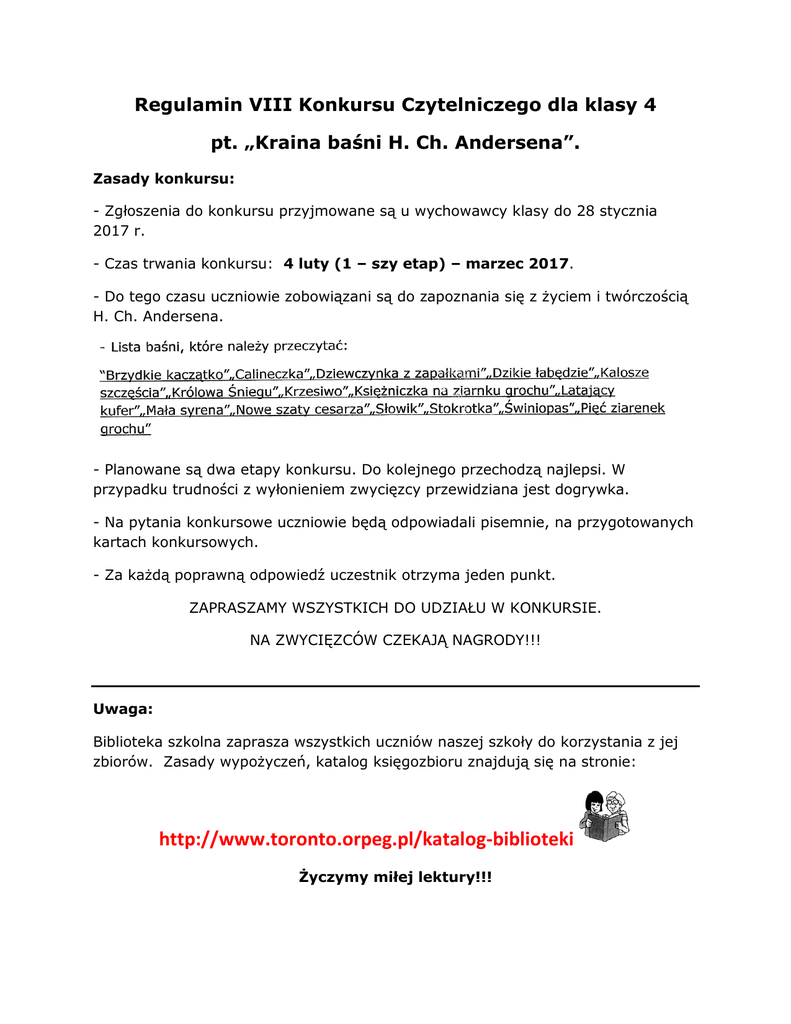 Regulamin VIII Konkursu Czytelniczego dla klasy 4 pt. „Kraina baśni H. Ch. Andersena”. Zasady konkursu: - Zgłoszenia do konkursu przyjmowane są u wychowawcy klasy do 28 stycznia 2017 r. - Czas trwania konkursu: 4 luty (1 – szy etap) – marzec 2017. - Do tego czasu uczniowie zobowiązani są do zapoznania się z życiem i twórczością H. Ch. Andersena. - Planowane są dwa etapy konkursu. Do kolejnego przechodzą najlepsi. W przypadku trudności z wyłonieniem zwycięzcy przewidziana jest dogrywka. - Na pytania konkursowe uczniowie będą odpowiadali pisemnie, na przygotowanych kartach konkursowych. - Za każdą poprawną odpowiedź uczestnik otrzyma jeden punkt. ZAPRASZAMY WSZYSTKICH DO UDZIAŁU W KONKURSIE. NA ZWYCIĘZCÓW CZEKAJĄ NAGRODY!!! Uwaga: Biblioteka szkolna zaprasza wszystkich uczniów naszej szkoły do korzystania z jej zbiorów. Zasady wypożyczeń, katalog księgozbioru znajdują się na stronie: http://www.toronto.orpeg.pl/katalog-biblioteki Życzymy miłej lektury!!!