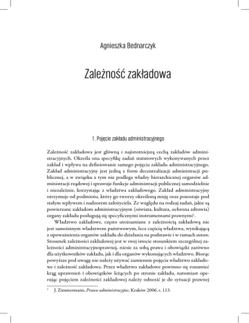 Agnieszka Bednarczyk Zależność zakładowa 1. Pojęcie zakładu administracyjnego Zależność zakładowa jest główną i najistotniejszą cechą zakładów administracyjnych. Określa ona specyfikę zadań statutowych wykonywanych przez zakład i wpływa na definiowanie samego pojęcia zakładu administracyjnego. Zakład administracyjny jest jedną z form decentralizacji administracji publicznej, a w związku z tym nie podlega władzy hierarchicznej organów administracji rządowej i sprawuje funkcje administracji publicznej samodzielnie i niezależnie, korzystając z władztwa zakładowego. Zakład administracyjny otrzymuje od podmiotu, który go tworzy określoną misję oraz pozostaje pod stałym wpływem i nadzorem założyciela. Ze względu na rodzaj zadań, jakie są powierzane zakładom administracyjnym (oświata, kultura, ochrona zdrowia) organy zakładu posługują się specyficznymi instrumentami prawnymi1. Władztwo zakładowe, często utożsamiane z zależnością zakładową nie jest samoistnym władztwem państwowym, lecz częścią władztwa, wynikającą z upoważnienia organów zakładu do działania na podstawie i w ramach ustaw. Stosunek zależności zakładowej jest w swej istocie stosunkiem szczególnej zależności administracyjnoprawnej, niesie za sobą prawa i obowiązki zarówno dla użytkowników zakładu, jak i dla organów wykonujących władztwo. Biorąc powyższe pod uwagę nie należy używać zamiennie pojęcia władztwo zakładowe i zależność zakładowa. Przez władztwo zakładowe powinno się rozumieć krąg uprawnień i obowiązków leżących po stronie zakładu, natomiast operując pojęciem zależności zakładowej należy odnosić je do sytuacji prawnej 1 J. Zimmermann, Prawo administracyjne, Kraków 2006, s. 113. Agnieszka Bednarczyk użytkowników zakładu, obowiązanych do poddania się reżimom obowiązującym w zakładzie. W zakładzie administracyjnym proces realizacji zadań publicznych przebiega w obrębie szeroko pojętej organizacji. Wynika to z faktu, że grupa społeczna złożona z użytkowników zakładu administracyjnego ma zawsze (w danym przedziale czasu) charakter mniej lub bardziej zamknięty2. Cechy tej grupy wiążą się z pozaprawnym charakterem kryteriów, które ją cechują i czynią podporządkowaną strukturze wewnętrznej. Wit Klonowiecki zakład administracyjny definiował jako zespół osób, rzeczy i praw, „zorganizowany przez podmioty administracji publicznej i trwale z nimi związany, przeznaczony do indywidualnego użytkowania przez osoby uprawnione, w sporach między którymi a użytkodawcą, przynajmniej w kwestii możności korzystania z zakładu, wyłączona jest droga sądowa”3. Definicję swoją Klonowiecki wywiódł na podstawie porównania zakładu administracyjnego z innymi formami organizacyjnymi administracji publicznej. Zakres zależności zakładowej i związanej z nią swobody działania organów zakładu determinował słuszność szerokiego ograniczenia ingerencji sądów w sprawy pomiędzy zakładem a użytkownikami. Lata międzywojenne, kiedy to autor precyzował swoje poglądy, dały podwalinę obecnie formułowanym definicjom. W. Klonowiecki przez porównanie sytuacji prawnej użytkowników zakładu oraz osób korzystających z usług oferowanych przez przedsiębiorstwa państwowe czy fundacje wyprowadził szereg wniosków potwierdzających istotę i specyfikę zależności łączącej destynatariuszy z zakładem publicznym. Przywołując poglądy Stefana Zawadzkiego i Władysława Jaworskiego, doszedł do przekonania, że przedsiębiorstwa publiczne w sferze życia gospodarczego przyjmują formy określone przez prawo. Stosunek pomiędzy przedsiębiorstwem prywatnym, a osobami korzystającymi z jego usług regulują normy prawa prywatnego4. Zakłady publiczne natomiast są kreowane przez prawo publiczne, podobnie jak stosunek pomiędzy zakładem a użytkownikiem. W zakresie prawa do użytkowania o publicznym charakterze zakładu administracyjnego świadczy2 3 4 34 W takim tonie wypowiadał się J. Filipek, Prawo administracyjne. Instytucje ogólne, cz. 1, Kraków 2003, s. 267, podobne stanowisko reprezentowane jest w: Postanowieniu WSA w Warszawie z dnia 10 października 2007 r., I SA/Wa 1319/07, wyroku WSA w Olsztynie z dnia 30 grudnia 2009 r., II SA/Ol 606/09 czy Postanowieniu NSA z dnia 19 maja 2010 r., I OSK 774/10, opublikowanych w centralnej bazie orzeczeń sądów administracyjnych, www.orzeczenia.nsa.gov.pl. W. Klonowiecki, Zakład publiczny w prawie polskim. Studium prawno-administracyjne, Lublin 1933, s. 121. Ibidem, s. 103. Zależność zakładowa ło także wyłączenie drogi sądowej w sporach pomiędzy zakładem a użytkownikiem, podczas gdy w przedsiębiorstwach publicznych mogło ono być przedmiotem postępowania sądowego. Cechą wspólną obydwu instytucji było to, że przedsiębiorstwa publiczne, podobnie jak zakład, mogły być włączone w system administracyjny państwa lub gminy i stanowiły „zespół osób i rzeczy tworzący jedność techniczną”5. Wit Klonowiecki6 definiował nie tylko zakład jako konstrukcję prawa publicznego, ale i fundację. Wynikało to z uregulowań prawnych obowiązujących na ziemiach byłych zaborów. Stosunek użytkownika do zakładu i fundacji miał charakter publicznoprawny, a spory pomiędzy nimi rozstrzygały władze administracyjne, co jednak nie dawało podstaw do utożsamiania ich ze sobą. Zdaniem Klonowieckiego, każda fundacja była osobą prawną, ale już nie każdy zakład taką osobowość posiadał, fundacja mogła służyć wyłącznie celom ogólnym i w ogóle nie posiadać indywidualnych użytkowników, natomiast zakład przeznaczony był (i jest) do indywidualnego użytkowania. Autor podkreślał szczególne relacje pomiędzy zakładem i użytkownikiem, regulowane przez prawo pozytywne, czego nie wykazywały stosunki pomiędzy fundatorem a fundacją. Przedstawione poglądy stanowiły ogromną wartość dl