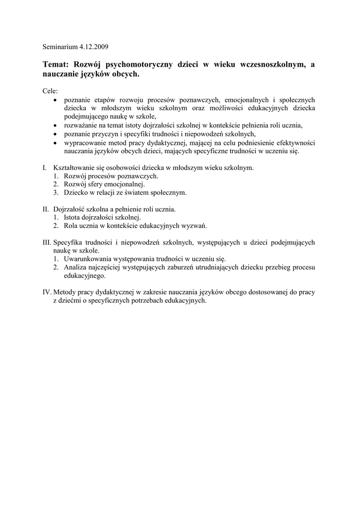 Seminarium 4.12.2009 Temat: Rozwój psychomotoryczny dzieci w wieku wczesnoszkolnym, a nauczanie języków obcych. Cele: poznanie etapów rozwoju procesów poznawczych, emocjonalnych i społecznych dziecka w młodszym wieku szkolnym oraz możliwości edukacyjnych dziecka podejmującego naukę w szkole, rozważanie na temat istoty dojrzałości szkolnej w kontekście pełnienia roli ucznia, poznanie przyczyn i specyfiki trudności i niepowodzeń szkolnych, wypracowanie metod pracy dydaktycznej, mającej na celu podniesienie efektywności nauczania języków obcych dzieci, mających specyficzne trudności w uczeniu się. I. Kształtowanie się osobowości dziecka w młodszym wieku szkolnym. 1. Rozwój procesów poznawczych. 2. Rozwój sfery emocjonalnej. 3. Dziecko w relacji ze światem społecznym. II. Dojrzałość szkolna a pełnienie roli ucznia. 1. Istota dojrzałości szkolnej. 2. Rola ucznia w kontekście edukacyjnych wyzwań. III. Specyfika trudności i niepowodzeń szkolnych, występujących u dzieci podejmujących naukę w szkole. 1. Uwarunkowania występowania trudności w uczeniu się. 2. Analiza najczęściej występujących zaburzeń utrudniających dziecku przebieg procesu edukacyjnego. IV. Metody pracy dydaktycznej w zakresie nauczania języków obcego dostosowanej do pracy z dziećmi o specyficznych potrzebach edukacyjnych. „Dzieci same w sobie nie stanowią żadnej odrębnej kategorii ani specjalnej klasy społecznej oddzielonej od dorosłych. Nie są innym gatunkiem ludzi mniej rozwiniętych czy też podległych. Są takie jak my, identyczne we wszystkim. I jeśli nie są jeszcze zdolne do zrozumienia i robienia pewnych rzeczy, jeśli potrzebują jeszcze pomocy, to przez ten fakt powinny być jedynie uprzywilejowane….’’ (Marcello Bernardi) Niezwykle ważnym momentem rozwojowym jest rozpoczęcie przez dziecko edukacji szkolnej. W tym okresie następują duże zmiany nie tylko w sferze intelektualnej, ale i całej osobowości dziecka. Pojawia się dążenie do pozytywnych kontaktów. I. Kształtowanie się osobowości dziecka w młodszym wieku szkolnym. „Osobowość człowieka kształtuje się i zmienia w ścisłym związku z otaczającym je światem, w wyniku nawiązania z nim różnorodnych relacji.” 1. Rozwój procesów poznawczych. Teoria J. Piageta dostarcza szczegółowej charakterystyki poszczególnych stadiów rozwoju umysłowego dziecka z uwzględnieniem zarówno jego umiejętności w kolejnych etapach, jak i tego, czego nie potrafi wykonać. Wg tej teorii dzieci przechodzą cztery, zróżnicowane jakościowo okresy poznawczego. Stadia rozwoju poznawczego wg Piageta Typowy zakres wieku Opis stadium Zjawiska rozwojowe Sensomotoryczne Od urodzenia do dwóch Doświadczenie świata za pomocą lat zmysłów i czynności (patrzenia, dotykania, ssania) Przedoperacyjne Od około dwóch lat do Przedstawianie rzeczy za pomocą sześciu lat słów, obrazów, lecz brak logicznego rozumowania Operacje konkretne Logiczne myślenie o konkretnych Od około siedmiu do zjawiskach, pojmowanie jedenastu lat konkretnych analogii i przeprowadzenie operacji arytmetycznych * Trwałość (obiektywność) przedmiotu * Lęk przed nieznajomym Od około dwunastu lat do wieku dorosłego * Logika abstrakcyjna * Umiejętność dojrzałego sądu moralnego Operacje formalne Rozumowanie abstrakcyjne * Zabawy naśladowcze * Egocentryzm * Rozwój języka * Rozmowa * Przekształcenia matematyczne (E. Guz, 1987) 1. Stadium, które dotyczy rozwoju dziecka w młodszym wieku szkolnym, to moment przejścia od stadium myślenia przedoperacyjnego do stadium operacji konkretnych. Tak więc dziecko nabywa nowe umiejętności, które wiążą się z przyswajaniem i przetważaniem informacji o otaczającym je świecie. Dziecko jest zdolne do przeprowadzenia operacji umysłowych, jednak wciąż ma problem z rozumowaniem abstrakcyjnym, bez trudu poradzi sobie, jeśli ma do czynienia z konkretnymi, percepcyjnie dostępnymi obiektami, wytworzenie się operacyjnych form reprezentacji świata pomaga w umyśle dziecka przybrał określony ład, który sprzyja zrozumieniu i w przewidywanie tego, co się dzieje (pomaga tworzyć pomysły, idee, plany, programy działania, a więc sprzyja kreowaniu świata, w którym dziecko żyje), uporządkowanie doświadczenia w sieci operacyjnej ma również konsekwencje emocjonalne. (zgodność napływających informacji z dotychczasowymi przekonaniami wywołuje emocje dodatnie, niezgodność – ujemne ), jednak najważniejsze osiągnięcie tego okresu to, pojawienie się myślenia logicznego, które umożliwia dziecku przeprowadzenie wnioskowania o charakterze przyczynowoskutkowym. Dzięki tej umiejętności dziecko potrafi wyjaśnić wiele zjawisk, a także przewidywać teoretyczne następstwo zdarzeń – a to z kolei umożliwia mu rozwiązywanie różnych problemów natury umysłowej i praktycznej. Należy jednak zwrócić uwagę na fakt, że mimo iż dzieci uczą się używać logiki i wnioskować w rozwiązywaniu konkretnych problemów, to symbole, jakich używają w rozumowaniu nadal pozostają symbolami konkretnych przedmiotów i zdarzeń, nie są natomiast abstrakcjami (ta umiejętność pojawia się dopiero ok.11 roku życia, a u niektórych nie wytwarza się wcale). PODSTAWOWE RODZAJE PROCESÓW POZNAWCZYCH odbieranie wrażeń, spostrzeganie, myślenie myślenie pojęciowe odwracalność myślenie logiczne uwaga i pamięć Uwaga i pamięć – niezbędne zdolności w rozwoju procesu poznawczego! W dużej mierze należą do czynników wrodzonych, aczkolwiek niewątpliwie rozwijają się podczas procesu uczenia się. O efektywności skupiana uwagi, zapamiętywania decydują także; cechy indywidualne (np. temperament), wpływa oddziaływań wychowawczych, efektywność w zapamiętywaniu pozostaje w ścisłym związku z rozwojem pamięci logicznej. 2. Rozwój sfery emocjonalnej Rozwój poznawczy jest ściśle powiązany z rozwojem emocjonalnym człowieka. W miarę 