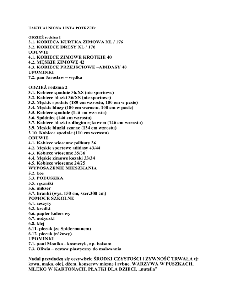 UAKTUALNIONA LISTA POTRZEB: ODZIEŻ rodzina 1 3.1. KOBIECA KURTKA ZIMOWA XL / 176 3.2. KOBIECE DRESY XL / 176 OBUWIE 4.1. KOBIECE ZIMOWE KRÓTKIE 40 4.2. MĘSKIE ZIMOWE 42 4.3. KOBIECE PRZEJŚCIOWE –ADIDASY 40 UPOMINKI 7.2. pan Jarosław – wędka ODZIEŻ rodzina 2 3.1. Kobiece spodnie 36/XS (nie sportowe) 3.2. Kobiece bluzki 36/XS (nie sportowe) 3.3. Męskie spodnie (180 cm wzrostu, 100 cm w pasie) 3.4. Męskie bluzy (180 cm wzrostu, 100 cm w pasie) 3.5. Kobiece spodnie (146 cm wzrostu) 3.6. Spódnice (146 cm wzrostu) 3.7. Kobiece bluzki z długim rękawem (146 cm wzrostu) 3.9. Męskie bluzki czarne (134 cm wzrostu) 3.10. Kobiece spodnie (110 cm wzrostu) OBUWIE 4.1. Kobiece wiosenne półbuty 36 4.2. Męskie sportowe adidasy 43/44 4.3. Kobiece wiosenne 35/36 4.4. Męskie zimowe kozaki 33/34 4.5. Kobiece wiosenne 24/25 WYPOSAŻENIE MIESZKANIA 5.2. koc 5.3. PODUSZKA 5.5. ręczniki 5.6. mikser 5.7. firanki (wys. 150 cm, szer.300 cm) POMOCE SZKOLNE 6.1. zeszyty 6.3. kredki 6.6. papier kolorowy 6.7. nożyczki 6.8. klej 6.11. plecak (ze Spidermanem) 6.12. plecak (różowy) UPOMINKI 7.1. pani Monika - kosmetyk, np. balsam 7.3. Oliwia – zestaw plastyczny do malowania Nadal przydadzą się oczywiście ŚRODKI CZYSTOŚCI i ŻYWNOŚĆ TRWAŁA tj: kawa, mąka, olej, dżem, konserwy mięsne i rybne, WARZYWA W PUSZKACH, MLEKO W KARTONACH, PŁATKI DLA DZIECI, „nutella”