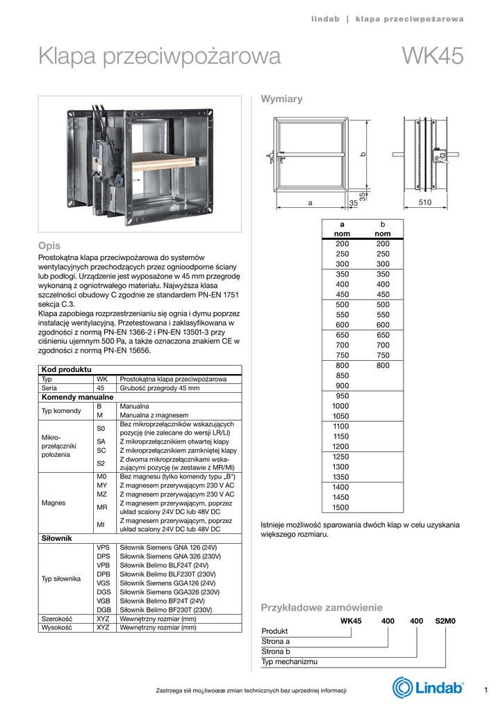 lin dab | kla pa p rze ciw poża ro wa Klapa przeciwpożarowa WK45 a a nom 200 250 300 350 400 450 500 550 600 650 700 750 800 850 900 950 1000 1050 1100 1150 1200 1250 1300 1350 1400 1450 1500 Opis Prostokątna klapa przeciwpożarowa do systemów wentylacyjnych przechodzących przez ognioodporne ściany lub podłogi. Urządzenie jest wyposażone w 45 mm przegrodę wykonaną z ogniotrwałego materiału. Najwyższa klasa szczelności obudowy C zgodnie ze standardem PN-EN 1751 sekcja C.3. Klapa zapobiega rozprzestrzenianiu się ognia i dymu poprzez instalację wentylacyjną. Przetestowana i zaklasyfikowana w zgodności z normą PN-EN 1366-2 i PN-EN 13501-3 przy ciśnieniu ujemnym 500 Pa, a także oznaczona znakiem CE w zgodności z normą PN-EN 15656. Kod produktu Typ Seria WK 45 Prostokątna klapa przeciwpożarowa Grubość przegrody 45 mm Komendy manualne Typ komendy B M S0 Mikroprzełączniki położenia SA SC S2 M0 MY MZ Magnes MR MI Manualna Manualna z magnesem Bez mikroprzełączników wskazujących pozycję (nie zalecane do wersji LR/LI) Z mikroprzełącznikiem otwartej klapy Z mikroprzełącznikiem zamkniętej klapy Z dwoma mikroprzełącznikami wskazującymi pozycję (w zestawie z MR/MI) Bez magnesu (tylko komendy typu „B") Z magnesem przerywającym 230 V AC Z magnesem przerywającym 230 V AC Z magnesem przerywającym, poprzez układ scalony 24V DC lub 48V DC Z magnesem przerywającym, poprzez układ scalony 24V DC lub 48V DC Siłownik Typ siłownika Szerokość Wysokość VPS DPS VPB DPB VGS DGS VGB DGB XYZ XYZ Siłownik Siemens GNA 126 (24V) Siłownik Siemens GNA 326 (230V) Siłownik Belimo BLF24T (24V) Siłownik Belimo BLF230T (230V) Siłownik Siemens GGA126 (24V) Siłownik Siemens GGA326 (230V) Siłownik Belimo BF24T (24V) Siłownik Belimo BF230T (230V) Wewnętrzny rozmiar (mm) Wewnętrzny rozmiar (mm) 35 35 b Wymiary 510 b nom 200 250 300 350 400 450 500 550 600 650 700 750 800 Istnieje możliwość sparowania dwóch klap w celu uzyskania większego rozmiaru. Przykładowe zamówienie WK45 400 400 S2M0 Produkt Strona a Strona b Typ mechanizmu Zastrzega siê mo¿liwoœæ zmian technicznych bez uprzedniej informacji 1 l i n d a b | k l a p a p r z ec i w p oża ro wa Klapa przeciwpożarowa d e Wymiary S c b nom 200 250 300 350 400 450 500 550 600 650 700 750 800 S S (pozycja przegrody) mm 9 34 59 84 109 134 Typ mechanizmu: WK45B - Manualny WK45M – Manualny z magnesem WK45VGB/DGB – Siłownik Belimo WK45VPS/DPS - Siłownik Siemens Typ mechanizmu WK45B WK45M WK45VGB/DGB WK45VGS/DGS 2 c mm 45 84 67 74 d mm 184 184 155 177 e mm 57 57 93 78 Zastrzega siê mo¿liwoœæ zmian technicznych bez uprzedniej informacji WK45 lin dab | kla pa p rze ciw poża ro wa Klapa przeciwpożarowa WK45 Parametry techniczne Klasyfikacja odporności ogniowej zgodnie z normą PN-EN 13501-3 EI 180 S EI 120 S EI 90 S (500 Pa) (500 Pa) (500 Pa) Pionowa ścianka sztywna – pojedyncza klapa Minimalna grubość 100 mm a×b a×b min.. density 500 kg/m3 min. 200×200 min. 200×200 ve (i↔o) max. 1500×800 max. 1500×800 Pionowa ścianka sztywna – sparowane klapy podłączone do jednego przewodu a×b a×b Minimalna grubość100 mm max. 3070×800 max. 3070×800 3 min.. density 500 kg/m max. 1500×1670 max. 1500×1670 ve (i↔o) max. 1670×1500 max. 1670×1500 Pionowa ścianka sztywna – pojedyncza klapa Minimalna grubość140 mm a×b a×b a×b Minimalna gęstość 500 kg/m3 min. 200×200 min. 200×200 min. 200×200 ve (i↔o) max. 1500×800 max. 1500×800 max. 1500×800 Pionowa ścianka sztywna – sparowane klapy podłączone do jednego przewodu a×b a×b a×b Minimalna grubość 140 mm max. 3070×800 max. 3070×800 max. 3070×800 3 Minimalna gęstość 500 kg/m max. 1500×1670 max. 1500×1670 max. 1500×1670 ve (i↔o) max. 1670×1500 max. 1670×1500 max. 1670×1500 Ścianka kartonowo-gipsowa – uszczelniana zaprawą Minimalna grubość 100 mm a×b a×b Minimalna gęstość 100 kg/m3 min. 200×200 min. 200×200 ve (i↔o) max. 1500×800 max. 1500×800 Ścianka kartonowo-gipsowa – uszczelniana wełną mineralną a×b Minimalna grubość 100 mm Minimalna gęstość 100 kg/m3 min. 200×200 ve (i↔o) max. 1500×800 Lekka ścianka z płyt gipsowych Minimalna grubość 100 mm a×b a×b Minimalna gęstość 995 kg/m3 min. 200×200 min. 200×200 max. 1000×600 ve (i↔o) max. 1000×600 Lekka ścianka z płyt gipsowych Minimalna grubość 70 mm a×b Minimalna gęstość 995 kg/m3 min. 200×200 ho (i↔o) max. 1000×600 Podłoga a×b a×b a×b Minimalna grubość 140 mm Minimalna gęstość 2200 kg/m3 min. 200×200 min. 200×200 min. 200×200 ho (i↔o) max. 1500×800 max. 1500×800 max. 1500×800 Podłoga Minimalna grubość 150 mm a×b a×b Minimalna gęstość 650 kg/m3 min. 200×200 min. 200×200 max. 1500×800 ho (i↔o) max. 1500×800 Podłoga Minimalna grubość 100 mm a×b Minimalna gęstość 650 kg/m3 min. 200×200 ho (i↔o) max. 1500×800 Ø ve ho (i↔o) Pa E I S EI 60 S (500 Pa) a×b min. 200×200 max. 1500×800 a×b max. 3070×800 max. 1500×1670 max. 1670×1500 a×b min. 200×200 max. 1500×800 a×b max. 3070×800 max. 1500×1670 max. 1670×1500 a×b min. 200×200 max. 1500×800 a×b min. 200×200 max. 1500×800 a×b min. 200×200 max. 1000×600 a×b min. 200×200 max. 1000×600 a×b min. 200×200 max. 1500×800 a×b min. 200×200 max. 1500×800 a×b min. 200×200 max. 1500×800 wewnętrzna średnica klapy (mm) instalacja pionowa instalacja pozioma pochodzenie ognia jest nieistotne ciśnienie ujemne Integralność izolacja termiczna uszczelka przeciwdymowa Zastrzega siê mo¿liwoœæ zmian technicznych bez uprzedniej informacji 3