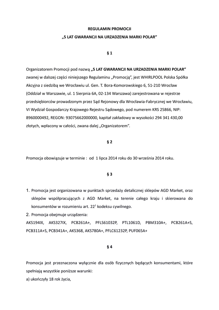 REGULAMIN PROMOCJI „5 LAT GWARANCJI NA URZADZENIA MARKI POLAR” §1 Organizatorem Promocji pod nazwą „5 LAT GWARANCJI NA URZADZENIA MARKI POLAR” zwanej w dalszej części niniejszego Regulaminu „Promocją”, jest WHIRLPOOL Polska Spółka Akcyjna z siedzibą we Wrocławiu ul. Gen. T. Bora-Komorowskiego 6, 51-210 Wrocław (Oddział w Warszawie, ul. 1 Sierpnia 6A, 02-134 Warszawa) zarejestrowana w rejestrze przedsiębiorców prowadzonym przez Sąd Rejonowy dla Wrocławia-Fabrycznej we Wrocławiu, VI Wydział Gospodarczy Krajowego Rejestru Sądowego, pod numerem KRS 25866, NIP: 8960000492, REGON: 93075662000000, kapitał zakładowy w wysokości 294 341 430,00 złotych, wpłacony w całości, zwana dalej „Organizatorem”. §2 Promocja obowiązuje w terminie : od 1 lipca 2014 roku do 30 września 2014 roku. §3 1. Promocja jest organizowana w punktach sprzedaży detalicznej sklepów AGD Market, oraz sklepów współpracujących z AGD Market, na terenie całego kraju i skierowana do konsumentów w rozumieniu art. 221 kodeksu cywilnego. 2. Promocja obejmuje urządzenia: AKS194IX, AKS327IX, PCB261A+, PFLS61032P, PTL1061D, PBM310A+, PCB261A+S, PCB311A+S, PCB341A+, AKS368, AKS780A+, PFLC61232P, PUF065A+ §4 Promocja jest przeznaczona wyłącznie dla osób fizycznych będących konsumentami, które spełniają wszystkie poniższe warunki: a) ukończyły 18 rok życia, b) zamieszkują na terytorium Rzeczypospolitej Polskiej, c) posiadają pełną zdolność do czynności prawnych, d) nie jest pracownikiem Organizatora ani nie jest związany z Organizatorem umową zlecenia, o dzieło lub podobną. Uczestnikiem Promocji staje się osoba, która spełni warunki określone w § 5 niniejszego Regulaminu i w przypadku, której zachodzą przesłanki określone w § 4 niniejszego Regulaminu. §5 Warunkami uczestnictwa w Promocji – oprócz wszystkich innych warunków wymienionych w niniejszym Regulaminie Promocji – są łącznie: a) Dokonanie, w okresie obowiązywania Promocji wskazanym w paragrafie 2, zakupu przez konsumenta w punkcie sprzedaży detalicznej sklepów AGD Market, oraz w sklepach współpracujących z AGD Market w celu niezwiązanym z prowadzeniem działalności zawodowej lub gospodarczej urządzeń AGD marki Polar: AKS194IX, AKS327IX, PCB261A+, PFLS61032P, PTL1061D, PBM310A+, PCB261A+S, PCB311A+S, PCB341A+, AKS368, AKS780A+, PFLC61232P, PUF065A+ b) Przesłać Organizatorowi na adres: Whirlpool Polska S.A, ul. 1 Sierpnia 6a, 02-134 Warszawa, z dopiskiem „5 LAT GWARANCJI NA URZADZENIA MARKI POLAR” następujących dokumentów: - kopia dowodu zakupu urządzenia marki Polar objętego Promocją zgodnie z paragrafem 3 (faktura, rachunek lub paragon z kasy fiskalnej). Uczestnik promocji powinien zachować oryginały dowód nabycia urządzenia oraz Kart Gwarancyjnych i niezwłocznie udostępnić je Organizatorowi na żądanie w celu ewentualnej weryfikacji spełniania warunków udziału w Promocji. - wypełniony formularz rejestracyjny, dostępny w punktach sprzedaży detalicznej sklepów AGD Market, oraz w sklepach współpracujących z AGD Market – zgodny ze wzorem formularza stanowiącym załącznik do niniejszego Regulaminu. Klient zobowiązany jest do przesłania ww. dokumentów w ciągu 30 dni od dnia zakupu urządzenia – decyduje data otrzymania przesyłki przez Organizatora. §6 Organizator Promocji poinformuje o mechanizmie i zasadach Promocji poprzez regulamin promocji, który będzie dostępny we wszystkich punktach sprzedaży biorących udział w promocji „5 LAT GWARANCJI NA URZADZENIA MARKI POLAR” oraz biurze Organizatora w Warszawie przy ul. 1 Sierpnia 6A. §7 Organizator nie ponosi odpowiedzialności za skutki braku spełnienia wymogów, o których mowa w §4 i §5, wynikające z przyczyn od niego niezależnych. Zgłoszenie udziału w Promocji niezgodne z warunkami opisanymi w niniejszym Regulaminie lub też zawierające nieczytelne, niepełne bądź nieprawdziwe dane uważa się za niebyłe, a zatem nieuprawniające do uczestnictwa w Promocji. §8 1. Wzięcie udziału w Promocji jest równoznaczne z wyrażeniem przez Uczestnika zgody na przetwarzanie jego danych osobowych w celach przeprowadzenia Promocji przez Organizatora oraz ich udostępnianie osobom trzecim współpracującym z Organizatorem, w szczególności osobom, którym Organizator powierza przetwarzanie danych. Wyrażenie powyższej zgody jest dobrowolne, jednak jej niewyrażenie lub nieudostępnienie określonych w niniejszym uniemożliwia wzięcie udziału w Promocji. regulaminie danych osobowych 2. Administratorem danych osobowych podanych w formularzu rejestracyjnym jest Organizator. 3. Przetwarzanie danych osobowych odbywać się będzie na zasadach przewidzianych ustawą z dnia 29 sierpnia 1997 r. o ochronie danych osobowych (Dz. U. 2002 r. Nr 101, poz. 926 z późn. zm.). Organizator informuje, że każdy z Uczestników ma prawo dostępu do swoich danych, jak również prawo ich poprawiania. 4. Przetwarzanie danych osobowych Uczestników obejmować będzie następujący zakres danych: (a) imię i nazwisko; (b) adres; (c) numer telefonu. §9 Organizator nie ponosi odpowiedzialności za nieprawidłowości związane z działaniem poczty, w tym opóźnienie, brak doręczenia, zniszczenie lub uszkodzenie przesyłki. § 10 1. Nagrodą w Promocji jest przedłużenie dwuletniego okresu gwarancji o trzy lata (do lat pięciu) na nabyte przez Uczestnika urządzenie zgłoszone w Promocji (wszystkie prawidłowo zgłoszone urządzenia). Warunki gwarancji dla Uczestników Promocji różnią się od standardowych warunków gwarancji przedłużonym okresem gwarancji. Nagroda, w postaci vouchera wydłużonej do 5 lat gwarancji na zakupione urządzenia, będzie honorowana przez wszystkie serwisy autoryzowanej sieci Whirlpool na terenie kraju. Nagroda zostanie przesłana Uczestnikom listem poleconym na adres podany przez nich w zgłoszeniu, w terminie do 6 tygodni od jego otrzymania i pozytywnego zweryfikow