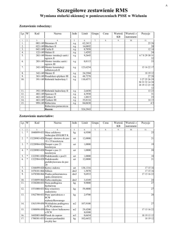 A Szczegółowe zestawienie RMS Wymiana stolarki okiennej w pomieszczeniach PSSE w Wieluniu Zestawienie robocizny: Lp. W 1. 2. Kod Nazwa 3. 1. 2. 3. 4. 5. 002-149 022-149 042-149 122-149 202-149 6. 203-149 7. 242-149 8. 9. 10. 342-149 383-149 391-149 11. 12. 13. 14. 15. 392-149 402-149 462-149 463-149 999-149 4. Jedn 5. Limit Grupa Cena 6. 7. 8. Wartość Wartość z KB narzutami 9. 10. Pozycje 11. Betoniarz II Blacharz II Cieśla II Malarz II Monter instalacji sanit.i ogrzew.II Monter instalac.sanit.i ogrzew.III Monter konstrukcji żelbetowych II Murarz II Posadzkarz-płytkarz III Robotnik budowlany I r-g r-g r-g r-g r-g 62,2413 14,0892 0,7058 1,4292 9,2645 r-g 0,8115 25 26 20 12 14 24 6 7 8 29 30 31 32 33 r-g 123,6254 15 16 22 17 r-g r-g r-g 24,2304 48,7278 110,4571 Robotnik budowlany II Spawacz II Tynkarz II Tynkarz III Robocizna Robocizna pomocnicza Razem: r-g r-g r-g r-g r-g 2,6430 4,3930 1,8015 35,8116 84,0630 18 19 12 27 28 3 27 25 26 29 30 33 32 14 20 18 19 13 23 10 12 13 23 31 23 14 13 45 524,2943 Zestawienie materiałów: Lp. W 1. 2. 1. * 2. * 3. * 4. * 5. 6. * * 7. 8. 9. 10. 11. 12. 13. 14. 15. 16. 17. Kod Nazwa 3. 4. 1040899-033 Masa asfaltowa izolacyjna IZOLBET K 13220903-020 Parapet -dostawa do poz 18 i 19 kosztorysu 13220904-020 Parapet z poz 21 kosztorysu 13220905-020 Parapet z poz 21 kosztorysu 1322901-020 Podokienniki z poz21 1322984-020 Podokienniki prefabrykowane do poz 20 1344499-020 Kotwy stalowe 1478101-066 Silikon 1478500-066 Pianka poliuretanowaopak.ciśnieniowe 1510899-066 Farba emulsyjna 1530200-033 Pasta podłogowa bezbarwna 1551000-033 Klej winylowy osakrylowy 1562700-033 Pręty spawalnicze z PCW n/plastyfikowanego 1563199-050 Wykładzina podłogowa z PCW,rulonowa 1580898-050 Okna i drzwi balkonowe z PCW 1602003-060 Piasek do zapraw 1700301-033 Cement portlandzki zwykły bez Jedn Limit Grupa Cena 7. 8. Wartość Wartość z KB narzutami 5. 6. kg 6,9300 25 szt 12,0000 21 szt 1,0000 19 szt 1,0000 20 szt szt 1,0000 12,0000 18 21 szt dm3 dm3 138,1316 1,5078 9,6933 17 15 16 17 15 16 17 15 16 22 dm3 kg 3,4349 9,9000 24 27 kg 59,4000 27 kg 2,9700 28 m2 107,9100 27 m2 29,4200 8,0300 0,6654 102,6652 17 15 16 22 m3 kg 9. 10. Pozycje 11. 18 19 13 12 18 19 12 B 1. 2. 18. 19. 20. 21. 22. 23. 24. 25. 26. * 27. 28. 29. 3. 4. dodatków"35" 1701100-034 Cement portlandzki "25" z dodatkami 1720200-033 Wapno suchogaszone (hydratyzowane) 1720200-034 Wapno suchogaszone (hydratyzowane) 1740100-033 Gips budowlany 1740103-033 Gips budowlany szpachlowy (szpachlówka) 1800100-020 Cegły budowlane pełne kl.75 2350403-033 Sucha zaprawa szpachlowa "Atlas" 2360000-066 preparat Tytan 2380808-060 Zaprawa cementowa M 12 3930000-060 Woda 3950101-033 Drewno opałowe 5062903-040 Rury stal.z/szwem gwint.czarne,33,7/3,25m m 5731601-020 Złączki do grzejników,M3090,M30 91,śr.15 mm 5732701-020 Trójniki przyłączeniowe M3096,śr.15 mm 5733100-020 Zawór grzej.termostat. fi 15 mm 6010810-090 Grzejniki stalowe 2płytowe bez 30. 31. 32. 33. 5. 6. 7. 8. 9. 10. 11. t 0,1078 13 25 kg 0,4608 12 t 0,1021 13 kg kg 69,1692 18,0150 17 14 15 16 14 szt 8,6400 12 kg 102,8418 17 15 16 dm3 m3 1,2010 4,1184 23 25 26 m3 0,2850 kg m 11,8800 0,6000 14 18 19 13 23 12 25 33 szt 5,0000 31 szt 10,0000 29 30 szt 5,0000 32 kpl 4,0000 29 kpl 1,0000 30 szt 5,0000 31 ożebrowania konwekcyjnego 34. 6010813-090 Grzejniki stalowe 2płytowe bez ożebrowania konwekcyjnego 35. 6420742-020 Tarczki ochronne dwudzielne 20 mm Materiały pomocnicze Razem: Zestawienie sprzętu: Lp. W 1. 1. 2. 3. 4. 5. 6. 7. 2. Kod Nazwa 3. 4. 30000-148 Środek transportowy 34000-148 Wyciągi tow.-osob.i budowlane 34312-148 Wyciąg 1-maszt.z napędem elekt 39000-148 Środek transportowy 39511-148 Samochód dostawczy do 0,9 t 39811-148 Samochód samowyładowczy do 5 t 43211-148 Betoniarka wolnospadowa 150dm3 Materiały pomocnicze Razem: Jedn 5. Limit Grupa Cena 6. 7. 8. Wartość Wartość z KB narzutami 9. 10. Pozycje 11. m-g m-g 0,5001 8,3202 m-g 2,4084 14 27 25 17 14 15 16 27 25 26 22 18 19 13 23 12 m-g m-g 2,2470 1,4000 17 15 16 22 29 30 32 m-g 2,3128 10 11 m-g 1,8203 18 19 13 23 12 91,20 91,20