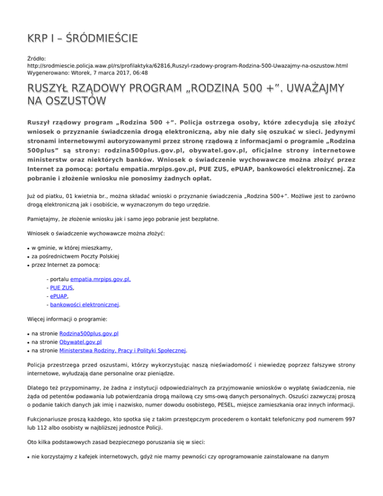 KRP I – ŚRÓDMIEŚCIE Źródło: http://srodmiescie.policja.waw.pl/rs/profilaktyka/62816,Ruszyl-rzadowy-program-Rodzina-500-Uwazajmy-na-oszustow.html Wygenerowano: Wtorek, 7 marca 2017, 06:48 RUSZYŁ RZĄDOWY PROGRAM „RODZINA 500 +”. UWAŻAJMY NA OSZUSTÓW Ruszył rządowy program „Rodzina 500 +”. Policja ostrzega osoby, które zdecydują się złożyć wniosek o przyznanie świadczenia drogą elektroniczną, aby nie dały się oszukać w sieci. Jedynymi stronami internetowymi autoryzowanymi przez stronę rządową z informacjami o programie „Rodzina 500plus” są strony: rodzina500plus.gov.pl, obywatel.gov.pl, oficjalne strony internetowe ministerstw oraz niektórych banków. Wniosek o świadczenie wychowawcze można złożyć przez Internet za pomocą: portalu empatia.mrpips.gov.pl, PUE ZUS, ePUAP, bankowości elektronicznej. Za pobranie i złożenie wniosku nie ponosimy żadnych opłat. Już od piatku, 01 kwietnia br., można składać wnioski o przyznanie świadczenia „Rodzina 500+”. Możliwe jest to zarówno drogą elektroniczną jak i osobiście, w wyznaczonym do tego urzędzie. Pamiętajmy, że złożenie wniosku jak i samo jego pobranie jest bezpłatne. Wniosek o świadczenie wychowawcze można złożyć: ● w gminie, w której mieszkamy, ● za pośrednictwem Poczty Polskiej ● przez Internet za pomocą: - portalu empatia.mrpips.gov.pl, - PUE ZUS, - ePUAP, - bankowości elektronicznej. Więcej informacji o programie: ● na stronie Rodzina500plus.gov.pl ● na stronie Obywatel.gov.pl ● na stronie Ministerstwa Rodziny, Pracy i Polityki Społecznej. Policja przestrzega przed oszustami, którzy wykorzystując naszą nieświadomość i niewiedzę poprzez fałszywe strony internetowe, wyłudzają dane personalne oraz pieniądze. Dlatego też przypominamy, że żadna z instytucji odpowiedzialnych za przyjmowanie wniosków o wypłatę świadczenia, nie żąda od petentów podawania lub potwierdzania drogą mailową czy sms-ową danych personalnych. Oszuści zazwyczaj proszą o podanie takich danych jak imię i nazwisko, numer dowodu osobistego, PESEL, miejsce zamieszkania oraz innych informacji. Fukcjonariusze proszą każdego, kto spotka się z takim przestępczym procederem o kontakt telefoniczny pod numerem 997 lub 112 albo osobisty w najbliższej jednostce Policji. Oto kilka podstawowych zasad bezpiecznego poruszania się w sieci: ● nie korzystajmy z kafejek internetowych, gdyż nie mamy pewności czy oprogramowanie zainstalowane na danym komputerze jest legalne, aktualne oraz nie wiemy, kto wcześniej i w jakim celu korzystał z danego komputera, ● korzystajmy z legalnego systemu operacyjnego. Pirackie, nielegalne oprogramowanie może zawierać program szpiegujący, który przekaże nasze poufne dane nieupoważnionym osobom, ● zainstalujmy program antywirusowy i antyszpiegowski – uchronią one nasz komputer przed wirusami i programami hakerskimi. Darmowe wersje takich programów można znaleźć w Internecie i legalnie je ściągnąć, ● warto zaopatrzyć się w tzw. firewall, który zablokuje próby włamania się z sieci do naszego komputera, ● regularnie aktualizujmy: system operacyjny, oprogramowanie antywirusowe i antyszpiegowskie i inne programy, których używamy podczas łączenia się z Internetem - luki w oprogramowaniu mogą posłużyć do włamania się do komputera, ● logując się do poczty lub na portale internetowe wpisujmy login i hasło ręcznie, zmieniajmy hasło raz na jakiś czas oraz postarajmy się nie posiadać jednego hasła do kilku kont internetowych, ● nie otwierajmy wiadomości e-mail od nieznanych adresatów i nie używajmy linków rozsyłanych w niechcianej poczcie (tzw. spamie) oraz przez komunikatory - mogą prowadzić one do niebezpiecznych stron lub programów, użycie oprogramowania antyspamowego znacznie ogranicza ilość niechcianej poczty, ● nie przesyłajmy drogą elektroniczną żadnych danych personalnych i innych ważnych informacji. Dbajmy o nasze bezpieczeństwo w sieci. Ocena: 0/5 (0) Tweetnij
