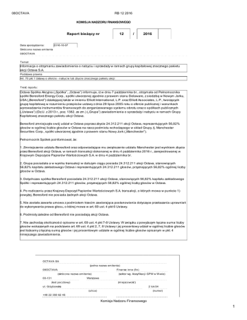 08OCTAVA RB 12 2016 KOMISJA NADZORU FINANSOWEGO Raport bieżący nr 12 / 2016 2016-10-07 Data sporządzenia: Skróc ona nazwa emitenta 08OCTAVA Temat Informacja o otrzymaniu zawiadomienia o nabyciu i sprzedaży w ramach grupy kapitałowej znacznego pakietu akcji Octava S.A. Podstawa prawna Art. 70 pkt 1 Ustawy o oferc ie - nabyc ie lub zbycie znac znego pakietu akcji Treść raportu: Octava Spółka Akcyjna („Spółka”, „Octava”) informuje, iż w dniu 7 października br., otrzymała od Pełnomocnika spółki Beresford Energy Corp., spółki utworzonej zgodnie z prawem stanu Delaware, z siedzibą w Nowym Jorku, USA („Beresford”) działającej także w imieniu Elliott International, L.P. oraz Elliott Associates, L.P., tworzących grupę kapitałową w rozumieniu przepisów ustawy z dnia 29 lipca 2005 roku o ofercie publicznej i warunkach wprowadzania instrumentów finansowych do zorganizowanego systemu obrotu oraz o spółkach publicznych („Ustawa”) (Dz.U. z 2013 r., poz. 1382, ze zm.) („Grupa”) zawiadomienia o sprzedaży i nabyciu w ramach Grupy Kapitałowej znacznego pakietu akcji Octava. Beresford zmniejszyła swój udział w Octava poprzez zbycie 24.312.211 akcji Octava, reprezentujących 56,82% głosów w ogólnej liczbie głosów w Octava na rzecz podmiotu wchodzącego w skład Grupy, tj. Manchester Securities Corp., spółki utworzonej zgodnie z prawem stanu Nowy Jork („Manchester”). Pełnomocnik Spółek poinformował, że: 1. Zmniejszenie udziału Beresford oraz odpowiadające mu zwiększenie udziału Manchester jest wynikiem zbycia przez Beresford akcji Octava, w ramach transakcji dokonanej w dniu 4 października 2016 r., zarejestrowanej w Krajowym Depozycie Papierów Wartościowych S.A. w dniu 4 października br. 2. Grupa posiadała a w wyniku transakcji w dalszym ciągu posiada 24.312.211 akcji Octava, stanowiących 56,82% kapitału zakładowego Octava i reprezentujących 24.312.211 głosów, przyznających 56,82% ogólnej liczby głosów w Octava. 3. Dotychczas spółka Beresford posiadała 24.312.211 akcji Octava, stanowiących 56,82% kapitału zakładowego Spółki i reprezentujących 24.312.211 głosów, przyznających 56,82% ogólnej liczby głosów w Octava. 4. Po rozliczeniu przez Krajowy Depozyt Papierów Wartościowych S.A. transakcji, o których mowa w punkcie 1) powyżej, Beresford nie posiada żadnych akcji Octava. 5. Nie została zawarta umowa z podmiotem trzecim zawierająca postanowienia dotyczące przekazania uprawnień do wykonywania prawa głosu, o której mowa w art. 69 ust. 4 pkt 6 Ustawy. 6. Podmioty zależne od Beresford nie posiadają akcji Octava. 7. Nie zachodzą okoliczności opisane w art. 69 ust. 4 pkt 7-8 Ustawy. W związku z powyższym łączna suma liczby głosów wskazanych na podstawie art. 69 ust. 4 pkt 2, 7, 8 Ustawy i jej procentowy udział w ogólnej liczbie głosów jest tożsamy z łączną sumą głosów i jej procentowym udziale w ogólnej liczbie głosów opisanym w pkt. 4 niniejszego zawiadomienia. OCTAVA SA (pełna nazwa emitenta) Finanse inne (fin) 08OCTAVA (skróc ona nazwa emitenta) 00-131 (sektor wg. klasyfikac ji GPW w W-wie) Warszawa (kod poc ztowy) (miejscowość) ul. Grzybowska 2 lok 54 (ulica) (numer) +48 22 350 62 45 Komisja Nadzoru Finansowego 1 08OCTAVA RB 12 2016 (telefon) (fax) [email protected] www.octava.com.pl (e-mail) (www) 526-10-36-962 010986677 (NIP) (REGON) PODPISY OSÓB REPREZENTUJĄCYCH SPÓŁKĘ Data Imię i Nazwisko Stanowisko/Funkc ja Podpis 2016-10-07 Piotr Rymaszewski Prezes Zarządu Piotr Rymaszewski Komisja Nadzoru Finansowego 2