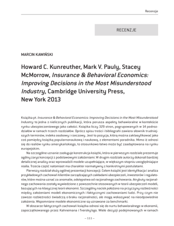 Recenzje RECENZJE Marcin Kawiński Howard C. Kunreuther, Mark V. Pauly, Stacey McMorrow, Insurance & Behavioral Economics: Improving Decisions in the Most Misunderstood Industry, Cambridge University Press, New York 2013 Książka pt. Insurance & Behavioral …conomics: Improving Decisions in the Most Misunderstood Industry to jedna z nielicznych publikacji, która porusza aspekty behawioralne w kontekście rynku ubezpieczeniowego jako całości. Książka liczy 329 stron, pogrupowanych w 14 podrozdziałów w ramach trzech rozdziałów. Oprócz spisu treści i bibliografii zawiera słownik trudniejszych terminów, indeks osobowy i rzeczowy. Jest to pozycja, którą można zaklasyfikować jako coś pomiędzy książką popularnonaukową i naukową, z elementami poradnika. Mimo iż odnosi się do realiów rynku amerykańskiego, to stosunkowo łatwo może być zaadaptowana na rynku europejskim. Na szczególne uznanie zasługuje konstrukcja książki, która w pierwszym rozdziale prezentuje ogólny zarys koncepcji z podstawowymi założeniami. W drugim rozdziale autorzy dokonali bardziej detalicznej analizy oraz wprowadzili modele uzupełniające, w większym stopniu uwzględniające realia. Trzecia część natomiast ma charakter normatywny z konkretnymi postulatami. Pierwszy rozdział służy ogólnej prezentacji koncepcji. Celem książki jest identyfikacja i analiza przykładowych zachowań klientów zarządzających zakładami ubezpieczeń, inwestorów i regulatorów, które można uznać za anomalie, odstępstwa od racjonalnego zachowania. Atrybuty racjonalnego zachowania zostały wywiedzione z powszechnie stosowanych w teorii ubezpieczeń modeli, bazujących na klasycznej teorii ekonomii. Szczególny nacisk położono na przyczyny rozbieżności między założeniami modeli ekonomicznych i faktycznymi zachowaniami ludzi. Przy czym nie zawsze rozbieżności świadczą o braku racjonalności, ale mogą wskazywać na nieodpowiednie założenia. Wspomniane modele ekonomiczne są uznawane za benchmarki. W obszarze faktycznych zachowań książka odnosi się do nurtu behawioralnego w ekonomii, zapoczątkowanego przez Kahnemana i Tversky’ego. Wiele decyzji podejmowanych w ramach – 111 – Wiadomości Ubezpieczeniowe 2/2013 ubezpieczeń, szczególnie po stronie popytowej, wykorzystuje system 1, który jest trybem automatycznym szybkiego podejmowania decyzji bez intencjonalnej głębszej analizy. Wynika to najczęściej z niepewności. Mało dostępna wiedza na temat ryzyka i jego konsekwencji jest i tak trudno przyswajalna z powodu niełatwej materii, ale również sposobu jej prezentacji. Książka zbiera i porządkuje różne teorie, modele i wyniki badań, które powstały w tym nurcie. Autorzy dla zwiększenia przystępności książki posługują się licznymi przykładami nieracjonalnych zachowań klientów, osób zarządzających zakładami ubezpieczeń, inwestorów i regulatorów. Ciekawym przykładem jest ryzyko terrorystyczne, które mimo wcześniejszych zdarzeń zostało dostrzeżone przez zakłady ubezpieczeń i reasekuratorów dopiero po ataku na World Trade Center 11 września 2001 r. Przy czym reakcja ta była mocno przesadzona, gdyż w wielu przypadkach wysokość składki lub koszt reasekuracji nie miały pokrycia w dostępnych danych. Wynikało to jednak również z zachowania inwestorów, którzy w przypadku zaangażowania w ubezpieczenia na wypadek terroru oczekiwali stopy zwrotu ponad dwukrotnie przekraczających standardową premię za ryzyko. W ubezpieczeniach na wypadek żywiołów zdarzało się, że składki były niedoszacowane przez ubezpieczycieli, a gdy nastąpiło urealnienie wysokości składek, władze stanowe (Floryda) dla podtrzymania i tak niskiego wskaźnika penetracji powołały do życia specjalny fundusz katastrofalny, pełniący funkcję reasekuratora, oraz publiczny zakład ubezpieczeń oferujący ochronę na preferencyjnych warunkach, nawet na obszar o ponadstandardowym ryzyku. Oprócz tego stosowano kontrolę cen ubezpieczeń katastrofalnych oraz wprowadzono limity nieprzedłużania polis katastrofalnych. Wszystkie te działania odniosły wątpliwą skuteczność. Cały czas towarzyszyło temu zjawisko rezygnacji klientów indywidualnych z ubezpieczeń po kilku latach bezszkodowych, co w dłuższym okresie może mieć wręcz katastrofalne skutki finansowe dla całego regionu. Ocena zachowań uczestników rynku ubezpieczeniowego opiera się na odniesieniu do okreś lonych benchmarków. Benchmarkiem, punktem wyjścia, dla strony podażowej jest model maksymalizacji oczekiwanego zysku (profit-maximizing model of supply). Z kolei odnośnikiem dla strony popytowej jest powszechnie akceptowany model użyteczności oczekiwanej (expected utility model). Warunkami wstępnymi racjonalnych zachowań są: odpowiednia sytuacja na rynku, tj. adekwatna składka ubezpieczeniowa (oczekiwana strata powiększona o uzasadnione narzuty i godziwy zysk) oraz odpowiedni wskaźnik powszechności dla ubezpieczeń dobrowolnych (udział ubezpieczonych w odniesieniu do potencjalnych klientów). Według autorów wskaźnik narzutu (czyli jeden minus oczekiwana strata podzielona przez składkę brutto) powinien się wahać miądzy 30 proc. a 40 proc., wskaźnik powszechności natomiast powinien wynosić co najmniej 70 proc. Dla Stanów Zjednoczonych przedstawiono trzy przykłady produktów ubezpieczeniowych spełniających wstępne kryteria, tj. ubezpieczenie autocasco, ubezpieczenie wyposażenia domu albo mieszkania oraz terminowe ubezpieczenie na wypadek śmierci. W drugim rozdziale książki podjęto próbę wytłumaczenia przyczyn pojawiania się anomalii. Jako pierwszy czynnik wymieniony został koszt poszukiwania i przyswojenia informacji. Ponadto autorzy sugerują, że konsumenci analizują całkowitą oczekiwaną użyteczność i jeżeli nabycie konkretnego ubezpieczenia nie zmienia znacząco tej wartości, to brak działań uznają za uzasadniony i racjonalny. Brak od