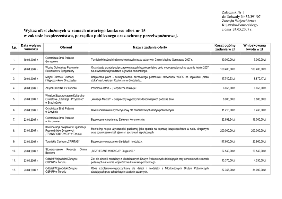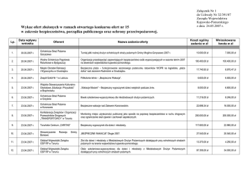 Wykaz ofert złożonych w ramach otwartego konkursu ofert nr 15 w zakresie bezpieczeństwa, porządku publicznego oraz ochrony przeciwpożarowej. Lp. Data wpływu wniosku 1. 30.03.2007 r. Ochotnicza Straż Pożarna Goryszewo Turniej piłki nożnej drużyn ochotniczych straży pożarnych Gminy Mogilno-Goryszewo 2007 r. 2. 20.04.2007 r. Wodne Ochotnicze Pogotowie Ratunkowe w Bydgoszczy 3. 20.04.2007 r. 4. Załącznik Nr 1 do Uchwały Nr 32/391/07 Zarządu Województwa Kujawsko-Pomorskiego z dnia 24.05.2007 r. Koszt ogólny zadania w zł Wnioskowana kwota w zł 10.000,00 zł 7.000,00 zł Organizacja przedsięwzięć zapewniających bezpieczeństwo osób wypoczywających w sezonie letnim 2007 na akwenach województwa kujawsko-pomorskiego. 100.400,00 zł 100.400,00 zł Miejski Ośrodek Rekreacji i Wypoczynku w Grudziądzu Bezpieczna plaża – funkcjonowanie sezonowego posterunku ratowników WOPR na kąpielisku „plaża dzika” nad Jeziorem Rudnickim w Grudziądzu. 17.740,93 zł 8.870,47 zł 20.04.2007 r. Zespół Szkół Nr 1 w Lubiczu Półkolonie letnie – „Bezpieczne Wakacje”. 6.655,00 zł 6.655,00 zł 5. 23.04.2007 r. Wiejskie Stowarzyszenie KulturalnoOświatowe „Edukacja i Przyszłość” w Brąchnówku „Wakacje Marzeń” – Bezpieczny wypoczynek dzieci wiejskich podczas żniw. 8.000,00 zł 6.800,00 zł 6. 23.04.2007 r. Ochotnicza Straż Pożarna w Grzybnie Biwak szkoleniowo-wypoczynkowy dla młodzieżowych drużyn pożarniczych. 11.216,00 zł 8.246,00 zł 7. 23.04.2007 r. Ochotnicza Straż Pożarna w Koronowie Bezpieczne wakacje nad Zalewem Koronowskim. 22.698,34 zł 16.000,00 zł 8. 23.04.2007 r. Konfederacja Związków i Organizacji Przewoźników Drogowych „TRANSPORTOWCY” w Toruniu Monitoring miejsc użyteczności publicznej jako sposób na poprawę bezpieczeństwa w ruchu drogowym oraz ograniczenie skali zjawisk i zachowań aspołecznych. 200.000,00 zł 200.000,00 zł 9. 23.04.2007 r. Toruńskie Centrum „CARITAS” Bezpieczny wypoczynek dla dzieci i młodzieży. 117.600,00 zł 22.960,00 zł 10. 23.04.2007 r. Stowarzyszenie Boniewo „BEZPIECZNE WAKACJE” Długie 2007. 27.540,00 zł 20.540,00 zł 11. 23.04.2007 r. Oddział Wojewódzki Związku OSP RP w Toruniu Zlot dla dzieci i młodzieży z Młodzieżowych Drużyn Pożarniczych działających przy ochotniczych strażach pożarnych na terenie województwa kujawsko-pomorskiego. 13.370,00 zł 4.250,00 zł 12. 23.04.2007 r. Oddział Wojewódzki Związku OSP RP w Toruniu Obóz szkoleniowo-wypoczynkowy dla dzieci i młodzieży z Młodzieżowych Drużyn Pożarniczych działających przy ochotniczych strażach pożarnych. 87.356,00 zł 34.000,00 zł Oferent Rozwoju Nazwa zadania-oferty Gminy 13. 23.04.2007 r. Towarzystwo Przyjaciół Dzieci Zarząd Okręgowy w Toruniu Obóz wypoczynkowy w Człuchowie. 14. 23.04.2007 r. Towarzystwo Przyjaciół Dzieci Oddział Miejski w Bydgoszczy Obóz – warsztaty terapeutyczno-taneczne w Międzywodziu. 15. 23.04.2007 r. Stowarzyszenie na Rzecz Rozwoju Powiatu Bydgoskiego „Bezpieczna woda – bezpieczny las”. 16. 23.04.2007 r. Brodnickie Centrum Caritas im. Biskupa Jana Chrapka 17. 23.04.2007 r. 18. 114.445,00 zł 21.000,00 zł 26.600,00 zł 9.000,00 zł 7.000,00 zł 4.000,00 zł Wakacje z Kopernikiem. 88.400,40 zł 16.000,00 zł Towarzystwo Przyjaciół Dzieci Oddział Miejski w Bydgoszczy Organizacja bezpiecznego wypoczynku dzieci i młodzieży. Półkolonie – wypoczynek w miejscu zamieszkania. 24.000,00 zł 8.000,00 zł 23.04.2007 r. Towarzystwo Przyjaciół Dzieci Oddział Miejski w Bydgoszczy Obóz – warsztaty terapeutyczno - artystyczne – teart, plastyka, rękodzieło. 26.600,00 zł 9.000,00 zł 19. 23.04.2007 r. Miejsko-Gminny Ośrodek Kultury w Kowalewie Pomorskim „Spokojni rodzice – bezpieczne dziecko”. 5.900,00 zł 3.900,00 zł 20. 23.04.2007 r. Gminny Klub Sportowy „Myśliwiec” w Gostycynie Bezpieczna woda. 10.200,00 zł 8.160,00 zł 21. 23.04.2007 r. Zespół Szkół Gimnazjum i Liceum Ogólnokształcące w Dobrzejewicach Konkurs wiedzy o ochronie przeciwpożarowej. 6.568,00 zł 5.918,00 zł 22. 23.04.2007 r. Fundacja Kultury „YAKIZA” w Bydgoszczy Bezpieczne wakacje nad jeziorem Bysławskim. 14.750,00 zł 13.220,00 zł 23. 23.04.2007 r. Stowarzyszenie Inicjatywa Stolno „Bezpieczne żniwa”. 17.767,00 zł 7.132,00 zł Załącznik Nr 2 do Uchwały Nr 32/391/07 Zarządu Województwa Kujawsko-Pomorskiego z dnia 24.05.2007 r. Wykaz ofert niespełniających wymogów formalnych, złożonych w konkursie nr 15/2007 w zakresie bezpieczeństwa, porządku publicznego oraz ochrony przeciwpożarowej. Lp. Data wpływu wniosku Oferent Nazwa zadania-oferty Koszt ogólny zadania w zł Wnioskowana kwota w zł 10.000,00 zł 7.000,00 zł 6.655,00 zł 6.655,00 zł 1. 30.03.2007 r. Ochotnicza Straż Pożarna Goryszewo Turniej piłki nożnej drużyn ochotniczych straży pożarnych Gminy Mogilno-Goryszewo 2007 r. 2. 20.04.2007 r. Zespół Szkół Nr 1 w Lubiczu Półkolonie letnie – „Bezpieczne Wakacje”. 3. 23.04.2007 r. Konfederacja Związków i Organizacji Przewoźników Drogowych „TRANSPORTOWCY” w Toruniu Monitoring miejsc użyteczności publicznej jako sposób na poprawę bezpieczeństwa w ruchu drogowym oraz ograniczenie skali zjawisk i zachowań aspołecznych. 200.000,00 zł 200.000,00 zł 4. 23.04.2007 r. Oddział Wojewódzki Związku OSP RP w Toruniu Zlot dla dzieci i młodzieży z Młodzieżowych Drużyn Pożarniczych działających przy ochotniczych strażach pożarnych na terenie województwa kujawsko-pomorskiego. 13.370,00 zł 4.250,00 zł 5. 23.04.2007 r. Oddział Wojewódzki Związku OSP RP w Toruniu Obóz szkoleniowo-wypoczynkowy dla dzieci i młodzieży z Młodzieżowych Drużyn Pożarniczych działających przy ochotniczych strażach pożarnych. 87.356,00 zł 34.000,00 zł 6. 23.04.2007 r. Stowarzyszenie na Rzecz Rozwoju Powiatu Bydgoskiego „Bezpieczna woda – bezpieczny las”. 7.000,00 zł 4.000,00 zł Wykaz ofert wybranych do realizacji,