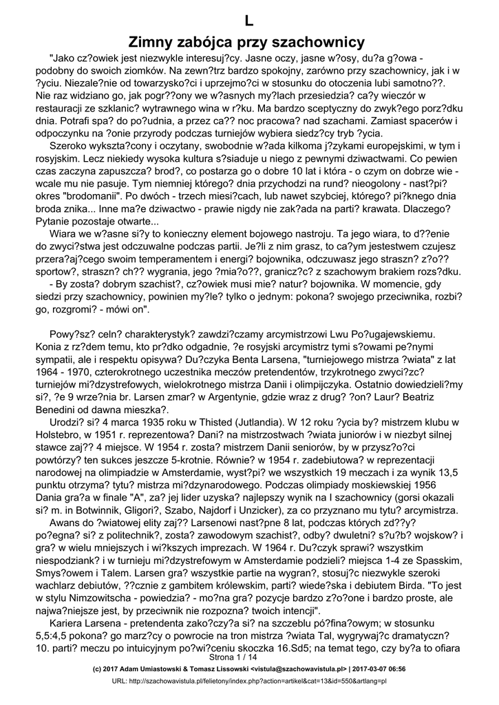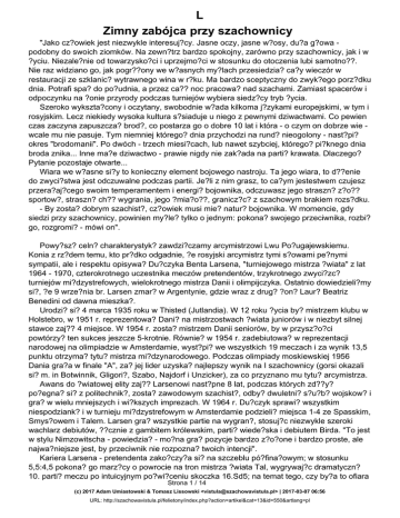 L Zimny zabójca przy szachownicy "Jako cz?owiek jest niezwykle interesuj?cy. Jasne oczy, jasne w?osy, du?a g?owa podobny do swoich ziomków. Na zewn?trz bardzo spokojny, zarówno przy szachownicy, jak i w ?yciu. Niezale?nie od towarzysko?ci i uprzejmo?ci w stosunku do otoczenia lubi samotno??. Nie raz widziano go, jak pogr??ony we w?asnych my?lach przesiedzia? ca?y wieczór w restauracji ze szklanic? wytrawnego wina w r?ku. Ma bardzo sceptyczny do zwyk?ego porz?dku dnia. Potrafi spa? do po?udnia, a przez ca?? noc pracowa? nad szachami. Zamiast spacerów i odpoczynku na ?onie przyrody podczas turniejów wybiera siedz?cy tryb ?ycia. Szeroko wykszta?cony i oczytany, swobodnie w?ada kilkoma j?zykami europejskimi, w tym i rosyjskim. Lecz niekiedy wysoka kultura s?siaduje u niego z pewnymi dziwactwami. Co pewien czas zaczyna zapuszcza? brod?, co postarza go o dobre 10 lat i która - o czym on dobrze wie wcale mu nie pasuje. Tym niemniej którego? dnia przychodzi na rund? nieogolony - nast?pi? okres "brodomanii". Po dwóch - trzech miesi?cach, lub nawet szybciej, którego? pi?knego dnia broda znika... Inne ma?e dziwactwo - prawie nigdy nie zak?ada na parti? krawata. Dlaczego? Pytanie pozostaje otwarte... Wiara we w?asne si?y to konieczny element bojowego nastroju. Ta jego wiara, to d??enie do zwyci?stwa jest odczuwalne podczas partii. Je?li z nim grasz, to ca?ym jestestwem czujesz przera?aj?cego swoim temperamentem i energi? bojownika, odczuwasz jego straszn? z?o?? sportow?, straszn? ch?? wygrania, jego ?mia?o??, granicz?c? z szachowym brakiem rozs?dku. - By zosta? dobrym szachist?, cz?owiek musi mie? natur? bojownika. W momencie, gdy siedzi przy szachownicy, powinien my?le? tylko o jednym: pokona? swojego przeciwnika, rozbi? go, rozgromi? - mówi on". Powy?sz? celn? charakterystyk? zawdzi?czamy arcymistrzowi Lwu Po?ugajewskiemu. Konia z rz?dem temu, kto pr?dko odgadnie, ?e rosyjski arcymistrz tymi s?owami pe?nymi sympatii, ale i respektu opisywa? Du?czyka Benta Larsena, "turniejowego mistrza ?wiata" z lat 1964 - 1970, czterokrotnego uczestnika meczów pretendentów, trzykrotnego zwyci?zc? turniejów mi?dzystrefowych, wielokrotnego mistrza Danii i olimpijczyka. Ostatnio dowiedzieli?my si?, ?e 9 wrze?nia br. Larsen zmar? w Argentynie, gdzie wraz z drug? ?on? Laur? Beatriz Benedini od dawna mieszka?. Urodzi? si? 4 marca 1935 roku w Thisted (Jutlandia). W 12 roku ?ycia by? mistrzem klubu w Holstebro, w 1951 r. reprezentowa? Dani? na mistrzostwach ?wiata juniorów i w niezbyt silnej stawce zaj?? 4 miejsce. W 1954 r. zosta? mistrzem Danii seniorów, by w przysz?o?ci powtórzy? ten sukces jeszcze 5-krotnie. Równie? w 1954 r. zadebiutowa? w reprezentacji narodowej na olimpiadzie w Amsterdamie, wyst?pi? we wszystkich 19 meczach i za wynik 13,5 punktu otrzyma? tytu? mistrza mi?dzynarodowego. Podczas olimpiady moskiewskiej 1956 Dania gra?a w finale "A", za? jej lider uzyska? najlepszy wynik na I szachownicy (gorsi okazali si? m. in Botwinnik, Gligori?, Szabo, Najdorf i Unzicker), za co przyznano mu tytu? arcymistrza. Awans do ?wiatowej elity zaj?? Larsenowi nast?pne 8 lat, podczas których zd??y? po?egna? si? z politechnik?, zosta? zawodowym szachist?, odby? dwuletni? s?u?b? wojskow? i gra? w wielu mniejszych i wi?kszych imprezach. W 1964 r. Du?czyk sprawi? wszystkim niespodziank? i w turnieju mi?dzystrefowym w Amsterdamie podzieli? miejsca 1-4 ze Spasskim, Smys?owem i Talem. Larsen gra? wszystkie partie na wygran?, stosuj?c niezwykle szeroki wachlarz debiutów, ??cznie z gambitem królewskim, parti? wiede?ska i debiutem Birda. "To jest w stylu Nimzowitscha - powiedzia? - mo?na gra? pozycje bardzo z?o?one i bardzo proste, ale najwa?niejsze jest, by przeciwnik nie rozpozna? twoich intencji". Kariera Larsena - pretendenta zako?czy?a si? na szczeblu pó?fina?owym; w stosunku 5,5:4,5 pokona? go marz?cy o powrocie na tron mistrza ?wiata Tal, wygrywaj?c dramatyczn? 10. parti? meczu po intuicyjnym po?wi?ceniu skoczka 16.Sd5; na temat tego, czy by?a to ofiara Strona 1 / 14 (c) 2017 Adam Umiastowski & Tomasz Lissowski <[email protected]> | 2017-03-07 06:56 URL: http://szachowavistula.pl/felietony/index.php?action=artikel&cat=13&id=550&artlang=pl L poprawna, dyskusje w prasie fachowej toczy?y si? jeszcze przez d?ugie miesi?ce... Rewelacyjne rezultaty zanotowa? Du?czyk w drugiej po?owie 1967 roku. Najpierw wygra? memoria? Capablanki w Hawanie, nast?pnie podzieli? 1-2 miejsce z Darg? w Winnipeg, pó?niej z du?? przewag? wygra? turniej mi?dzystrefowy w Tunezji (z którego wycofa? si? Fischer po rozegraniu 10 rund) i na koniec zwyci??y? w Palma de Mallorca, wyprzedzaj?c Smys?owa, Botwinnika, Portischa, Gligori?a i Ivkova. Oto jak widzieli Larsena dwaj jego konkurenci: "O ile gra Fischera jest wyj?tkowo jasna, to plany Larsena prawie zawsze s? zawoalowane, a jego idee opieraj? si? na drobnych taktycznych niuansach. Czyni go to nie mniej gro?nym od Fischera" - twierdzi? Jefim Geller. "Repertuar debiutowy Larsena zawsze by? urozmaicony, ale teraz on go jeszcze bardzie pog??bi? i dopasowa?, je?li mo?na tak powiedzie? - do swego stylu gry. G?ówn? cech? nowego podej?cia Larsena do szachów sta?o si? subtelne rozgrywanie ko?cówek. Technika gry ko?cowej jest obecnie wa?nym atutem w r?kach Larsena" - pisa? Mark Tajmanow po turnieju w Hawanie. Bent nie kry? swego optymizmu przez rozgrywkami ósemki pretendentów - zreszt? zawsze mówi? to, co my?la?. Zapowiedzia?, ?e to on oka?e si? najlepszy i ?e b?dzie przeciwnikiem Petrosjana w meczu o mistrzostwo ?wiata. Te prognozy nie sprawdzi?y si?. Wprawdzie w ?wier?finale Larsen pokona? Portischa, ale w pó?finale natrafi? na b?d?cego w ?yciowej formie Spasskiego, przegra? trzy pierwsze partie meczu w Malm? i oczywi?cie nie móg? ju? odrobi? strat. Mecz reprezentacji "Reszty ?wiata" z brygad? najlepszych szachistów ZSRR (Belgrad, marzec - kwiecie? 1970) by? jednym z najwi?kszych wydarze? tamtej epoki. Do stolicy Jugos?awii, której do?ywotnim prezydentem by? marsza?ek Josip Broz -