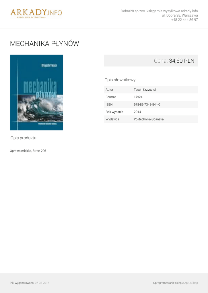 Dobra28 sp zoo. księgarnia wysyłkowa arkady.info ul. Dobra 28, Warszawa +48 22 444 86 97 MECHANIKA PŁYNÓW Cena: 34,60 PLN Opis słownikowy Autor Tesch Krzysztof Format 17x24 ISBN 978-83-7348-544-0 Rok wydania 2014 Wydawca Politechnika Gdańska Opis produktu Oprawa miękka, Stron 296 Plik wygenerowano: 07-03-2017 Powered by TCPDF (www.tcpdf.org) Oprogramowanie sklepu: AptusShop