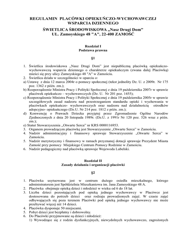 REGULAMIN PLACÓWKI OPIEKUŃCZO-WYCHOWAWCZEJ WSPARCIA DZIENNEGO ŚWIETLICA ŚRODOWISKOWA „Nasz Drugi Dom” UL. Zamoyskiego 48 "A", 22-400 ZAMOŚĆ Rozdział I Podstawa prawna §1 1. Świetlica środowiskowa „Nasz Drugi Dom” jest niepubliczną placówką opiekuńczowychowawczą wsparcia dziennego o charakterze opiekuńczym (zwana dalej Placówką) mieści się przy ulicy Zamoyskiego 48 "A" w Zamościu. 2. Świetlica działa w szczególności w oparciu o: a) Ustawę z dnia 12 marca 2004r o pomocy społecznej (tekst jednolity Dz. U. z 2009r. Nr 175 poz. 1362 z późn. zm.); b) Rozporządzenie Ministra Pracy i Polityki Społecznej z dnia 19 października 2007r w sprawie placówek opiekuńczo – wychowawczych (Dz. U. Nr 201 poz. 1455); c) Rozporządzenie Ministra Pracy i Polityki Społecznej z dnia 19 października 2005r w sprawie szczegółowych zasad nadzoru nad przestrzeganiem standardu opieki i wychowania w placówkach opiekuńczo- wychowawczych oraz nadzoru nad działalnością ośrodków adopcyjno- opiekuńczego (Dz.U. Nr 214 poz. 1812 z późn. zm.); d) Konwencję o Prawach Dziecka przyjętej przez Zgromadzenie Ogólne Narodów Zjednoczonych z dnia 20 listopada 1989r. (Dz.U. z 1991r Nr 120 poz. 526 wraz z późn. zm.); e) Statut Stowarzyszenia ,,Otwarte Serca” nr KRS 0000116953. 3. Organem prowadzącym placówkę jest Stowarzyszenie „Otwarte Serca” w Zamościu. 4. Nadzór administracyjny i finansowy sprawuje Stowarzyszenie „Otwarte Serca” w Zamościu. 5. Nadzór merytoryczny i finansowy w ramach przyznanej dotacji sprawuje Prezydent Miasta Zamość przy pomocy Miejskiego Centrum Pomocy Rodzinie w Zamościu. 6. Nadzór pedagogiczny nad placówką sprawuje Wojewoda Lubelski. Rozdział II Zasady działania i organizacji placówki §2 1. Placówka usytuowana jest w centrum dużego osiedla mieszkalnego, którego administratorem jest Spółdzielnia Mieszkaniowa im. Jana Zamoyskiego 48 A. 2. Placówka obejmuje opieką dzieci i młodzież w wieku od 6 do 18 lat. 3. Liczba dzieci pozostających pod opieką jednego wychowawcy w Placówce jest dostosowana do potrzeb dzieci oraz rodzaju prowadzonych zajęć. W czasie zajęć odbywających się poza terenem Placówki pod opieką jednego wychowawcy nie może przebywać więcej niż 14 dzieci. 4. Placówka dysponuje 50 miejscami. 5. Pobyt dzieci jest bezpłatny i dobrowolny. 6. Do Placówki przyjmowane są dzieci i młodzież: 1) Wywodzące się z rodzin dysfunkcyjnych, niewydolnych wychowawczo, zagrożonych patologią społeczną, demoralizacją, przestępczością, uzależnieniami, wykluczeniem społecznym; 2) Pochodzące z rodzin o niskim standardzie materialno- bytowym; 3) Z rodzin wielodzietnych i niepełnych; 4) Z utrudnioną socjalizacją; 5) Pozostające bez opieki rodziców w godzinach popołudniowych; 6) Wyrażające chęć uczestniczenia w różnego rodzaju zajęciach. 7. Do placówki dzieci i młodzież kierowane są przez rodziców, pedagogów szkolnych, wychowawców, pracowników MCPR oraz zgłaszają się indywidualnie. 8. Placówka jest czynna przez cały rok we wszystkie robocze dni tygodnia w godzinach od 13.00 do 18.00, a w dni wolne od nauki szkolne w godzinach od 9.00 do 14.00 prowadzona przez Stowarzyszenie „Otwarte Serca” w Zamościu przy ul. Zamoyskiego 48A. 9. Placówka zapewnia dzieciom i młodzieży: 1) Pomoc w nauce; 2) Pomoc w rozwiązywaniu problemów rówieśniczych, szkolnych; 3) Organizację czasu wolnego poprzez rozwój zainteresowań, organizację zajęć i zabaw sportowych; 4) Stałą pracę z rodziną dziecka; 5) Dożywianie; 6) W miarę potrzeb odzież i żywność; 7) Inne zajęcia dostosowane do potrzeb dzieci w niej przebywających. 10. W placówce działa stały Zespół do spraw okresowej oceny sytuacji wychowanka. §3 1. Kwalifikacja dzieci do Placówki dokonywana jest przez stały zespół ds. okresowej oceny sytuacji dziecka. 2. W skład zespołu wchodzą: 1) Kierownik placówki lub osoba przez niego wyznaczona; 2) Wychowawca zatrudniony przez Stowarzyszenie; 3) Pracownik socjalny zatrudniony w Stowarzyszeniu. 3. Do zadań zespołu należy: 1) Kwalifikacja dzieci do placówki,; 2) Analiza kart pobytu dziecka; 3) Ustalenie aktualnej sytuacji rodzinnej dziecka; 4) Ocena stanu zdrowia dziecka i jego aktualnych potrzeb; 5) Ocena zasadności dalszego pobytu dziecka w placówce. 6) Analiza stosowanych metod pracy z dzieckiem. 4. Zespół zbiera się w zależności od potrzeb nie rzadziej jednak niż raz na pół roku. 5. W posiedzeniu zespołu mogą uczestniczyć przedstawiciele MCPR- pracownicy socjalni, Policji, instytucji oświatowych oraz organizacji społecznych statutowo zajmujących się problematyką rodziny i dziecka- lekarz, pielęgniarka, a także osoby bliskie dziecku. Rozdział III Cele i zadania §4 1. Placówka sprawuje dzienną opiekę nad dziećmi i młodzieżą, mającą na celu wspieranie rodziny przez objęcie wychowanka działaniami wychowawczymi, opiekuńczymi i edukacyjnymi. 2. Placówka współpracuje z rodziną i realizuje następujące zadania poprzez: 1) Udzielanie pomocy w sytuacjach kryzysowych, w rozwiązywaniu problemów rówieśniczych, szkolnych i osobistych dziecka; 2) Wyrównywanie deficytów szkolnych; 3) Pomoc w nauce; 4) Korygowanie niewłaściwych zachowań we wzajemnych relacjach dzieci; 5) Uczenie nawiązywania więzi uczuciowych oraz związków interpersonalnych; 6) Dbałość o poszanowanie i podtrzymanie związków emocjonalnych dziecka z rodzicami, rodzeństwem i z innymi osobami; 7) Uczenie poszanowania tradycji i ciągłości kulturowej; 8) Kształtowanie u dzieci nawyków i uczenie zachowań prozdrowotnych; 9) Przygotowywanie dzieci do ponoszenia odpowiedzialności za własne postępowanie oraz uczenia samodzielności w życiu; 10) Uczenie planowania i organizowania codziennych zajęć stosownie do wieku dziecka; 11) Organizowanie czasu wolnego, rozwoju zainteresowań, organizacja zabaw i zajęć sportowych, imprez rekreacyjno- turystycznych,