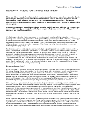 Artykuł pobrano ze strony eioba.pl Nowotwory - leczenie naturalne bez magii i mitów Mimo szerokiego rozwoju farmakoterapii nie radzimy sobie skutecznie z leczeniem większości chorób przewlekłych. Ich występowanie wzrasta lawinowo i dotyka coraz to młodszych pacjentów. Powoli zmierzamy do ideału populacji pracującej na rzecz koncernów farmaceutycznych i towarzystw ubezpieczeniowych, która powinna leczyć się niemal od momentu poczęcia i umierać w roku przejścia na emeryturę. Wszechobecne reklamy wmawiają nam, że na wszystko znajdzie się jakaś tabletka, a producenci tzw. suplementów czarują, że mają jedną tabletkę na wszystko. Najwięcej zamieszania robią „cudowne” naturalne leki przeciwnowotworowe. Wynika to z potrzeb rynku – liczba zachorowań na nowotwory stale wzrasta, zaś lęk przed zachorowaniem paraliżuje coraz szersze kręgi społeczeństw. Według danych Międzynarodowej Unii Walki z Rakiem „… wzrastająca liczba zachorowań na nowotwory złośliwe jest problemem całej Europy. Statystyki są alarmujące: w 2004 r. odnotowano prawie 3 miliony nowych zachorowań i 1,7 tys. zgonów z powodu raka. Mimo przeznaczania coraz większych środków na badania, wiedza o przyczynach tej choroby jest wciąż niewystarczająca, by prowadzić skuteczną profilaktykę i terapię …” Popyt na nowotworowe antidota jest więc zrozumiały. Są to najczęściej pojedyncze zioła lub mieszanki ziołowe, często o egzotycznym pochodzeniu, sprzedawane po absurdalnie wysokich cenach w tzw. systemie sprzedaży bezpośredniej, zwanej też sprzedażą sieciową, czyli po prostu poprzez domokrążnych handlarzy. Zioła te, co prawda nie mają bezpośredniego wpływu na niszczenie komórek nowotworowych, ale korzystnie oddziałują na czynność przewodu pokarmowego, nie szkodzą, a ich koszt uruchamia u chorego dodatkowe efekty „psychoterapeutyczne”. Nie oznacza to jednak, że w leczeniu tak dramatycznie przebiegających schorzeń, jak nowotwory nie ma miejsca na leczenie naturalne. Przeciwnie, naturalne leczenie powinno towarzyszyć choremu w czasie chemio i radioterapii, a także po jej zakończeniu. Żeby to lepiej zrozumieć trzeba wyjaśnić, skąd się biorą nowotwory i jak dochodzi do choroby nowotworowej. Jak powstaje nowotwór? Współczesna wiedza medyczna nie pozwala jednoznacznie ustalić przyczyny powstawania chorób nowotworowych. Nie wiemy, dlaczego tkanka zaczyna odnawiać się w formie guza, który rozrasta się w sposób niepohamowany. Znamy jednakże istotne mechanizmy, w jakich dochodzi do tworzenia się zmian nowotworowych. Otóż, współcześnie uważa się, że komórki nowotworowe powstają w wyniku mutacji nośników informacji genetycznej, kwasów dezoksyrybonukleinowych, skrótem nazywanych DNA. Pod wpływem takiej mutacji komórka określonej tkanki przeistacza się w słabo zróżnicowaną, szybko namnażającą się komórkę nowotworową. Mnożąc się taka komórka buduje masę guza nowotworowego, który niewiele przypomina tkankę, z której się wywodzi. Wśród czynników odpowiedzialnych za powstawanie mutacji najważniejszy udział ma ją wolne rodniki tlenowe, określane skrótem WRT. Mianem wolnego rodnika, określamy atom lub cząsteczkę zawierającą przynajmniej jeden niesparowany elektron. Wolny rodnik jest tworem niestabilnym i wysoce reaktywnym. Posiada zdolność przyłączania elektronu z otaczających go cząsteczek, co często wiąże się ze zmianą własności biochemicznych tej cząsteczki. Najczęściej mamy do czynienia z wolnymi rodnikami zawierającymi w swej budowie tlen. Są to cząstki bardzo nietrwałe, często istniejące jedynie przez drobny ułamek sekundy, ale ten drobny ułamek z powodzeniem wystarcza, aby doprowadzić do rozległych zniszczeń struktury komórek, w tym również struktury DNA, co inicjuje mutacje. Wolne rodniki tlenowe wytwarzane są stale w niewielkich ilościach przez wszystkie komórki naszego organizmu. Są one jednak szybko unieczynniane przez nasz własny, czyli endogenny system antyoksydantów, zwanych inaczej wymiataczami wolnych rodników. Oczywiście sprawność tego systemu nie jest jednakowa u każdego człowieka i prawdopodobnie dziedziczy się z pokolenia na pokolenie. Ponadto, ulega ona „zużyciu” wraz z postępującym starzeniem organizmu. Oznacza to, że ludzie młodzi rzadziej ulegają wolnorodnikowymi uszkodzeniom niż osoby starsze, czyli, że ryzyko wystąpienia u nich nowotworów jest mniejsze. I rzeczywiście, statystyki medyczne wykazują znacznie wyższą zapadalność na choroby nowotworowe po 50 roku życia. Wiemy już, że nowotwory powstają w wyniku mutacji naszych własnych komórek tkankowych i że za powstawanie tych mutacji odpowiedzialne są wolne rodniki tlenowe. Wiemy również, że endogenne antyoksydanty dezaktywują powstające WRT i w ten sposób chronią nasze tkanki przed ich uszkadzającym wpływem. Ryzyko (R) wystąpienia mutacji nowotworowych jest więc wprost proporcjonalne do ilości wolnych rodników (WRT) i odwrotnie proporcjonalne do aktywności endogennej obrony antyoksydacyjnej (WWRT). Gdyby wielkości te dały się mierzyć, to ich zależność przedstawiałby wzór: R = WRT / WWRT Innymi słowy, zagrożenie rozwojem nowotworu powstaje wówczas, gdy ilość wytwarzanych wolnych rodników tlenowych przekracza możliwości obrony antyoksydacyjnej. Dzieje się tak wtedy, gdy w organizmie toczą się przewlekłe procesy zapalne, którym towarzyszy destrukcja tkanek, ponieważ wolne rodniki uwalniane są w dużych ilościach podczas rozpadu komórek. Im większe jest uszkodzenie, tym większa ilość wolnych rodników uwalniana jest do otaczającego środowiska. Wielkie uszkodzenia tkanek spowodowane na przykład przez promienie gamma powodują uwalnianie ogromnych ilości tych rodników, są więc obarczone szczególnie wysokim ryzykiem powstania nowotworu. Smutne obserwacje historii wybuchów nuklearnych doskonale ilustruj
