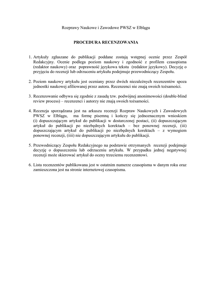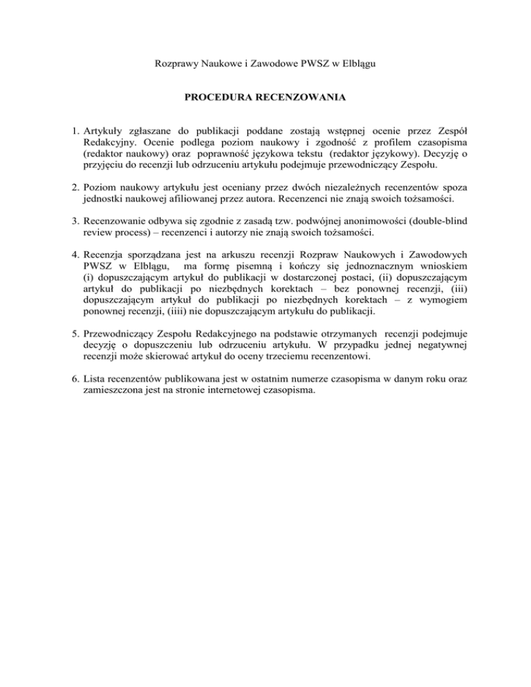 Rozprawy Naukowe i Zawodowe PWSZ w Elblągu PROCEDURA RECENZOWANIA 1. Artykuły zgłaszane do publikacji poddane zostają wstępnej ocenie przez Zespół Redakcyjny. Ocenie podlega poziom naukowy i zgodność z profilem czasopisma (redaktor naukowy) oraz poprawność językowa tekstu (redaktor językowy). Decyzję o przyjęciu do recenzji lub odrzuceniu artykułu podejmuje przewodniczący Zespołu. 2. Poziom naukowy artykułu jest oceniany przez dwóch niezależnych recenzentów spoza jednostki naukowej afiliowanej przez autora. Recenzenci nie znają swoich tożsamości. 3. Recenzowanie odbywa się zgodnie z zasadą tzw. podwójnej anonimowości (double-blind review process) – recenzenci i autorzy nie znają swoich tożsamości. 4. Recenzja sporządzana jest na arkuszu recenzji Rozpraw Naukowych i Zawodowych PWSZ w Elblągu, ma formę pisemną i kończy się jednoznacznym wnioskiem (i) dopuszczającym artykuł do publikacji w dostarczonej postaci, (ii) dopuszczającym artykuł do publikacji po niezbędnych korektach – bez ponownej recenzji, (iii) dopuszczającym artykuł do publikacji po niezbędnych korektach – z wymogiem ponownej recenzji, (iiii) nie dopuszczającym artykułu do publikacji. 5. Przewodniczący Zespołu Redakcyjnego na podstawie otrzymanych recenzji podejmuje decyzję o dopuszczeniu lub odrzuceniu artykułu. W przypadku jednej negatywnej recenzji może skierować artykuł do oceny trzeciemu recenzentowi. 6. Lista recenzentów publikowana jest w ostatnim numerze czasopisma w danym roku oraz zamieszczona jest na stronie internetowej czasopisma.