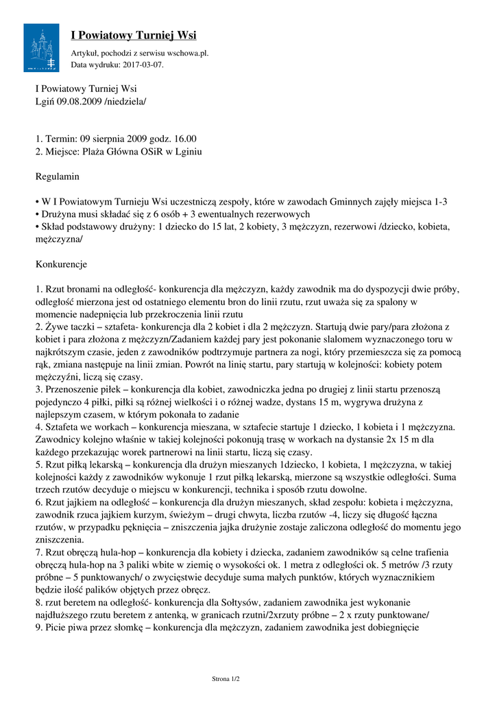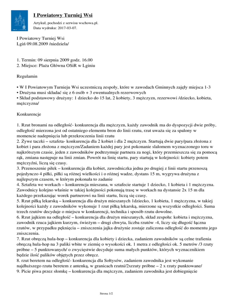 I Powiatowy Turniej Wsi Artykuł‚ pochodzi z serwisu wschowa.pl. Data wydruku: 2017-03-07. I Powiatowy Turniej Wsi Lgiń 09.08.2009 /niedziela/ 1. Termin: 09 sierpnia 2009 godz. 16.00 2. Miejsce: Plaża Główna OSiR w Lginiu Regulamin • W I Powiatowym Turnieju Wsi uczestniczą zespoły, które w zawodach Gminnych zajęły miejsca 1-3 • Drużyna musi składać się z 6 osób + 3 ewentualnych rezerwowych • Skład podstawowy drużyny: 1 dziecko do 15 lat, 2 kobiety, 3 mężczyzn, rezerwowi /dziecko, kobieta, mężczyzna/ Konkurencje 1. Rzut bronami na odległość- konkurencja dla mężczyzn, każdy zawodnik ma do dyspozycji dwie próby, odległość mierzona jest od ostatniego elementu bron do linii rzutu, rzut uważa się za spalony w momencie nadepnięcia lub przekroczenia linii rzutu 2. Żywe taczki – sztafeta- konkurencja dla 2 kobiet i dla 2 mężczyzn. Startują dwie pary/para złożona z kobiet i para złożona z mężczyzn/Zadaniem każdej pary jest pokonanie slalomem wyznaczonego toru w najkrótszym czasie, jeden z zawodników podtrzymuje partnera za nogi, który przemieszcza się za pomocą rąk, zmiana następuje na linii zmian. Powrót na linię startu, pary startują w kolejności: kobiety potem mężczyźni, liczą się czasy. 3. Przenoszenie piłek – konkurencja dla kobiet, zawodniczka jedna po drugiej z linii startu przenoszą pojedynczo 4 piłki, piłki są różnej wielkości i o różnej wadze, dystans 15 m, wygrywa drużyna z najlepszym czasem, w którym pokonała to zadanie 4. Sztafeta we workach – konkurencja mieszana, w sztafecie startuje 1 dziecko, 1 kobieta i 1 mężczyzna. Zawodnicy kolejno właśnie w takiej kolejności pokonują trasę w workach na dystansie 2x 15 m dla każdego przekazując worek partnerowi na linii startu, liczą się czasy. 5. Rzut piłką lekarską – konkurencja dla drużyn mieszanych 1dziecko, 1 kobieta, 1 mężczyzna, w takiej kolejności każdy z zawodników wykonuje 1 rzut piłką lekarską, mierzone są wszystkie odległości. Suma trzech rzutów decyduje o miejscu w konkurencji, technika i sposób rzutu dowolne. 6. Rzut jajkiem na odległość – konkurencja dla drużyn mieszanych, skład zespołu: kobieta i mężczyzna, zawodnik rzuca jajkiem kurzym, świeżym – drugi chwyta, liczba rzutów -4, liczy się długość łączna rzutów, w przypadku pęknięcia – zniszczenia jajka drużynie zostaje zaliczona odległość do momentu jego zniszczenia. 7. Rzut obręczą hula-hop – konkurencja dla kobiety i dziecka, zadaniem zawodników są celne trafienia obręczą hula-hop na 3 paliki wbite w ziemię o wysokości ok. 1 metra z odległości ok. 5 metrów /3 rzuty próbne – 5 punktowanych/ o zwycięstwie decyduje suma małych punktów, których wyznacznikiem będzie ilość palików objętych przez obręcz. 8. rzut beretem na odległość- konkurencja dla Sołtysów, zadaniem zawodnika jest wykonanie najdłuższego rzutu beretem z antenką, w granicach rzutni/2xrzuty próbne – 2 x rzuty punktowane/ 9. Picie piwa przez słomkę – konkurencja dla mężczyzn, zadaniem zawodnika jest dobiegnięcie Strona 1/2 I Powiatowy Turniej Wsi Artykuł‚ pochodzi z serwisu wschowa.pl. Data wydruku: 2017-03-07. zawodnika do miejsca gdzie znajduje się kufel piwa ze słomką, wypicie piwa bez pomagania sobie rękami, powrót na linię startu, liczy się czas. 10. Rzut patelnią – konkurencja mieszana na celność, dziecko, 1 kobieta i 1 mężczyzna oddają po jednym rzucie - punktowana jest celność lądowania patelni, suma uzyskanych punktów zadecyduje o miejscu w tej konkurencji 11. Przeciąganie łodzi liną na czas – drużyna składa się z trzech mężczyzn, zadaniem jest aby w jak najkrótszym czasie przeciągać łódź z linii startu do brzegu, liczy się czas wykonania 12. Rzut ziemniakiem do celu – konkurencja dla sołtysów, zawodnik wykonuje 5 rzutów dowolnym sposobem z odległości ok. 10 m do leżącej na ziemi opony, liczy się ilość ziemniaków pozostających w oponie 13. Rzut piłką do „kosza” – 1 dziecko, 1 kobieta, 1 mężczyzna wykonują po 2 rzuty piłką z odległości 5 metrów do „kosza”, każdy rzut punktowany jest za 1 punkt, suma punktów decyduje o kolejności w tej konkurencji 14. Podnoszenie hantla o wadze 18 kg – konkurencja dla mężczyzn, hantla podnoszona jest do góry do wyprostowanej ręki, bez uginania nóg, liczy się największa liczba powtórzeń jedną wybraną ręką 15. Balonowy pojedynek – w konkurencji uczestniczą po 1 zawodniku z każdej wsi, każdy z nich ma przywiązany balon do nogi, zadaniem jest aby w określonym polu tej konkurencji powodować zniszczenie balona przeciwnika, pęknięcie balona powoduje odpadnięcie z rywalizacji, wygrywa zawodnik który pozostanie na placu gry z całym balonem 16. Strzały na bramkę – konkurencja dla 2 kobiet, każda z nich oddaje po 2 strzały na pustą – małą bramkę, liczy się ilość celnych trafień, odległość 10 m. PUNKTACJA • Suma punktów we wszystkich konkurencjach decyduje o końcowej klasyfikacji • Punkty przyznawane będą w następujący sposób: I-9 p., II-8p., III-7p. itd. • O kolejności startujących zadecyduje losowanie przed zawodami • W przypadku takiej samej ilości punktów po wszystkich rozegranych konkurencjach o miejscu wyższym decyduje większa ilość wygranych konkurencji • Jeżeli ta liczba jest równa zarządza się dodatkową konkurencję NAGRODY • Dla wszystkich ekip pamiątkowe puchary i dyplomy • Dla trzech najlepszych medale ZGŁOSZENIA • Ostateczny Termin zgłaszania reprezentacji do turnieju upływa 31 lipca 2009 • Osobiście: OSiR Wschowa, ul. Moniuszki 11 • Telefonicznie: OSiR Wschowa tel. 065 540 27 35 lub 603 601 978 • E-mail: [email protected] POSTANOWIENIA KOŃCOWE • Zawodników obowiązuje strój sportowy • Koszty dojazdów i ubezpieczenia uczestnicy ponoszą we własnym zakresie • Organizator zapewnia opiekę medyczną • Uczestnicy z