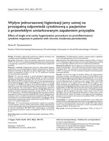 Szkaradkiewicz Hygeia Public Health AK. Wpływ 2013, jednorazowej 48(2): 189-193 higienizacji jamy ustnej na prozapalną odpowiedź cytokinową u pacjentów ... 189 Wpływ jednorazowej higienizacji jamy ustnej na prozapalną odpowiedź cytokinową u pacjentów z przewlekłym umiarkowanym zapaleniem przyzębia Effect of single oral cavity hygienization procedure on proinflammatory cytokine response in patients with chronic moderate periodontitis Anna K. Szkaradkiewicz Katedra i Klinika Stomatologii Zachowawczej i Periodontologii, Uniwersytet im. Karola Marcinkowskiego w Poznaniu Wstęp. Prozapalna odpowiedź cytokinowa odgrywa znaczącą rolę w patogenezie przewlekłego zapalenia przyzębia. Cel pracy. Dokonanie oceny prozapalnej odpowiedzi cytokinowej (TNF-α, IL-1β i IL-17), po jednorazowej higienizacji jamy ustnej (scaling i root planing) u pacjentów z przewlekłym umiarkowanym zapaleniem przyzębia. Materiał i metody. Diagnostyka kliniczna obejmowała badanie podmiotowe oraz stomatologiczne badanie przedmiotowe. Materiał badawczy stanowiły próbki zbiorcze płynu dziąsłowego. Oznaczanie cytokin prozapalnych (TNF- α , IL-1 β i IL-17) wykonano metodą immunoenzymatyczną (ELISA). Wyniki. W I terminie badania, tj. przed zabiegiem higienizacyjnym (skaling, root planing) w grupie badanej (grupa 1) średnie wartości wskaźników klinicznych wynosiły: Pl.I=2,11±0.26, GI=1,61±0,27, SBI=1,89±0,33, PPD=3,54±0,35, CAL=3,31±0,32, natomiast poziomy cytokin były następujące: TNF-α=6,0±0,98 pg/ml, IL-1β=21,1±2,5 pg/ ml oraz IL-17=18,88±3,37 pg/ml. W II terminie badania, po dwóch tygodniach od przeprowadzenia zabiegów higienizacyjnych u 16 (46%) osób (podgrupa 1A) stwierdzono istotne statystycznie obniżenie średnich wartości wskaźników klinicznych (Pl.I, GI, SBI, PPD, CAL) oraz obniżenie średnich wartości poziomów cytokin (TNF-α, IL-1β oraz IL‑17). Natomiast, u 19 (54%) osób (podgrupa 1B) stwierdzono istotne zmniejszenie średnich wartości wskaźników Pl.I oraz GI. Natomiast nie wykazano różnic w średnich wartościach wskaźników SBI, PPD i CAL w porównaniu z I terminem badania. Jednocześnie, w podgrupie 1B nie stwierdzono statystycznych zmian w poziomach cytokin (TNF-α, IL-1β oraz IL-17) w płynie dziąsłowym. Wnioski. W umiarkowanym przewlekłym zapaleniu przyzębia u ponad połowy chorych (54%) jednorazowy zabieg higienizacyjny nie jest wystarczająco skuteczny dla poprawy parametrów klinicznych (w zakresie wskaźników SBI, PPD, CAL) i jednocześnie nie prowadzi do zmniejszenia poziomu cytokin prozapalnych (TNF-α, IL-1β oraz IL‑17). Introduction. Proinflammatory cytokine response plays a significant role in the pathogenesis of chronic periodontitis. Aim. Evaluation of proinflammatory cytokine response (TNF-α, IL-1β and IL-17), following a single procedure of oral cavity hygienization (scaling and root planing) in patients with chronic moderate periodontitis. Material & methods. Clinical diagnosis included anamnesis and dental physical examination. The study material included pooled samples of gingival fluid. The estimation of proinflammatory cytokine levels (TNF-α, IL-1β and IL-17) was conducted using the immunoenzymatic techniques (ELISA). Results. At the first stage of studies, before the hygienization procedure (scaling, root planing) mean values of clinical indices in the examined group (group 1) amounted to the following: Pl.I=2.11±0.26, GI=1.61±0.27, SBI=1.89±0.33, PPD=3.54±0.35, CAL=3.31±0.32, and the following levels of cytokines were noted: TNF-α=6.0±0.98 pg/ml, IL-1β=21.1±2.5 pg/ml and IL-17=18.88±3.37 pg/ml. Two weeks following the hygienization procedures in 16 (46%) persons (subgroup 1A) a significant decrease in mean values of clinical indices was detected (Pl.I, GI, SBI, PPD, CAL) and a decrease in mean cytokine levels (TNF-α, IL-1β and IL-17). On the other hand, in 19 (54%) individuals (subgroup 1B) the significant decrease in mean values of the Pl.I and GI indices was not accompanied by alterations in mean values of the SBI, PPD and CAL indices. In parallel, in the subgroup 1B no significant alterations were noted in the content of cytokines (TNF-α, IL-1β and IL-17) in gingival fluid. Conclusions. In moderate chronic periodontitis in over half of the patients (54%) a single hygienization procedure is not sufficiently effective to improve clinical parameters (in the form of SBI, PPD, CAL indices) and it is not accompanied by a decrease in levels of proinflammatory cytokines (TNF-α, IL-1β and IL-17). Key words: chronic periodontitis, higienization, TNF-α, IL-1β, IL-17 Słowa kluczowe: przewlekłe zapalenie przyzębia, higienizacja, TNF- α, IL-1β, IL-17 © Hygeia Public Health 2013, 48(2): 189-193 Adres do korespondencji / Address for correspondence www.h-ph.pl dr Anna K. Szkaradkiewicz Katedra i Klinika Stomatologii Zachowawczej i Periodontologii Uniwersytet im. Karola Marcinkowskiego w Poznaniu ul. Bukowska 70, 60-812, Poznań, Poland tel. +48 618547027, e-mail: [email protected] Nadesłano: 10.06.2013 Zakwalifikowano do druku: 28.06.2013 190 Wstęp i cel pracy Przewlekłe zapalenie przyzębia (ang. chronic periodontitis) jest chorobą zapalną prowadzącą do destrukcji dziąseł, cementu korzeniowego, ozębnej oraz wyrostka zębodołowego kości. W etiopatogenezie periodontitis podstawową rolę odgrywają bakterie patogenne określane jako periodontopatogeny: Porphyromonas gingivalis, Prevotella intermedia, Fusobacterium nucleatum, Tannerella forsythia, Treponema denticola oraz Aggregatibacter actinomycetemcomitans. Choroba ta występuje najczęściej u osób dorosłych i charakteryzuje się umiarkowanym lub ciężkim przebiegiem klinicznym [1-3]. Badania wykazały, że periopatogeny mogą oddziaływać na komórki układu immunologicznego, pobudzając je do wytworzenia mediatorów reakcji zapalnych [4, 5]. W patogenezie przewlekłego zapalenia przyzębia znaczącą rolę odgrywa również pro-zap