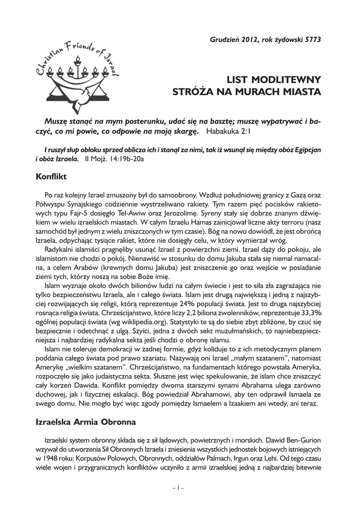 Grudzień 2012, rok żydowski 5773 LIST MODLITEWNY STRÓŻA NA MURACH MIASTA Muszę stanąć na mym posterunku, udać się na basztę; muszę wypatrywać i baczyć, co mi powie, co odpowie na moją skargę. Habakuka 2:1 I ruszył słup obłoku sprzed oblicza ich i stanął za nimi, tak iż wsunął się między obóz Egipcjan i obóz Izraela. II Mojż. 14:19b-20a Konflikt Po raz kolejny Izrael zmuszony był do samoobrony. Wzdłuż południowej granicy z Gazą oraz Półwyspu Synajskiego codziennie wystrzeliwano rakiety. Tym razem pięć pocisków rakietowych typu Fajr-5 dosięgło Tel-Awiw oraz Jerozolimę. Syreny stały się dobrze znanym dźwiękiem w wielu izraelskich miastach. W całym Izraelu Hamas zainicjował liczne akty terroru (nasz samochód był jednym z wielu zniszczonych w tym czasie). Bóg na nowo dowiódł, że jest obrońcą Izraela, odpychając tysiące rakiet, które nie dosięgły celu, w który wymierzał wróg. Radykalni islamiści pragnęliby usunąć Izrael z powierzchni ziemi. Izrael dąży do pokoju, ale islamistom nie chodzi o pokój. Nienawiść w stosunku do domu Jakuba stała się niemal namacalna, a celem Arabów (krewnych domu Jakuba) jest zniszczenie go oraz wejście w posiadanie ziemi tych, którzy noszą na sobie Boże imię. Islam wyznaje około dwóch bilionów ludzi na całym świecie i jest to siła zła zagrażająca nie tylko bezpieczeństwu Izraela, ale i całego świata. Islam jest drugą największą i jedną z najszybciej rozwijających się religii, którą reprezentuje 24% populacji świata. Jest to druga najszybciej rosnąca religia świata. Chrześcijaństwo, które liczy 2,2 biliona zwolenników, reprezentuje 33,3% ogólnej populacji świata (wg wiklipedia.org). Statystyki te są do siebie zbyt zbliżone, by czuć się bezpiecznie i odetchnąć z ulgą. Szyici, jedna z dwóch sekt muzułmańskich, to najniebezpieczniejsza i najbardziej radykalna sekta jeśli chodzi o obronę islamu. Islam nie toleruje demokracji w żadnej formie, gdyż koliduje to z ich metodycznym planem poddania całego świata pod prawo szariatu. Nazywają oni Izrael „małym szatanem”, natomiast Amerykę „wielkim szatanem”. Chrześcijaństwo, na fundamentach którego powstała Ameryka, rozpoczęło się jako judaistyczna sekta. Słuszne jest więc spekulowanie, że islam chce zniszczyć cały korzeń Dawida. Konflikt pomiędzy dwoma starszymi synami Abrahama ulega zarówno duchowej, jak i fizycznej eskalacji. Bóg powiedział Abrahamowi, aby ten odprawił Ismaela ze swego domu. Nie mogło być więc zgody pomiędzy Ismaelem a Izaakiem ani wtedy, ani teraz. Izraelska Armia Obronna Izraelski system obronny składa się z sił lądowych, powietrznych i morskich. Dawid Ben-Gurion wzywał do utworzenia Sił Obronnych Izraela i zniesienia wszystkich jednostek bojowych istniejących w 1948 roku: Korpusów Polowych, Obronnych, oddziałów Palmach, Irgun oraz Lehi. Od tego czasu wiele wojen i przygranicznych konfliktów uczyniło z armii izraelskiej jedną z najbardziej bitewnie –1– wyszkolonych armii świata. Milion rezerwistów jest w stanie asystować izraelskim siłom obronnym, które gotowe są, aby zatrzymać broń masowego zniszczenia, która dostała się w ręce Hezbollahu i Hamasu i ostatecznie powstrzymać nuklearny program Teheranu. System antyrakietowy Żelazna Kopuła w 90% potwierdził swoją efektywność w przechwytywaniu wrogich rakiet. Jesteśmy za to wdzięczni, jednakże zdajemy sobie sprawę z tego, że te pozostałe 10% procent może oznaczać utratę życia. Maski gazowe, schrony przeciw bombowe, alarmy oraz duża armia zapewniają pomoc i ochronę, ale naszą ostateczną nadzieję powinniśmy pokładać jedynie w Bogu. Operacja Słup Obronny stanowi ochronę przeciwko rakietom i bombom. Ma na celu zakłócenie wydajności bojowniczych organizacji militarnych. W języku hebrajskim nazywa się to Armud HaAnnan i nawiązuje do słupa obłoku, który prowadził naród izraelski w czasie ich wyjścia z Egiptu. To PAN był słupem ognia w nocy i słupem obłoku w dzień, aby prowadzić i ochraniać swój lud. Pewnego razu słup ten zatrzymał się i był jak mur oddzielający Izrael od jego wrogów. Obrona Boga Izraela Teraz wiem, że Pan wybawił pomazańca swego. Wysłucha go z nieba swego świętego przez potężną pomoc prawicy swojej. Jedni chlubią się wozami, drudzy końmi, lecz my chlubimy się imieniem Pana, Boga naszego. Zadrżały im kolana i upadli, lecz my stoimy i trwamy. Panie, królu nasz, pomóż! Wysłuchaj nas w dniu wołania naszego. Ps. 20,7-10. Izrael wie, że bez Pana Zastępów prowadzącego jego armię, uzbrojenie wojskowe zawiedzie. Izrael zdaje sobie sprawę, że za możliwościami antyrakietowego systemu Żelazna Kopuła stoi Boża chroniąca ręka. Zbyt wiele cudów można oglądać każdego dnia. To nie nasza moc strzeże nas od zła. Hebrajskie słowo określające „zastępy” to stewa. Pochodzi ono z terminologii wojskowej i oznacza gotową do walki armię. PAN izraelskiej armii ostrzega w swoim Słowie, że ci, którzy dotykają (ranią) Jego lud, dotykają „źrenicy Jego oka” (V Mojż. 32,10 i Zachariasza 2,12). Oko jest najwrażliwszą częścią ludzkiego ciała i dlatego w pierwszym odruchu natychmiast chronimy oczy. Daje nam to jasny obraz, ile Izrael znaczy dla Boga. Wszelkie zawieszenie ognia jest tylko chwilowe. Wojny będą się nasilały. Prorocy Starego Testamentu mówią o końcowej bitwie, która zakończy wszystkie wojny. Bóg zbierze wszystkich wrogów Izraela na największą ze wszystkich bitew. Zgromadzę wszystkie narody i sprowadzę je do Doliny Józafata, i tam się z nimi rozprawię z powodu mojego ludu i mojego dziedzictwa, Izraela, ponieważ rozproszyli je między ludy pogańskie i podzielili mój kraj. (…) Pan zagrzmi z Syjonu i wyda swój donośny głos z Jeruzalemu, tak że zadrżą niebiosa i ziemia. Lecz dla swojego ludu Pan jest ucieczką i twierdzą dla synów Izraela. I pozn