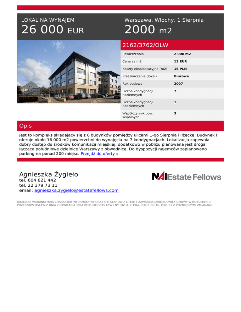LOKAL NA WYNAJEM Warszawa, Włochy, 1 Sierpnia 26 000 2000 EUR m2 2162/3762/OLW Powierzchnia 2 000 m2 Cena za m2 13 EUR Koszty eksploatacyjne (m2) 16 PLN Przeznaczenie (lokal) Biurowe Rok budowy 2007 Liczba kondygnacji naziemnych 7 Liczba kondygnacji podziemnych 1 Współczynnik pow. wspólnych 3 Opis Jest to kompleks składający się z 6 budynków pomiędzy ulicami 1-go Sierpnia i Iłżecką. Budynek F oferuje około 16 000 m2 powierzchni do wynajęcia na 7 kondygnacjach. Lokalizacja zapewnia dobry dostęp do środków komunikacji miejskiej, dodatkowo w pobliżu planowana jest droga łącząca południowe dzielnice Warszawy z obwodnicą. Do dyspozycji najemców zaplanowano parking na ponad 200 miejsc. Przejdź do oferty » Agnieszka Żygieło tel. 604 621 442 tel. 22 379 73 11 email: [email protected] NINIEJSZE WARUNKI MAJĄ CHARAKTER INFORMACYJNY ORAZ NIE STANOWIĄ OFERTY ZAWARCIA JAKIEJKOLWIEK UMOWY W ROZUMIENIU PRZEPISÓW USTAW Z DNIA 23 KWIETNIA 1964 ROKU KODEKS CYWILNY (DZ.U. Z 1964 ROKU, NR 16, POZ. 93 Z PÓŹNIEJSZYMI ZMIANAMI. Powered by TCPDF (www.tcpdf.org)