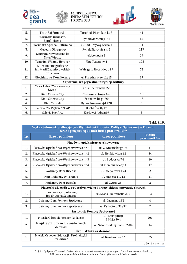 5. 6. 7. 8. 9. 10. 11. 12. 1. 2. 3. 4. 5. 6. Teatr Baj Pomorski Toruń ul. Piernikarska 9 Toruńska Orkiestra Rynek Staromiejski 6 Symfoniczna Toruńska Agenda Kulturalna ul. Pod Krzywą Wieża 1 Muzeum Okręgowe Rynek Staromiejski 1 Centrum Nowoczesności ul. Łokietka 5 Młyn Wiedzy Teatr im. Wilama Horzycy Plac Teatralny 1 Muzeum etnograficzne im. Marii ZnamierowskiejWały gen. Sikorskiego 19 Prüfferowej Młodzieżowy Dom Koltury ul. Przedzamcze 11/15 Najważniejsze prywatne instytucje kultury Teatr Lalek "Zaczarowany Szosa Chełmińska 226 Świat” Kino Cinema City Czerwona Droga 1-6 Kino Cinema City Broniewskiego 90 Kino Tumult Rynek Nowomiejski 28 Galeria "Na Piętrze" ZPAP Ducha Św. 8/12 Galeria Pro Arte Królowej Jadwigi 9 44 65 11 117 29 105 75 37 8 18 18 8 5 5 Tabl. 3.19. Lp. Wykaz jednostek podlegających Wydziałowi Zdrowia i Polityki Społecznej w Toruniu wraz z przypisaną do nich liczbą pracowników Liczba Nazwa podmiotu Adres podmiotu pracowników Placówki opiekuńczo-wychowawcze 1. Placówka Opiekuńczo-Wychowawcza nr 1 ul. Z. Krasińskiego 74 11 2. Placówka Opiekuńczo-Wychowawcza nr 2 ul. Sienkiewicza 12 34 3. Placówka Opiekuńczo-Wychowawcza nr 3 ul. Bydgoska 74 10 4. Placówka Opiekuńczo-Wychowawcza nr 4 ul. Donimirskiego 4 17 5. Rodzinny Dom Dziecka ul. Rzepakowa 1/3 2 6. Dom Rodzinny w Toruniu ul. Smocza 11/13 11 7. Rodzinny Dom Dziecka ul. Żytnia 28 2 1. Placówki dla osób w podeszłym wieku i przewlekle somatycznie chorych Dom Pomocy Społecznej ul. Szosa Chełmińska 220 83 im. dr Leona Szumana 2. Dzienny Dom Pomocy Społecznej ul. Gagarina 152 4 3. Dzienny Dom Pomocy Społecznej ul. Rydygiera 30/32 7 1. 2. 1. Instytucje Pomocy Społecznej ul. Konstytucji Miejski Ośrodek Pomocy Rodzinie 3 Maja 40 c Miejskie Schronisko dla Bezdomnych ul. Skłodowskiej Curie 82-84 Mężczyzn Profilaktyka uzależnień Miejski Ośrodek Edukacji i Profilaktyki ul. Kasztanowa 16 Uzależnień 203 14 25 129 | S t r o n a Projekt „Bydgosko-Toruńskie Partnerstwo na rzecz zrównoważonego transportu” jest finansowany z funduszy EOG, pochodzących z Islandii, Liechtensteinu i Norwegii oraz środków krajowych