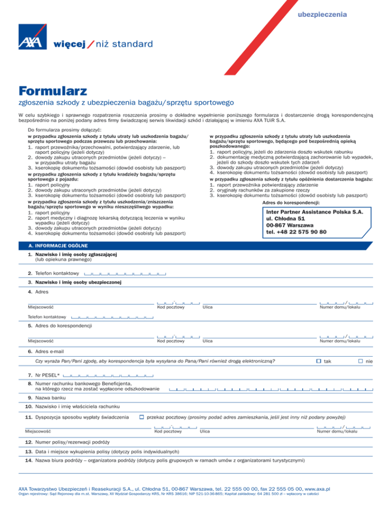 ubezpieczenia Formularz zgłoszenia szkody z ubezpieczenia bagażu/sprzętu sportowego W celu szybkiego i sprawnego rozpatrzenia roszczenia prosimy o dokładne wypełnienie poniższego formularza i dostarczenie drogą korespondencyjną bezpośrednio na poniżej podany adres firmy świadczącej serwis likwidacji szkód i działającej w imieniu AXA TUiR S.A. Do formularza prosimy dołączyć: w przypadku zgłoszenia szkody z tytułu utraty lub uszkodzenia bagażu/ sprzętu sportowego podczas przewozu lub przechowania: 1. raport przewoźnika/przechowalni, potwierdzający zdarzenie, lub raport policyjny (jeżeli dotyczy) 2. dowody zakupu utraconych przedmiotów (jeżeli dotyczy) – w przypadku utraty bagażu 3. kserokopię dokumentu tożsamości (dowód osobisty lub paszport) w przypadku zgłoszenia szkody z tytułu kradzieży bagażu/sprzętu sportowego z pojazdu: 1. raport policyjny 2. dowody zakupu utraconych przedmiotów (jeżeli dotyczy) 3. kserokopię dokumentu tożsamości (dowód osobisty lub paszport) w przypadku zgłoszenia szkody z tytułu uszkodzenia/zniszczenia bagażu/sprzętu sportowego w wyniku nieszczęśliwego wypadku: 1. raport policyjny 2. raport medyczny i diagnozę lekarską dotyczącą leczenia w wyniku wypadku (jeżeli dotyczy) 3. dowody zakupu utraconych przedmiotów (jeżeli dotyczy) 4. kserokopię dokumentu tożsamości (dowód osobisty lub paszport) w przypadku zgłoszenia szkody z tytułu utraty lub uszkodzenia bagażu/sprzętu sportowego, będącego pod bezpośrednią opieką poszkodowanego: 1. raport policyjny, jeżeli do zdarzenia doszło wskutek rabunku 2. dokumentację medyczną potwierdzającą zachorowanie lub wypadek, jeżeli do szkody doszło wskutek tych zdarzeń 3. dowody zakupu utraconych przedmiotów (jeżeli dotyczy) 4. kserokopię dokumentu tożsamości (dowód osobisty lub paszport) w przypadku zgłoszenia szkody z tytułu opóźnienia dostarczenia bagażu: 1. raport przewoźnika potwierdzający zdarzenie 2. oryginały rachunków za zakupione rzeczy 3. kserokopię dokumentu tożsamości (dowód osobisty lub paszport) Adres do korespondencji: Inter Partner Assistance Polska S.A. ul. Chłodna 51 00-867 Warszawa tel. +48 22 575 90 80 A. INFORMACJE OGÓLNE 1. Nazwisko i imię osoby zgłaszającej (lub opiekuna prawnego) 2. Telefon kontaktowy 3. Nazwisko i imię osoby ubezpieczonej 4. Adres Miejscowość Kod pocztowy Ulica / Numer domu/lokalu Kod pocztowy Ulica / Numer domu/lokalu Telefon kontaktowy 5. Adres do korespondencji Miejscowość 6. Adres e-mail Czy wyraża Pan/Pani zgodę, aby korespondencja była wysyłana do Pana/Pani również drogą elektroniczną? tak 7. Nr PESEL* 8. Numer rachunku bankowego Beneficjenta, na którego rzecz ma zostać wypłacone odszkodowanie 9. Nazwa banku 10. Nazwisko i imię właściciela rachunku 11. Dyspozycja sposobu wypłaty świadczenia Miejscowość przekaz pocztowy (prosimy podać adres zamieszkania, jeśli jest inny niż podany powyżej) Kod pocztowy Ulica / Numer domu/lokalu 12. Numer polisy/rezerwacji podróży 13. Data i miejsce wykupienia polisy (dotyczy polis indywidualnych) 14. Nazwa biura podróży – organizatora podróży (dotyczy polis grupowych w ramach umów z organizatorami turystycznymi) AXA Towarzystwo Ubezpieczeń i Reasekuracji S.A., ul. Chłodna 51, 00-867 Warszawa, tel. 22 555 00 00, fax 22 555 05 00, www.axa.pl Organ rejestrowy: Sąd Rejonowy dla m.st. Warszawy, XII Wydział Gospodarczy KRS, Nr KRS 38616; NIP 521-10-36-865; Kapitał zakładowy: 64 281 500 zł – wpłacony w całości nie B. INFORMACJE DOTYCZĄCE PODRÓŻY 1. Kraj zdarzenia 2. Początek podróży 3. Zakończenie podróży data wyjazdu D D M M R R R R godzina G G M M data wyjazdu D D M M R R R R godzina G G M M C. DANE DOTYCZĄCE SZKODY 1. Szkoda dotyczy: Jakiego? 2. Kiedy doszło do zdarzenia? 3. Kiedy stwierdzono zajście zdarzenia/szkody? bagażu sprzętu sportowego D D M M R R R R pomiędzy godziną G G D D M M R R R R godzina G G M M a G G M M M M 4. Miejsce zdarzenia 5. Szczegółowy opis szkody oraz okoliczności jej powstania (w razie konieczności prosimy kontynuować na dodatkowej kartce) 6. Czy o zdarzeniu poinformowano: policję, przewoźnika, administrację, hotel itp.? (prosimy podać nazwy i adresy) tak nie 7. Rodzaj szkody zagubienie kradzież braki w bagażu opóźnienie zniszczenie Szacunkowa wartość szkody: D. DANE DOTYCZĄCE PONIESIONYCH KOSZTÓW 1. Należy podać listę utraconych i/lub uszkodzonych przedmiotów. Prosimy załączyć rachunki ich zakupu lub naprawy (jeżeli są). Rachunek Przedmiot Cena/Waluta Data zakupu 1) D D M M R R R R 2) D D M M R R R R 3) D D M M R R R R 4) D D M M R R R R 5) D D M M R R R R Suma 2. Czy wypłacono odszkodowanie z innego źródła (np. od przewoźnika)? Marka/Rodzaj jest brak Kwota roszczenia Suma tak nie 3. Jeśli tak, prosimy podać nazwę firmy: 4. Prosimy podać kwotę wypłaconego odszkodowania: kwota waluta 2 5. Jeśli nie wypłacono żadnego odszkodowania, to czy składano wniosek o jego wypłatę do innej firmy? tak nie tak nie 6. Jeśli tak, to do jakiej? Prosimy podać nazwę i adres. E. DANE DOTYCZĄCE INNEGO UBEZPIECZENIA Czy posiada Pan/Pani inne ubezpieczenie bagażu/sprzętu sportowego? Jeśli tak, prosimy podać nazwę towarzystwa ubezpieczeniowego i numer polisy. F. OŚWIADCZENIA Przyjmuję do wiadomości, że moje dane osobowe będą przetwarzane przez AXA TUiR S.A., z siedzibą w Warszawie, w celu likwidacji zgłoszonej szkody. Niniejszym potwierdzam, iż podane powyżej informacje są zgodne z prawdą i zdaję sobie sprawę, iż poświadczenie nieprawdy lub podanie fałszywych informacji może skutkować pociągnięciem mnie do odpowiedzialności karnej i może powodować odmowę wypłaty odszkodowania. D D M M R R R R Data D D M M R R R R Podpis Ubezpieczonego lub pełnomocnika Data Podpis zgłaszającego szkodę Informujemy, że podanie danych osobowych jest dobrowolne, jednakże konieczne do realizacji umowy ubezpieczenia i rozpatrzenia z