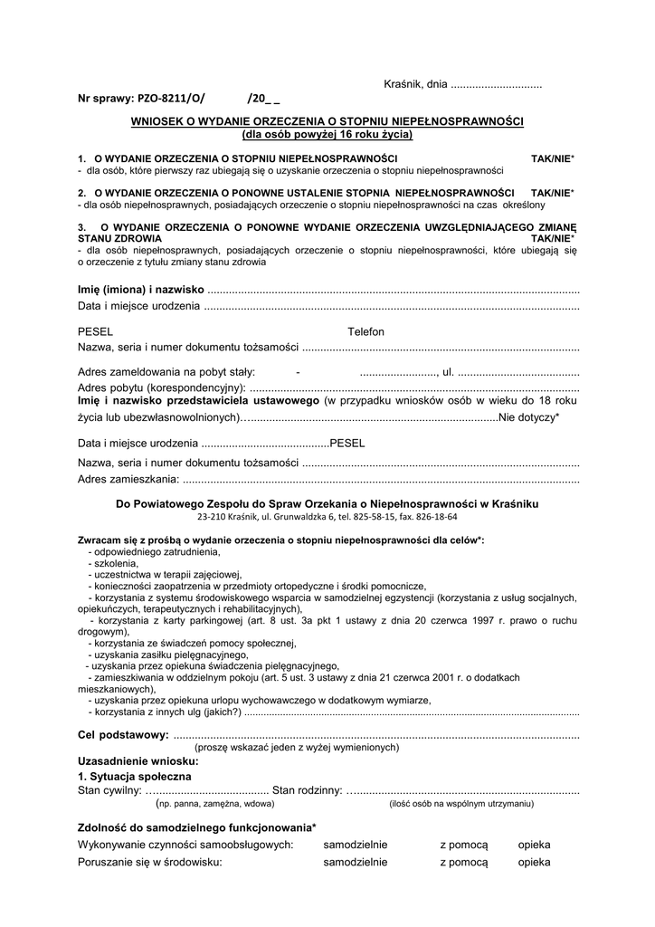 Kraśnik, dnia .............................. Nr sprawy: PZO-8211/O/ /20_ _ WNIOSEK O WYDANIE ORZECZENIA O STOPNIU NIEPEŁNOSPRAWNOŚCI (dla osób powyżej 16 roku życia) 1. O WYDANIE ORZECZENIA O STOPNIU NIEPEŁNOSPRAWNOŚCI - dla osób, które pierwszy raz ubiegają się o uzyskanie orzeczenia o stopniu niepełnosprawności TAK/NIE* 2. O WYDANIE ORZECZENIA O PONOWNE USTALENIE STOPNIA NIEPEŁNOSPRAWNOŚCI TAK/NIE* - dla osób niepełnosprawnych, posiadających orzeczenie o stopniu niepełnosprawności na czas określony 3. O WYDANIE ORZECZENIA O PONOWNE WYDANIE ORZECZENIA UWZGLĘDNIAJĄCEGO ZMIANĘ STANU ZDROWIA TAK/NIE* - dla osób niepełnosprawnych, posiadających orzeczenie o stopniu niepełnosprawności, które ubiegają się o orzeczenie z tytułu zmiany stanu zdrowia Imię (imiona) i nazwisko .......................................................................................................................... Data i miejsce urodzenia ........................................................................................................................... PESEL Telefon Nazwa, seria i numer dokumentu tożsamości ........................................................................................... ........................., ul. ........................................ Adres zameldowania na pobyt stały: Adres pobytu (korespondencyjny): ............................................................................................................ Imię i nazwisko przedstawiciela ustawowego (w przypadku wniosków osób w wieku do 18 roku życia lub ubezwłasnowolnionych)….................................................................................Nie dotyczy* Data i miejsce urodzenia ..........................................PESEL Nazwa, seria i numer dokumentu tożsamości ........................................................................................... Adres zamieszkania: .................................................................................................................................. Do Powiatowego Zespołu do Spraw Orzekania o Niepełnosprawności w Kraśniku 23-210 Kraśnik, ul. Grunwaldzka 6, tel. 825-58-15, fax. 826-18-64 Zwracam się z prośbą o wydanie orzeczenia o stopniu niepełnosprawności dla celów*: - odpowiedniego zatrudnienia, - szkolenia, - uczestnictwa w terapii zajęciowej, - konieczności zaopatrzenia w przedmioty ortopedyczne i środki pomocnicze, - korzystania z systemu środowiskowego wsparcia w samodzielnej egzystencji (korzystania z usług socjalnych, opiekuńczych, terapeutycznych i rehabilitacyjnych), - korzystania z karty parkingowej (art. 8 ust. 3a pkt 1 ustawy z dnia 20 czerwca 1997 r. prawo o ruchu drogowym), - korzystania ze świadczeń pomocy społecznej, - uzyskania zasiłku pielęgnacyjnego, - uzyskania przez opiekuna świadczenia pielęgnacyjnego, - zamieszkiwania w oddzielnym pokoju (art. 5 ust. 3 ustawy z dnia 21 czerwca 2001 r. o dodatkach mieszkaniowych), - uzyskania przez opiekuna urlopu wychowawczego w dodatkowym wymiarze, - korzystania z innych ulg (jakich?) .......................................................................................................................... Cel podstawowy: ..................................................................................................................................... (proszę wskazać jeden z wyżej wymienionych) Uzasadnienie wniosku: 1. Sytuacja społeczna Stan cywilny: …..................................... Stan rodzinny: …......................................................................... (np. panna, zamężna, wdowa) (ilość osób na wspólnym utrzymaniu) Zdolność do samodzielnego funkcjonowania* Wykonywanie czynności samoobsługowych: samodzielnie z pomocą opieka Poruszanie się w środowisku: samodzielnie z pomocą opieka Prowadzenie gospodarstwa domowego: 2. Korzystanie ze sprzętu rehabilitacyjnego* samodzielnie z pomocą opieka niezbędne wskazane zbędne 3. Sytuacja zawodowa Wykształcenie: ................................................. Zawód wyuczony: ........................................................... Czy aktualnie wykonuje pracę zarobkową* tak nie Zawód wykonywany ................................................................................................................................... Oświadczam, że*: 1. Pobieram/ Nie pobieram świadczenia z ubezpieczenia społecznego. Jakie: ...................................................................Od kiedy: ...................................................................... Toczy się/ Nie toczy się w mojej sprawie postępowanie przed innym organem 2. Aktualnie orzeczniczym. Podać jakim: .............................................................................................................................................. 3. Składałem/ Nie składałem uprzednio wniosku o ustalenie stopnia niepełnosprawności. Jeżeli tak, to kiedy: ................................................ Z jakim skutkiem: ....................................................... Data wydania ostatniego orzeczenia: ......................................... Numer sprawy: ..................................... 4. Mogę/ Nie mogę samodzielnie przybyć na posiedzenie składu orzekającego (jeżeli nie, to należy załączyć zaświadczenie lekarskie potwierdzające niemożność wzięcia udziału w posiedzeniu z powodu długotrwałej i nierokującej poprawy choroby, uniemożliwiającej osobiste stawiennictwo). 5. W razie stwierdzonej przez zespół orzekający konieczności wykonania badań dodatkowych, konsultacji specjalistycznych lub obserwacji szpitalnych uzupełniających złożone zaświadczenie o stanie zdrowia wydane przez lekarza nie będącego lekarzem ubezpieczenia zdrowotnego, jestem świadomy wymogu ponoszenia ich kosztów we własnym zakresie. Oświadczam, że dane zawarte we wniosku są zgodne ze stanem faktycznym i jestem świadomy(a) odpowiedz