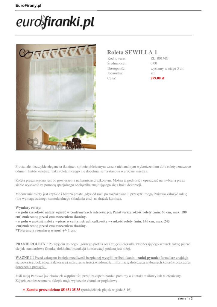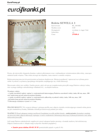 EuroFirany.pl Roleta SEWILLA 1 Kod towaru: Średnia ocen: Dostępność: Jednostka: Cena: RL_001MG 0.00 wysłamy w ciągu 5 dni szt. 279.00 zł Prosta, ale niezwykle elegancka tkanina o splocie płóciennym wraz z niebanalnym wykończeniem dołu rolety, znacząco odmieni każde wnętrze. Taka roleta niczego nie dopełnia, sama stanowi o urodzie wnętrza. Roleta przeznaczona jest do powieszenia na karniszu drążkowym. Można ją podnosić i opuszczać na wybraną przez siebie wysokość za pomocą specjalnego obciążnika znajdującego się z boku dekoracji. Mocowanie rolety jest szybkie i bardzo proste, gdyż od razu po rozpakowaniu przesyłki mogą Państwo założyć roletę (nie wymaga żadnego samodzielnego składania etc.) na drążek karnisza. Wymiary rolety: - w polu szerokość należy wpisać w centymetrach interesującą Państwa szerokość rolety (min. 60 cm, max. 180 cm) zmierzoną przed zmarszczeniem tkaniny. - w polu wysokość należy wpisać w centymetrach całkowitą wysokość rolety (min. 140 cm, max. 245 cm)zmierzoną przed zmarszczeniem tkaniny. *Tolerancja rozmiaru wynosi +/- 1 cm. PRANIE ROLETY ! Po wyjęciu dolnego i górnego profila oraz zdjęciu ciężarka zwieńczającego sznurek roletę pierze się jak standardową firankę, dokładna instrukcja konserwacji podana jest niżej. WAŻNE !!! Przed zakupem istnieje możliwość bezpłatnej wysyłki próbek tkanin - zadaj pytanie (formularz znajduje się powyżej obok zdjęcia dekoracji) wpisując w treści wiadomości informację dotyczącą wybranych kolorów oraz adres doręczenia przesyłki. Jeśli mają Państwo jakiekolwiek wątpliwości przed zakupem bardzo prosimy o kontakt mailowy lub telefoniczny. Zdjęcia zamieszczone w sklepie mają wyłącznie charakter poglądowy. Zamów przez telefon: 85 651 35 35 (poniedziałek-piątek w godz.8-16) strona 1 / 2 EuroFirany.pl Zamów mailem: [email protected] Istnieje możliwość uszycia dekoracji wg. życzeń klienta. Zainteresowanych prosimy o kontakt w celu ustalenia indywidualnych szczegółów zamówienia i oferty. Informacja dotycząca sposobu konserwacji dekoracji: UWAGA ! Dozując proszek do prania należy zwracać uwagę na zalecane ilości, zgodnie ze stopniami zabrudzenia tekstyliów. Informację dotyczącą zalecanych ilości można znaleźć na każdym opakowaniu proszku do prania. strona 2 / 2 Powered by TCPDF (www.tcpdf.org)