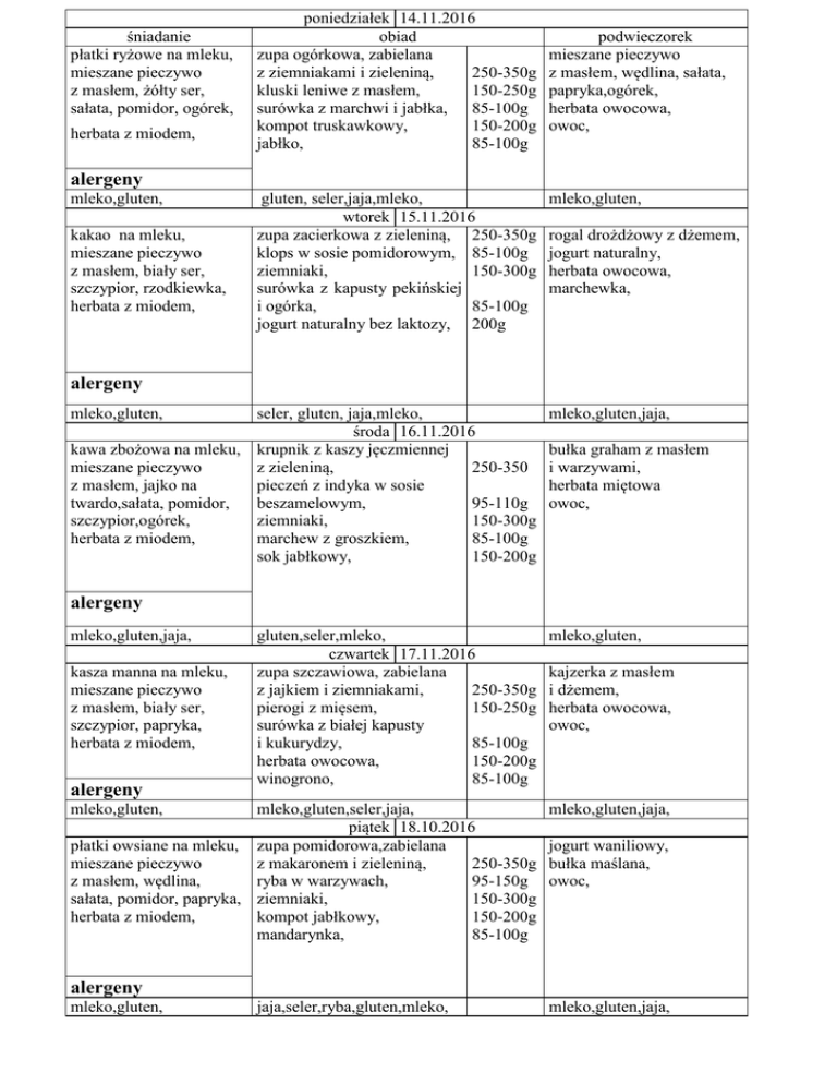 śniadanie płatki ryżowe na mleku, mieszane pieczywo z masłem, żółty ser, sałata, pomidor, ogórek, herbata z miodem, poniedziałek 14.11.2016 obiad zupa ogórkowa, zabielana z ziemniakami i zieleniną, 250-350g kluski leniwe z masłem, 150-250g surówka z marchwi i jabłka, 85-100g kompot truskawkowy, 150-200g jabłko, 85-100g podwieczorek mieszane pieczywo z masłem, wędlina, sałata, papryka,ogórek, herbata owocowa, owoc, alergeny mleko,gluten, kakao na mleku, mieszane pieczywo z masłem, biały ser, szczypior, rzodkiewka, herbata z miodem, gluten, seler,jaja,mleko, wtorek 15.11.2016 zupa zacierkowa z zieleniną, 250-350g klops w sosie pomidorowym, 85-100g ziemniaki, 150-300g surówka z kapusty pekińskiej i ogórka, 85-100g jogurt naturalny bez laktozy, 200g mleko,gluten, rogal drożdżowy z dżemem, jogurt naturalny, herbata owocowa, marchewka, alergeny mleko,gluten, seler, gluten, jaja,mleko, środa 16.11.2016 kawa zbożowa na mleku, krupnik z kaszy jęczmiennej mieszane pieczywo z zieleniną, 250-350 z masłem, jajko na pieczeń z indyka w sosie twardo,sałata, pomidor, beszamelowym, 95-110g szczypior,ogórek, ziemniaki, 150-300g herbata z miodem, marchew z groszkiem, 85-100g sok jabłkowy, 150-200g mleko,gluten,jaja, bułka graham z masłem i warzywami, herbata miętowa owoc, alergeny mleko,gluten,jaja, kasza manna na mleku, mieszane pieczywo z masłem, biały ser, szczypior, papryka, herbata z miodem, alergeny gluten,seler,mleko, czwartek 17.11.2016 zupa szczawiowa, zabielana z jajkiem i ziemniakami, 250-350g pierogi z mięsem, 150-250g surówka z białej kapusty i kukurydzy, 85-100g herbata owocowa, 150-200g winogrono, 85-100g mleko,gluten, mleko,gluten,seler,jaja, piątek 18.10.2016 płatki owsiane na mleku, zupa pomidorowa,zabielana mieszane pieczywo z makaronem i zieleniną, 250-350g z masłem, wędlina, ryba w warzywach, 95-150g sałata, pomidor, papryka, ziemniaki, 150-300g herbata z miodem, kompot jabłkowy, 150-200g mandarynka, 85-100g mleko,gluten, kajzerka z masłem i dżemem, herbata owocowa, owoc, mleko,gluten,jaja, jogurt waniliowy, bułka maślana, owoc, alergeny mleko,gluten, jaja,seler,ryba,gluten,mleko, mleko,gluten,jaja,