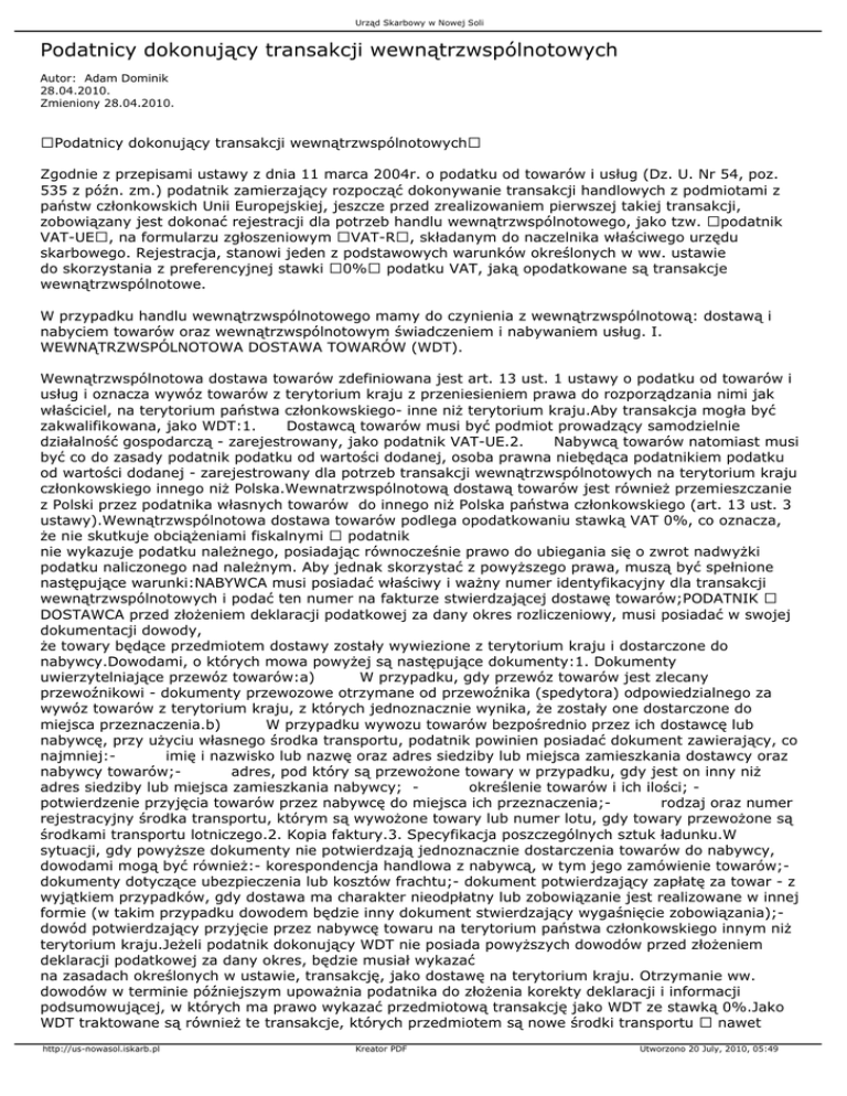 Urząd Skarbowy w Nowej Soli Podatnicy dokonujący transakcji wewnątrzwspólnotowych Autor: Adam Dominik 28.04.2010. Zmieniony 28.04.2010. Podatnicy dokonujący transakcji wewnątrzwspólnotowych Zgodnie z przepisami ustawy z dnia 11 marca 2004r. o podatku od towarów i usług (Dz. U. Nr 54, poz. 535 z późn. zm.) podatnik zamierzający rozpocząć dokonywanie transakcji handlowych z podmiotami z państw członkowskich Unii Europejskiej, jeszcze przed zrealizowaniem pierwszej takiej transakcji, zobowiązany jest dokonać rejestracji dla potrzeb handlu wewnątrzwspólnotowego, jako tzw. podatnik VAT-UE, na formularzu zgłoszeniowym VAT-R, składanym do naczelnika właściwego urzędu skarbowego. Rejestracja, stanowi jeden z podstawowych warunków określonych w ww. ustawie do skorzystania z preferencyjnej stawki 0% podatku VAT, jaką opodatkowane są transakcje wewnątrzwspólnotowe. W przypadku handlu wewnątrzwspólnotowego mamy do czynienia z wewnątrzwspólnotową: dostawą i nabyciem towarów oraz wewnątrzwspólnotowym świadczeniem i nabywaniem usług. I. WEWNĄTRZWSPÓLNOTOWA DOSTAWA TOWARÓW (WDT). Wewnątrzwspólnotowa dostawa towarów zdefiniowana jest art. 13 ust. 1 ustawy o podatku od towarów i usług i oznacza wywóz towarów z terytorium kraju z przeniesieniem prawa do rozporządzania nimi jak właściciel, na terytorium państwa członkowskiego- inne niż terytorium kraju.Aby transakcja mogła być zakwalifikowana, jako WDT:1. Dostawcą towarów musi być podmiot prowadzący samodzielnie działalność gospodarczą - zarejestrowany, jako podatnik VAT-UE.2. Nabywcą towarów natomiast musi być co do zasady podatnik podatku od wartości dodanej, osoba prawna niebędąca podatnikiem podatku od wartości dodanej - zarejestrowany dla potrzeb transakcji wewnątrzwspólnotowych na terytorium kraju członkowskiego innego niż Polska.Wewnatrzwspólnotową dostawą towarów jest również przemieszczanie z Polski przez podatnika własnych towarów do innego niż Polska państwa członkowskiego (art. 13 ust. 3 ustawy).Wewnątrzwspólnotowa dostawa towarów podlega opodatkowaniu stawką VAT 0%, co oznacza, że nie skutkuje obciążeniami fiskalnymi podatnik nie wykazuje podatku należnego, posiadając równocześnie prawo do ubiegania się o zwrot nadwyżki podatku naliczonego nad należnym. Aby jednak skorzystać z powyższego prawa, muszą być spełnione następujące warunki:NABYWCA musi posiadać właściwy i ważny numer identyfikacyjny dla transakcji wewnątrzwspólnotowych i podać ten numer na fakturze stwierdzającej dostawę towarów;PODATNIK DOSTAWCA przed złożeniem deklaracji podatkowej za dany okres rozliczeniowy, musi posiadać w swojej dokumentacji dowody, że towary będące przedmiotem dostawy zostały wywiezione z terytorium kraju i dostarczone do nabywcy.Dowodami, o których mowa powyżej są następujące dokumenty:1. Dokumenty uwierzytelniające przewóz towarów:a) W przypadku, gdy przewóz towarów jest zlecany przewoźnikowi - dokumenty przewozowe otrzymane od przewoźnika (spedytora) odpowiedzialnego za wywóz towarów z terytorium kraju, z których jednoznacznie wynika, że zostały one dostarczone do miejsca przeznaczenia.b) W przypadku wywozu towarów bezpośrednio przez ich dostawcę lub nabywcę, przy użyciu własnego środka transportu, podatnik powinien posiadać dokument zawierający, co najmniej:imię i nazwisko lub nazwę oraz adres siedziby lub miejsca zamieszkania dostawcy oraz nabywcy towarów;adres, pod który są przewożone towary w przypadku, gdy jest on inny niż adres siedziby lub miejsca zamieszkania nabywcy; określenie towarów i ich ilości; potwierdzenie przyjęcia towarów przez nabywcę do miejsca ich przeznaczenia;rodzaj oraz numer rejestracyjny środka transportu, którym są wywożone towary lub numer lotu, gdy towary przewożone są środkami transportu lotniczego.2. Kopia faktury.3. Specyfikacja poszczególnych sztuk ładunku.W sytuacji, gdy powyższe dokumenty nie potwierdzają jednoznacznie dostarczenia towarów do nabywcy, dowodami mogą być również:- korespondencja handlowa z nabywcą, w tym jego zamówienie towarów;dokumenty dotyczące ubezpieczenia lub kosztów frachtu;- dokument potwierdzający zapłatę za towar - z wyjątkiem przypadków, gdy dostawa ma charakter nieodpłatny lub zobowiązanie jest realizowane w innej formie (w takim przypadku dowodem będzie inny dokument stwierdzający wygaśnięcie zobowiązania);dowód potwierdzający przyjęcie przez nabywcę towaru na terytorium państwa członkowskiego innym niż terytorium kraju.Jeżeli podatnik dokonujący WDT nie posiada powyższych dowodów przed złożeniem deklaracji podatkowej za dany okres, będzie musiał wykazać na zasadach określonych w ustawie, transakcję, jako dostawę na terytorium kraju. Otrzymanie ww. dowodów w terminie późniejszym upoważnia podatnika do złożenia korekty deklaracji i informacji podsumowującej, w których ma prawo wykazać przedmiotową transakcję jako WDT ze stawką 0%.Jako WDT traktowane są również te transakcje, których przedmiotem są nowe środki transportu nawet http://us-nowasol.iskarb.pl Kreator PDF Utworzono 20 July, 2010, 05:49 Urząd Skarbowy w Nowej Soli wówczas, gdy dostawcą są inne niż wyszczególnione wyżej podmioty, a nabywcą jest podmiot niezarejestrowany do transakcji wewnątrzwspólnotowych z innego niż Polska państwa członkowskiego.W przypadku wywozu nowych środków transportu przez nabywcę, bez użycia środka przewozowego, oprócz kopii faktury oraz specyfikacji towaru, podatnik powinien posiadać również dokument (tzw. dokument wywozu) zawierający przede wszystkim:1) dane dotyczące podatnika i nabywcy;2) dane pozwalające jednoznacznie zidentyfikować przedmiot dostawy, jako nowy środek transportu;3) datę dostawy; 4) podpisy podatnika i nabywcy; 5) oświadczenie nabywcy o wywozie nowego środka transportu poza terytorium kraju w terminie 14 dni od dnia dostawy, wraz 