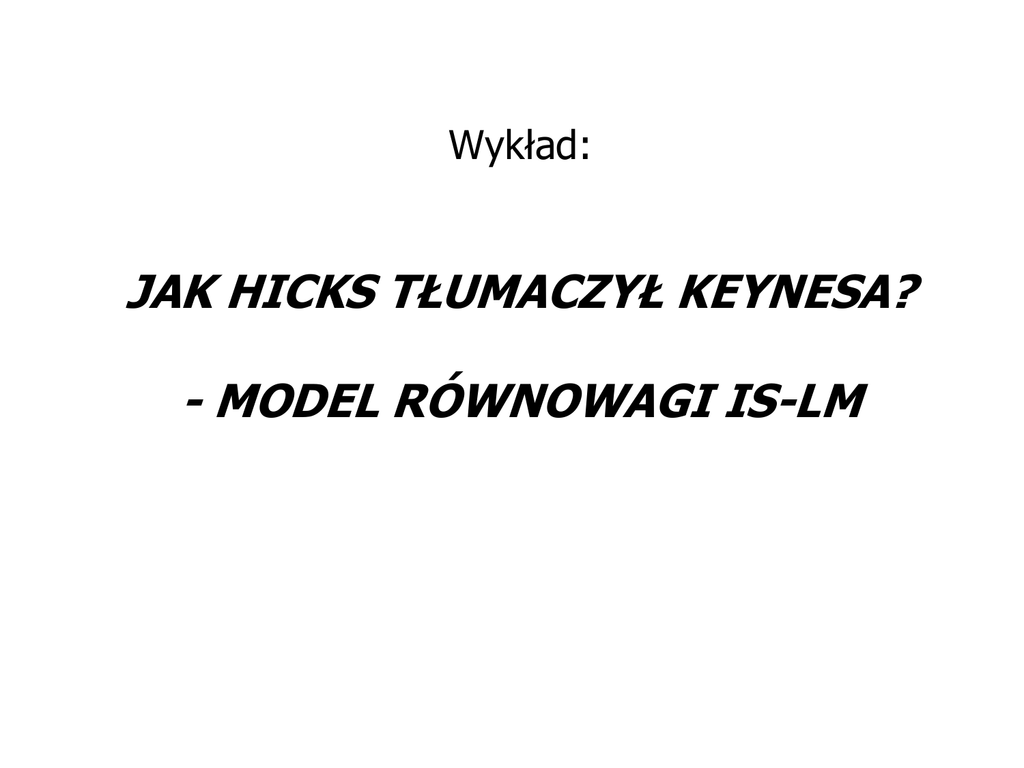 Wykład: JAK HICKS TŁUMACZYŁ KEYNESA? - MODEL RÓWNOWAGI IS-LM Stanley Fischer o modelu IS-LM Model IS-LM jest użyteczny z dwóch powodów. Po pierwsze jako narzędzie o znaczeniu historycznym, a po drugie, ponieważ jest to wciąż podstawowy model używany przez ludzi, aby rozumieć gospodarkę. (...) Nie sądzę, aby istniał lepszy model dający właściwe wyczucie procesów dostosowawczych w krótkich okresach. John Hicks (1904 - 1989) • „Mr Keynes and the Classics: A Suggested Interpretation” (1937) • „Value and Capital” (1939) • Nagroda Nobla (1972) Model IS - LM : podstawowe zmienne Y = C + I + G +X ZMIENNE ENDOGENICZNE (ustalane w modelu) C = a + b (1 - t) Y I = e - dR X = g - mY - nR MD = (kY - hR) P ZMIENNE EGZOGENICZNE (ustalane poza modelem) MS i G Konsumpcja a dochody dyspozycyjne, USA 1960–2008 Inwestycje, stopa % i rentowność projektów inwestycyjnych Algebraiczne wyprowadzenie krzywej IS 1) Y = C + I + G + X 2) C = 300 + 0,8 Yd 3) I = 200 - 1500 r 4) X = 100 - 0,04 Y - 500 r 5) MD = P ( 0,5 Y - 2000 r ) G = 200 t = 0,2 MS = 550 P=1 IS: Y = 300 + 0,8(1 - 0,2)Y + 200 - 1500r + 200 +100 - 0,04Y - 500r IS: Y = 2000 - 5000 r Wyprowadzenie krzywej IS 2 AD 1 AD1 E1 E0 AD0 Y r 1 2 Krzywa IS r0 IS r1 Y Y0 Y1 Algebraiczne wyprowadzenie krzywej LM 1) Y = C + I + G + X G = 200 2) C = 300 + 0,8 Yd t = 0,2 3) I = 200 - 1500 r 4) X = 100 - 0,04 Y - 500 r 5) MD = P ( 0,5 Y - 2000 r ) LM: MS = MD LM: LM: MS = 550 P=1 550 = P ( 0,5 Y - 2000 r ) Y = 1100 + 4000 r Wyprowadzenie krzywej LM Krzywa LM Stopa procentowa MS r r 2 LM MD1 1 MD0 M0 Y0 M 1 Y1 2 Y Model równowagi makroekonomicznej: IS - LM Krzywa LM [obrazuje równowagę na rynku pieniężnym] Stopa procentowa r LM E0 Krzywa IS [obrazuje równowagę na rynku dóbr i usług] r0 IS Y0 Y Dochód narodowy Model IS - LM: wpływ ekspansywnej polityki budżetowej na gospodarkę Krzywa LM Stopa procentowa [obrazuje równowagę na rynku pieniężnym] r r1 LM E1 Krzywe IS E0 [obrazują równowagę na rynku dóbr i usług] r0 IS1 IS0 Y0 Y1 Y Dochód narodowy Wpływ ekspansywnej polityki fiskalnej na wzrost gospodarczy (OECD 1970-96) Wskaźnik Stopa wzrostu realnego GDP - przed zmianą polityki fiskalnej - w trakcie - po zmianie polityki fiskalnej Liczba epizodów Ekspansja fiskalna 2,57 % 1,12 % 2,00 % 38 Podstawowe wskaźniki ekonomiczne w USA w latach 1981-1987 Wskaźnik 1981 1982 1983 1984 1985 1986 1987 Stopa wzrostu GNP (%) 1,9 -2,5 3,6 6,8 3,4 2,8 3,4 Stopa bezrobocia (%) 7,5 9,5 9,5 7,4 7,1 6,9 6,1 Inflacja (CPI) (%) 10,3 6,2 3,2 4,3 3,6 1,9 3,6 Deficyt budżetowy (w mld $) 64 146 176 170 197 206 158 Saldo bilansu handl. (w mld $) -28 -36 -67 -113 -122 -146 -160 Model IS - LM: wpływ restrykcyjnej polityki budżetowej na gospodarkę Krzywa LM Stopa procentowa r r0 [obrazuje równowagę na rynku pieniężnym] LM E0 Krzywe IS E1 [obrazują równowagę na rynku dóbr i usług] r1 IS0 IS1 Y1 Y0 Y Dochód narodowy Wpływ restrykcyjnej polityki fiskalnej na wzrost gospodarczy (OECD 1970-96) Wskaźnik Stopa wzrostu realnego GDP - przed zmianą polityki fiskalnej - w trakcie - po zmianie polityki fiskalnej Liczba epizodów Restrykcje fiskalne 2,21 % 2,36 % 2,13 % 65 Stopa fiskalizmu a wzrost PKB Kraj Stopa fiskalizmu Średnioroczny wzrost PKB 1960 1996 zmiana 19601990- zmiana 65 96 Kraje, gdzie stopa fiskalizmu wzrosła nieznacznie USA 28,4 34,6 +6,2 4,4 2,2 -2,2 Irlandia 28,2 37,3 +9,7 4,1 5,9 +1,8 W. Brytania 32,2 43,7 +11,5 3,5 1,2 -2,3 Kraje o największym wzroście fiskalizmu Hiszpania 13,7 45,4 +31,7 8,5 1,8 -6,7 Grecja 17,4 49,4 +32,0 7,2 1,2 -6,0 Szwecja 31,0 66,1 +35,1 4,9 0,6 -4,3 Kraje OECD 27,0 48,0 +21,0 5,5 1,9 -3,6 Nachylenie krzywej LM a efektywność polityki fiskalnej Stopa procentowa LM0 r LM1 r2 IS2 r1 r0 IS1 IS0 Y0 Y1 Dochód narodowy Y2 Y Czynniki przesunięć krzywej IS 1. Zmiany autonomicznych wydatków konsumpcyjnych niepowiązane ze stopami procentowymi. 2. Zmiany wydatków inwestycyjnych niepowiązane ze stopami procentowymi. 3. Zmiany wydatków rządowych. 4. Zmiany podatków. 5. Zmiany eksportu netto niezwiązane ze stopami procentowymi. Model IS - LM: wpływ ekspansywnej polityki monetarnej na gospodarkę Krzywe LM Stopa procentowa [obrazują równowagę na rynku pieniężnym] r r0 r1 LM0 E0 E1 LM1 Krzywa IS [obrazuje równowagę na rynku dóbr i usług] IS Y0 Y1 Y Dochód narodowy Keynes o polityce monetarnej Dopóki istnieje bezrobocie, wzrost ilości pieniądza nie wywiera żadnego wpływu na ceny, a zatrudnienie powiększa się ściśle proporcjonalnie do każdego przyrostu efektywnego popytu wywołanego przez wzrost ilości pieniądza. (...) Skoro zaś nastanie pełne zatrudnienie, ceny zmieniają się w tej samej proporcji co ilość pieniądza. Ekspansywna polityka monetarna a tempo wzrostu gospodarczego w USA w latach 1982-84 Wskaźnik 1981 1982 1983 1984 Tempo wzrostu nominalnej podaży pieniądza M1 Tempo wzrostu realnej podaży pieniądza M1 Tempo inflacji mierzone deflatorem PNB Tempo wzrostu gospodarczego 6,5 8,5 9,6 5,7 -3,2 2,1 6,0 2,0 9,7 6,4 3,9 3,7 1,9 -2,5 3,6 6,8 STOPA INFLACJI /CPI/ (w %) Wzrost podaży pieniądza a inflacja TEMPO WZROSTU M1 (w %) Model IS - LM: wpływ restrykcyjnej polityki monetarnej na gospodarkę Krzywe LM Stopa procentowa [obrazują równowagę na rynku pieniężnym] r r1 r0 LM1 LM0 E1 Krzywa IS E0 [obrazuje równowagę na rynku dóbr i usług] IS Y1 Y0 Y Dochód narodowy Restrykcyjna polityka monetarna a tempo wzrostu gospodarczego w USA w latach 1978-1982 Wskaźnik 1978 1979 1980 1981 1982 Tempo wzrostu nominalnej podaży pieniądza M1 Tempo wzrostu realnej podaży pieniądza M1 Tempo inflacji mierzone deflatorem PNB Tempo wzrostu gospodarczego 8,2 7,6 6,8 6,5 8,5 0,9 -1,3 -2,2 -3,2 2,1 7,3 8,9 9,0 9,7 6,4 5,3 2,5 -0,2 1,9 -2,5 Przesunięcia krzywej LM 1. Zmiany podaży pieniądza. 2. Autonomiczne zmiany popytu na pieniądz. 3. Zmiany ogólnego poziomu cen [wzrost P działa jak restrykcyjna polityka monetarna – zmniejszają się realne zasoby pieni