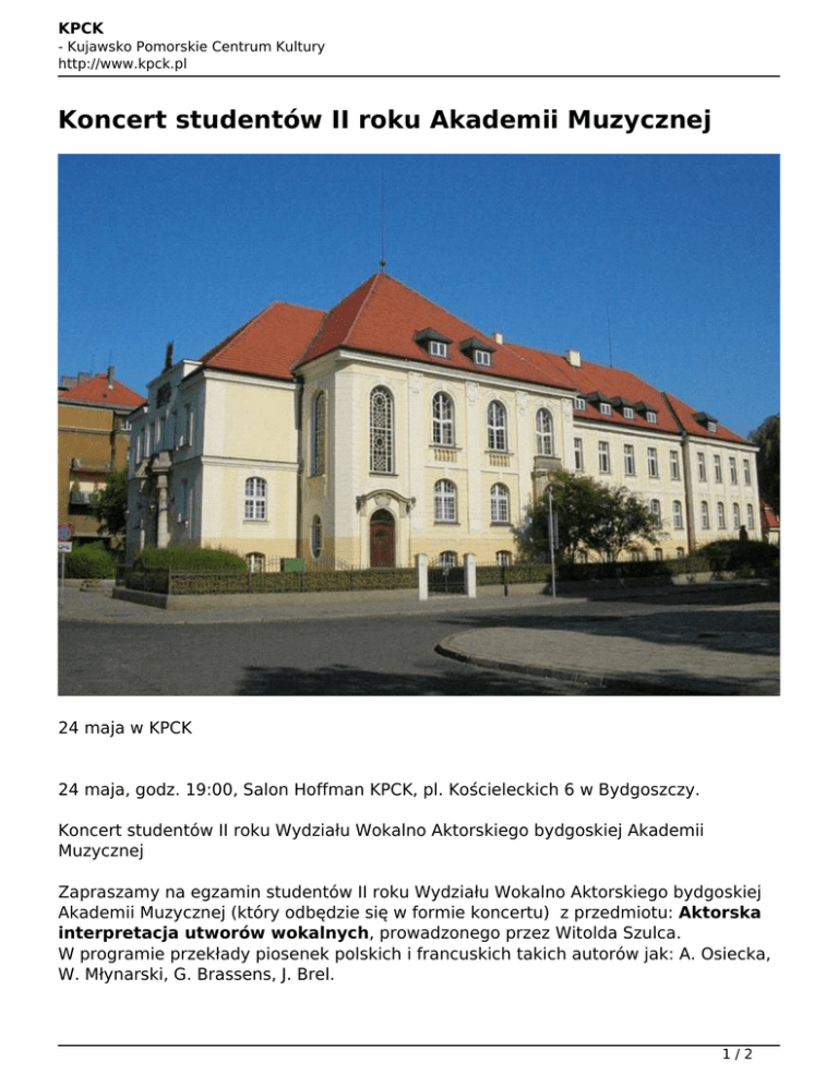 KPCK - Kujawsko Pomorskie Centrum Kultury http://www.kpck.pl Koncert studentów II roku Akademii Muzycznej 24 maja w KPCK 24 maja, godz. 19:00, Salon Hoffman KPCK, pl. Kościeleckich 6 w Bydgoszczy. Koncert studentów II roku Wydziału Wokalno Aktorskiego bydgoskiej Akademii Muzycznej Zapraszamy na egzamin studentów II roku Wydziału Wokalno Aktorskiego bydgoskiej Akademii Muzycznej (który odbędzie się w formie koncertu) z przedmiotu: Aktorska interpretacja utworów wokalnych, prowadzonego przez Witolda Szulca. W programie przekłady piosenek polskich i francuskich takich autorów jak: A. Osiecka, W. Młynarski, G. Brassens, J. Brel. 1/2 KPCK - Kujawsko Pomorskie Centrum Kultury http://www.kpck.pl Przy fortepianie- Dorota Kuczyńska. Źródło fotografii: byway.pl 2/2 Powered by TCPDF (www.tcpdf.org)