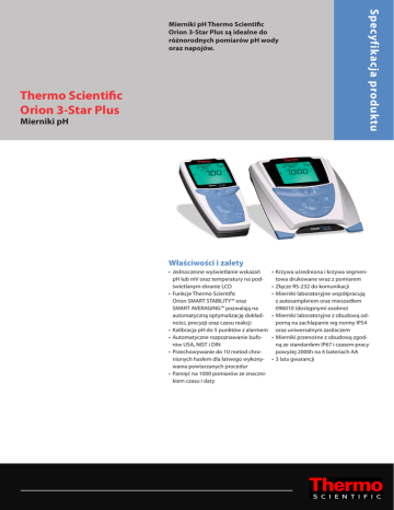 Thermo Scientific Orion 3-Star Plus Mierniki pH Specyfikacja produktu Mierniki pH Thermo Scientific Orion 3-Star Plus są idealne do różnorodnych pomiarów pH wody oraz napojów. Właściwości i zalety • Jednoczesne wyświetlanie wskazań pH lub mV oraz temperatury na podświetlanym ekranie LCD • Funkcje Thermo Scientific Orion SMART STABILITY™ oraz SMART AVERAGING™ pozwalają na automatyczną optymalizację dokładności, precyzji oraz czasu reakcji • Kalibracja pH do 5 punktów z alarmem • Automatyczne rozpoznawanie buforów USA, NIST i DIN • Przechowywanie do 10 metod chronionych hasłem dla łatwego wykonywania powtarzanych procedur • Pamięć na 1000 pomiarów ze znacznikiem czasu i daty • Krzywa uśredniona i krzywa segmentowa drukowane wraz z pomiarem • Złącze RS-232 do komunikacji • Mierniki laboratoryjne współpracują z autosamplerem oraz mieszadłem 096010 (dostępnymi osobno) • Mierniki laboratoryjne z obudową odporną na zachlapanie wg normy IP54 oraz uniwersalnym zasilaczem • Mierniki przenośne z obudową zgodną ze standardem IP67 i czasem pracy powyżej 2000h na 4 bateriach AA • 3 lata gwarancji Specyfikacje i numery katalogowe Thermo Scientific Orion 3-Star Plus Mierniki pH pH mV Temperatura Zakres: -2,000 do 19,999 Zestawy z miernikiem laboratoryjnym Rozdzielczość: 0,1; 0,01; 0,001 Akcesoria i roztwory ±0,002 Numer kat. / Aplikacja Czujnik Dokładność: Zakres: ± 1999,9 1112001 / Fresh Water • 9157BNMD epoksydowa elektroda pH/ATC Triode Rozdzielczość: 0,1 Dokładność: ±0,2mV lub 0,05% (większa z tych wartości) • Uchwyt • Bufory pH 4,01; 7,00; 10.01 oraz roztwór do przechowywania elektrod pH (butelki 473ml) Zakres: -5 do 105 °C Rozdzielczość: 0,1 do 99,9°C; 1,0 powyżej 99,9°C 1112003 / TRIS Fresh Water • 8102BNUWP szklana elektroda pH ROSS Ultra • 927005MD epoksydowy czujnik ATC Dokładnośc: ±0,1°C • Uchwyt • Bufory pH 4,01; 7,00; 10.01 oraz roztwór do przechowywania elektrod pH (butelki 473ml) 1112004 / Clog-Free Wastewater • 9172BNWP szklana elektroda pH Sure-Flow • 927007MD czujnik ATC ze stali nierdzewnej • Uchwyt • Bufory pH 4,01; 7,00; 10.01 oraz roztwór do przechowywania elektrod pH (butelki 473ml) 1112006 / TRIS Ultra Pure Water • 8102BNUWP szklana elektroda pH ROSS Ultra • 927005MD epoksydowy czujnik ATC • Uchwyt • Bufory pH 4,01; 7,00; 10.01 oraz roztwór do przechowywania elektrod pH (butelki 473ml) • Roztwór pHISA (5 x 60mL, butelki) 1112201 / Fresh Water • 9157BNMD epoksydowa elektroda pH/ATC Triode • Uchwyt 1112202 / Clog-Free TRIS Wastewater • 8172BNWP epoksydowa elektroda pH/ATC Triode • 927006MD szklany czujnik ATC • Uchwyt 1112203 / TRIS Fresh Water • 9156APWP epoksydowa elektroda pH AquaPro • Uchwyt 1112204 / Fresh Water • 9107BNMD epoksydowy czujnik pH/ATC Triode • Uchwyt 1112205 / Fresh Water • 9156APWP epoksydowa elektroda pH AquaPro • 927007MD czujnik ATC ze stali nierdzewnej • Uchwyt 1112207 / Fresh Water • 9106BNWP epoksydowa elektroda pH • Uchwyt 1112101 / TRIS Fresh Water • 8102BNUWP szklana elektroda pH ROSS Ultra • 927007MD czujnik ATC ze stali nierdzewnej 1112102 / Clog-Free TRIS Wastewater • 8172BNWP epoksydowa elektroda pH/ATC Triode • 927006MD szklany czujnik ATC 1112103 / TRIS Fresh Water • 8102BNUWP szklana elektroda pH ROSS Ultra 1112104 / Fresh Water • 9157BNMD epoksydowa elektroda pH/ATC Triode 1112107 / Fresh Water • 9106BNWP epoksydowa elektroda pH 1112108 / Clog-Free Wastewater • 9165BNWP epoksydowa elektroda pH Sure-Flow Miernik Numer kat. Zawartość 1112000 Miernik laboratoryjny pH Orion 3-Star, zasilacz uniwersalny oraz instrukcja użytkownika 1212000 Miernik przenośny pH Orion 3-Star, baterie oraz instrukcja użytkownika Zestawy z miernikiem przenośnym Numer kat. / Aplikacja Czujnik Akcesoria i roztwory 1212001 / Fresh Water • 9107BNMD epoksydowy czujnik pH/ATC Triode • Zlewka • Komora na elektrodę • Roztwór do przechowywania elektrod pH (5 x 60ml) • Bufory pH 4,01; 7,00; 10.01 (10 x 15 mL, saszetki) • Wzmocniona walizeczka 1212002 / TRIS Clog-Free Wastewater • 5107BNMD epoksydowy czujnik pH/ATC No Cal 1212501 / Fresh Water • 9107BNMD epoksydowy czujnik pH/ATC Triode 1212503 / ORP • 9179BNMD epoksydowy czujnik pH/ATC Triode 1212101 / Fresh Water • 9107BNMD epoksydowy czujnik pH/ATC Triode 1010115 / Fresh Water • 9107BNMD epoksydowy czujnik pH/ATC Triode 1010110 / Wastewater • 5107BNMD epoksydowy czujnik pH/ATC No Cal • Zlewka • Roztwór do przechowywania elektrod pH (5 x 60ml) • Bufory pH 4,01; 7,00; 10.01 (10 x 15 mL, saszetki) • Wzmocniona walizeczka • Zlewka • Komora na elektrodę • Roztwór do przechowywania elektrod pH (5 x 60ml) • Bufory pH 4,01; 7,00; 10.01 (10 x 15 mL, saszetki) • Walizeczka • Osłona miernika z komorą do przechowywania elektrod • Standard ORP (5 x 60 ml, butelki) • Walizeczka • Osłona miernika z komorą do przechowywania elektrod • Roztwór do płukania elektrod (25 x 15 mL, saszetki) • Roztwór do przechowywania elektrod pH (5 x 60ml) • Bufory pH 4,01; 7,00; 10.01 (10 x 15 mL, saszetki) • Walizeczka • Nota metody • Komora na elektrodę • Roztwór do przechowywania elektrod pH (5 x 60ml) • Bufory pH 4,01; 7,00; 10.01 (10 x 15 mL, saszetki) • Nota metody NTL - Nowoczesne Techniki Laboratoryjne ul. Kuropatwy 34 C, 02-892 Warszawa Tel. +22 84614 97, fax: +22 846 32 22 [email protected] www.ntl.pl