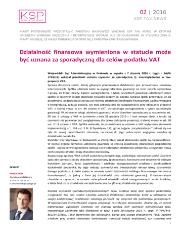 02 | 2016 KSP TAX NEWS MAMY PRZYJEMNOŚĆ PRZEDSTAWIĆ PAŃSTWU NAJNOWSZE WYDANIE KSP TAX NEWS, W KTÓRYM OPISUJEMY WYBRANE ORZECZENIA I INTERPRETACJE WYDANE LUB OPUBLIKOWANE W STYCZNIU 2016 R. MAMY NADZIEJĘ, ŻE NASZA PUBLIKACJA SPOTKA SIĘ Z PAŃSTWA ZAINTERESOWANIEM. Działalność finansowa wymieniona w statucie może być uznana za sporadyczną dla celów podatku VAT EKSPERT Michał Wilk doradca podatkowy T: +48 32 731 68 69 E: [email protected] Wojewódzki Sąd Administracyjny w Krakowie w wyroku z 7 stycznia 2016 r. (sygn. I SA/Kr 1734/15) wskazał przesłanki uznania czynności za sporadyczne, tj. nieuwzględnione w tzw. proporcji VAT. Sprawa dotyczyła spółki, której głównym przedmiotem działalności jest prowadzenie serwisów internetowych. Spółka udzielała także za wynagrodzeniem gwarancji na rzecz innych podmiotów z grupy, do której należy. Łączne wynagrodzenie z tytułu wszystkich gwarancji udzielonych przez spółkę w kolejnych latach stanowiło niewielki procent jej obrotu. Umowa spółki przewiduje, że do przedmiotu jej działalności zalicza się również działalność holdingów finansowych. Spółka wystąpiła o interpretację, zadając pytanie, czy była zobowiązana do uwzględniania przy obliczaniu proporcji VAT, o której mowa w art. 90 ustawy o VAT, otrzymanego wynagrodzenia z tytułu udzielonych gwarancji. W jej ocenie usługi udzielania gwarancji miały charakter sporadyczny w rozumieniu art. 90 ust. 6 ustawy o VAT w brzmieniu z dnia 31 grudnia 2010 r. i tym samym obrót z tytułu tej czynności nie powinien być uwzględniany dla celów obliczenia proporcji, o której mowa w art. 90 ust. 2 i 3 ustawy o VAT. Spółka wskazała, że przewidziane w ustawie o VAT wyłączenie stanowiło implementację art. 174 ust. 2 lit. B Dyrektywy 112, gdzie pojęcie „incydentalności” odnosi się nie tyle do samej częstotliwości zdarzenia, co raczej do jego poboczności względem zasadniczej działalności podatnika. Dyrektor Izby Skarbowej w Katowicach w interpretacji uznał stanowisko spółki za nieprawidłowe. W ocenie organu czynności udzielania gwarancji są częścią zasadniczej działalności gospodarczej spółki - uzyskane wynagrodzenie wpisuje się w całokształt działalności podatnika, a czynności noszą cechy powtarzalności i mają charakter planowany. Rozpoznając sprawę, WSA uchylił zaskarżoną interpretację, podzielając stanowisko spółki. Zdaniem sądu aby czynności miały charakter sporadyczny (pomocniczy), konieczne jest zestawienie różnych kryteriów: wartości, ilości, częstotliwości i wielkości zaangażowanych środków z całokształtem działalności podatnika, by tego rodzaju czynności nie zniekształcały obrazu istoty działalności danego podmiotu. Z faktu zapisu w umowie spółki działalności holdingu finansowego nie można domniemywać, że jedną z form jej działalności było udzielanie gwarancji. O incydentalnym charakterze czynności w sprawie zadecydował niewielki udział zaangażowanych w nie środków, a także fakt, że ta działalność nie była konieczna do głównej działalności gospodarczej. Kwestia czynności sporadycznych/pomocniczych rodzi ostatnio dużą ilość sporów podatników z organami. Jest ona istotna z punktu widzenia działalności podmiotów, które w oderwaniu od swojej podstawowej działalności udzielają pożyczek czy poręczeń dla podmiotów powiązanych. W najnowszych interpretacjach organy przyjmują restrykcyjne stanowisko. Zdarza się, że nawet jednorazowe wykonanie czynności nie stanowi według nich czynności pomocniczych (por. interpretacja Dyrektora Izby Skarbowej w Łodzi z dnia 29 stycznia 2015 r., sygn. IPTPP4/443801/14-2/ALN). Takie stanowisko jest dyskusyjne, biorąc pod uwagę orzecznictwo TSUE, zgodnie z którym przy ocenie charakteru konkretnych transakcji należy analizować, czy stanowią one 1 02 | 2016 KSP TAX NEWS uzupełnienie zasadniczej działalności gospodarczej podatnika, jak również poziom zaangażowania aktywów, przy nabyciu których podatnikowi przysługiwało prawo do obniżenia kwoty podatku należnego o kwotę podatku naliczonego (wyrok z dnia 29 kwietnia 2004 r., sygn. C-77/01; wyrok z dnia 11 lipca 1996 r., sygn. C-306/94). Sądy administracyjne najczęściej aprobują argumentację TSUE (wyrok NSA z dnia 28 września 2012, sygn. I FSK 1917/11; wyrok WSA we Wrocławiu z dnia 10 stycznia 2012 r., sygn. I SA/Wr 1416/11) wskazując, że konieczne jest zestawienie czynności według różnorakich kryteriów (wartości, ilości, częstotliwości, wielkości zaangażowanych środków) z całokształtem działalności podatnika. Zaliczenie w umowie spółki do jej działalności także działalności holdingów finansowych nie uniemożliwia uznania czynności udzielania gwarancji za pomocnicze/sporadyczne. Podobnie w tym duchu wypowiadały się NSA w orzeczeniu z dnia 14 lutego 2013 r. (sygn. I FSK 571/12) oraz WSA w Poznaniu w orzeczeniu z dnia 18 stycznia 2012 r. (sygn. I SA/Po 640/11), zgodnie z którymi istotne są czynności faktyczne, a nie elementy formalne. Prezentowany wyrok to kolejne pozytywne dla podatników orzeczenie dotyczące tego zagadnienia, mogące stanowić istotny argument w przypadku sporu z organem podatkowym. Podatek VAT Wojewódzki Sąd Administracyjny w Łodzi w wyroku z dnia 8 stycznia 2016 r. (sygn. I SA/Łd 1355/15) wyjaśnił, że przepisy art. 41 ust. 6-9 ustawy o VAT regulujące opodatkowanie eksportu nie są sprzeczne z art. 131 w zw. z art. 146 ust. 1 lit. A Dyrektywy 112. TSUE analizując przepisy prawa krajowego w świetle art. 146 ust. 1 i art. 131 Dyrektywy 112 uznał, że państwa członkowskie mogą w sposób odrębny regulować kwestię zastosowania zwolnienia przy eksporcie pod warunkiem, iż wprowadzenie tych przepisów ostatecznie nie pozbawi podatnika prawa do zwolnienia z podatku. Z taką sytuacją mamy do czynienia w przypadku przepisów ustawy o VAT, które przewidują czasowe opod
