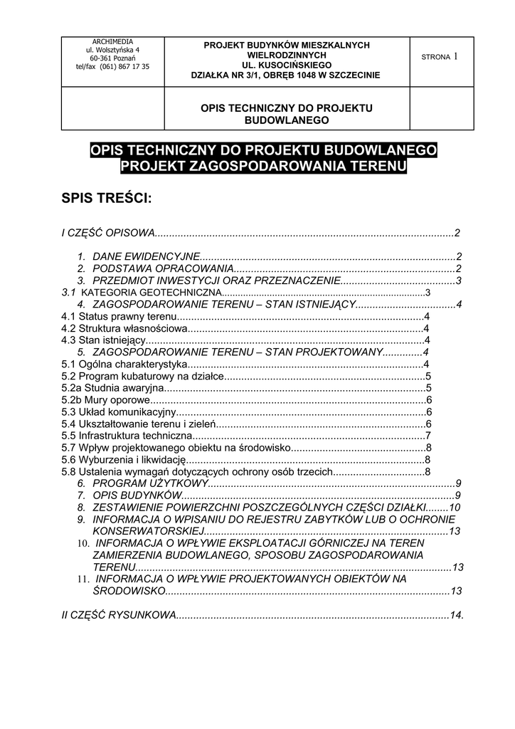 ARCHIMEDIA ul. Wolsztyńska 4 60-361 Poznań tel/fax (061) 867 17 35 PROJEKT BUDYNKÓW MIESZKALNYCH WIELRODZINNYCH UL. KUSOCIŃSKIEGO DZIAŁKA NR 3/1, OBRĘB 1048 W SZCZECINIE STRONA 1 OPIS TECHNICZNY DO PROJEKTU BUDOWLANEGO OPIS TECHNICZNY DO PROJEKTU BUDOWLANEGO PROJEKT ZAGOSPODAROWANIA TERENU SPIS TREŚCI: I CZĘŚĆ OPISOWA........................................................................................................2 1. DANE EWIDENCYJNE.........................................................................................2 2. PODSTAWA OPRACOWANIA.............................................................................2 3. PRZEDMIOT INWESTYCJI ORAZ PRZEZNACZENIE........................................3 3.1 KATEGORIA GEOTECHNICZNA.............................................................................3 4. ZAGOSPODAROWANIE TERENU – STAN ISTNIEJĄCY...................................4 4.1 Status prawny terenu......................................................................................4 4.2 Struktura własnościowa..................................................................................4 4.3 Stan istniejący.................................................................................................4 5. ZAGOSPODAROWANIE TERENU – STAN PROJEKTOWANY..............4 5.1 Ogólna charakterystyka..................................................................................4 5.2 Program kubaturowy na działce......................................................................5 5.2a Studnia awaryjna...........................................................................................5 5.2b Mury oporowe................................................................................................6 5.3 Układ komunikacyjny.......................................................................................6 5.4 Ukształtowanie terenu i zieleń.........................................................................6 5.5 Infrastruktura techniczna.................................................................................7 5.7 Wpływ projektowanego obiektu na środowisko...............................................8 5.6 Wyburzenia i likwidację...................................................................................8 5.8 Ustalenia wymagań dotyczących ochrony osób trzecich................................8 6. PROGRAM UŻYTKOWY......................................................................................9 7. OPIS BUDYNKÓW...............................................................................................9 8. ZESTAWIENIE POWIERZCHNI POSZCZEGÓLNYCH CZĘŚCI DZIAŁKI........10 9. INFORMACJA O WPISANIU DO REJESTRU ZABYTKÓW LUB O OCHRONIE KONSERWATORSKIEJ.....................................................................................13 10. INFORMACJA O WPŁYWIE EKSPLOATACJI GÓRNICZEJ NA TEREN ZAMIERZENIA BUDOWLANEGO, SPOSOBU ZAGOSPODAROWANIA TERENU..............................................................................................................13 11. INFORMACJA O WPŁYWIE PROJEKTOWANYCH OBIEKTÓW NA ŚRODOWISKO...................................................................................................13 II CZĘŚĆ RYSUNKOWA...............................................................................................14. ARCHIMEDIA ul. Wolsztyńska 4 60-361 Poznań tel/fax (061) 867 17 35 PROJEKT BUDYNKÓW MIESZKALNYCH WIELRODZINNYCH UL. KUSOCIŃSKIEGO DZIAŁKA NR 3/1, OBRĘB 1048 W SZCZECINIE STRONA 2 OPIS TECHNICZNY DO PROJEKTU BUDOWLANEGO I. CZĘŚĆ OPISOWA 1. Dane ewidencyjne. Inwestor: Oddział Regionalny Woskowej Agencji Mieszkaniowej w Szczecinie ul. Potulicka 2, 70-952 Szczecin Temat opracowania: Opracowanie dokumentacji projektowo-kosztorysowej dla budowy budynków mieszkalnych w Szczecinie przy ul. Kusocińskiego wraz z zagospodarowaniem terenu działki nr 3/1 z obrębu 1048 w Szczecinie. Lokalizacja inwestycji: działka nr 3/1, obręb 1048, Szczecin. 2. Podstawa opracowania. − Zlecenie Inwestora, − Umowa nr Nr 75/2010 z dnia 17.08.2010 na wykonanie prac projektowych, − Koncepcja architektoniczno-budowlana, − Dokumentacja geotechniczna wykonana przez ArtGeo, Marek Ober. − Dokumentacja geotechniczna wykonana przez EKOGEO, − Mapa sytuacyjno-wysokościowa z granicami i urządzeniami podziemnymi w skali 1:500, wykonana na zlecenie ARCHIMEDIA Architekci & Inżynierowie, − Wytyczne Inwestora, uzgodnienia, spotkania robocze, − Wytyczne nr 1/09 Prezesa Wojskowej Agencji Mieszkaniowej z dnia 30 stycznia 2009r. − Uchwała nr III/17/06 Rady Miasta szczecin z dnia 28 grudnia 2006 w sprawie Miejscowego planu zagospodarowania przestrzennego miasta Szczecin w rejonie „Nowe Miasto potulicka” obejmująca teren inwestycji oznaczony jako: Teren elementarny S.N.2006.Mw,U. − Wizja lokalna, − Upoważnienie dla p. Krzysztofa Janusa, − Oświadczenie o posiadanym prawie do dysponowania na cele budowlane, − Warunki przyłączenia węzłów cieplnych do miejskiej sieci ciepłowniczej, − Warunki przyłączenia wod.-kan., − Warunki przyłączenia do sieci elektrycznej, − Zezwolenie na lokalizację zjazdu, ARCHIMEDIA ul. Wolsztyńska 4 60-361 Poznań tel/fax (061) 867 17 35 PROJEKT BUDYNKÓW MIESZKALNYCH WIELRODZINNYCH UL. KUSOCIŃSKIEGO DZIAŁKA NR 3/1, OBRĘB 1048 W SZCZECINIE STRONA 3 OPIS TECHNICZNY DO PROJEKTU BUDOWLANEGO − Przepisy i Normy obowiązujące w budownictwie i pokrewne. − Rozporządzenie Ministra Infrastruktury w sprawie warunków technicznych, jakim powinny odpowiadać budynki i ich usytuowanie z dnia 12.04.2002 znowelizowane w dniu 12.03.2009. − Rozporządzenie Ministra Spraw Wewnętrznych i Administracji w sprawie w sprawie przeciwpożarowego zaopatrzenia w wodę oraz dróg pożarowych z dnia 24 lipca 2009. − Rozporządzenie Ministra Spraw Wewnętrznych i Administracji w sprawie w sprawie ochrony przeciwpożarowej budynków, innych obiektó