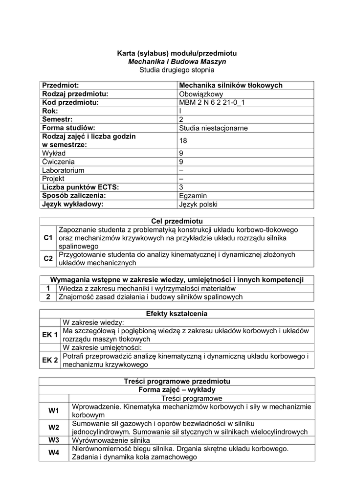 Karta (sylabus) modułu/przedmiotu Mechanika i Budowa Maszyn Studia drugiego stopnia Przedmiot: Rodzaj przedmiotu: Kod przedmiotu: Rok: Semestr: Forma studiów: Rodzaj zajęć i liczba godzin w semestrze: Wykład Ćwiczenia Laboratorium Projekt Liczba punktów ECTS: Sposób zaliczenia: Język wykładowy: Mechanika silników tłokowych Obowiązkowy MBM 2 N 6 2 21-0_1 I 2 Studia niestacjonarne 18 9 9 – – 3 Egzamin Język polski Cel przedmiotu Zapoznanie studenta z problematyką konstrukcji układu korbowo-tłokowego C1 oraz mechanizmów krzywkowych na przykładzie układu rozrządu silnika spalinowego Przygotowanie studenta do analizy kinematycznej i dynamicznej złożonych C2 układów mechanicznych Wymagania wstępne w zakresie wiedzy, umiejętności i innych kompetencji 1 Wiedza z zakresu mechaniki i wytrzymałości materiałów 2 Znajomość zasad działania i budowy silników spalinowych Efekty kształcenia W zakresie wiedzy: Ma szczegółową i pogłębioną wiedzę z zakresu układów korbowych i układów EK 1 rozrządu maszyn tłokowych W zakresie umiejętności: Potrafi przeprowadzić analizę kinematyczną i dynamiczną układu korbowego i EK 2 mechanizmu krzywkowego W1 W2 W3 W4 Treści programowe przedmiotu Forma zajęć – wykłady Treści programowe Wprowadzenie. Kinematyka mechanizmów korbowych i siły w mechanizmie korbowym Sumowanie sił gazowych i oporów bezwładności w silniku jednocylindrowym. Sumowanie sił stycznych w silnikach wielocylindrowych Wyrównoważenie silnika Nierównomierność biegu silnika. Drgania skrętne układu korbowego. Zadania i dynamika koła zamachowego W5 W6 C1 C2 C3 C4 C5 C6 1 2 3 Kinematyka i dynamika układów rozrządu Powtórzenie materiału. Forma zajęć – ćwiczenia Treści programowe Wprowadzenie. Obliczenia kinematyczne układu korbowo-tłokowego Obliczenia dynamiki układu korbowo-tłokowego. Obliczenia wypadkowej siły stycznej i momentu obrotowego Wyrównoważenie silnika. Obliczenia wytrzymałościowe elementów układu korbowo-tłokowego Obliczanie koła zamachowego Obliczenia kinematyki i dynamiki układu rozrząd oraz obliczenia wytrzymałościowe elementów tego układu Zajęcia podsumowujące. Zaliczenie Metody dydaktyczne Wykład z prezentacją multimedialną Dyskusja Samodzielne wykonywanie obliczeń i przygotowanie projektu Obciążenie pracą studenta Średnia liczba godzin na zrealizowanie Forma aktywności aktywności Godziny kontaktowe z wykładowcą, 18 w tym: Udział w wykładach 9 Udział w laboratoriach 9 Praca własna studenta, w tym: Przygotowanie do wykładu, w tym do 31 egzaminu Przygotowanie do ćwiczeń, w tym 31 opracowanie projektu Łączny czas pracy studenta 80 Sumaryczna liczba punktów ECTS dla 3 przedmiotu: Liczba punktów ECTS w ramach zajęć o charakterze praktycznym (ćwiczenia, 2 laboratoria, projekty) 1 2 1 2 3 Literatura podstawowa Jędrzejowski J.: Mechanika układów korbowych silników samochodowych. Warszawa, WKŁ 1986. Jędrzejowski J.: Obliczenia tłokowego silnika spalinowego. Warszawa, WNT 1988. Literatura uzupełniająca Felis J., Jaworowski H., Cieślik J.: Teoria maszyn i mechanizmów, Część 1: Analiza mechanizmów. Kraków, Wydawnictwa AGH 2008 Felis J., Jaworowski H.: Teoria maszyn i mechanizmów, Część 2: Przykłady i zadania. Kraków, Wydawnictwa AGH 2011 Niewiarowski K.: Tłokowe silniki spalinowe. T. 1. Warszawa, WKŁ 1983 4 Iskra A.: Dynamika mechanizmów tłokowych silników spalinowych. Poznań, Wydawnictwo Politechniki Poznańskiej 1995. Macierz efektów kształcenia Odniesienie danego efektu kształcenia do Efekt efektów Cele Treści kształcenia zdefiniowanych przedmiotu programowe dla całego programu (PEK) MBM2A_W08 C1, C2 W1W6, ++ C1C6 MBM2A_W10 EK 1 ++ MBM2A_W13 + MBM2A_U03 + C2 W1W6, EK 2 MBM2A_U11 + C1C6 Metody dydaktyczne Metody oceny 1, 2, 3 O1, O2 1, 2, 3 O1, O2 Metody i kryteria oceny Symbol metody oceny O1 O2 Opis metody oceny Próg zaliczeniowy Egzamin pisemny Ocena przygotowanych projektów Autor dr hab. inż. Grzegorz Koszałka programu: Adres e-mail: [email protected] Jednostka Instytut Transportu, Silników Spalinowych i Ekologii organizacyjna: 50% 75%