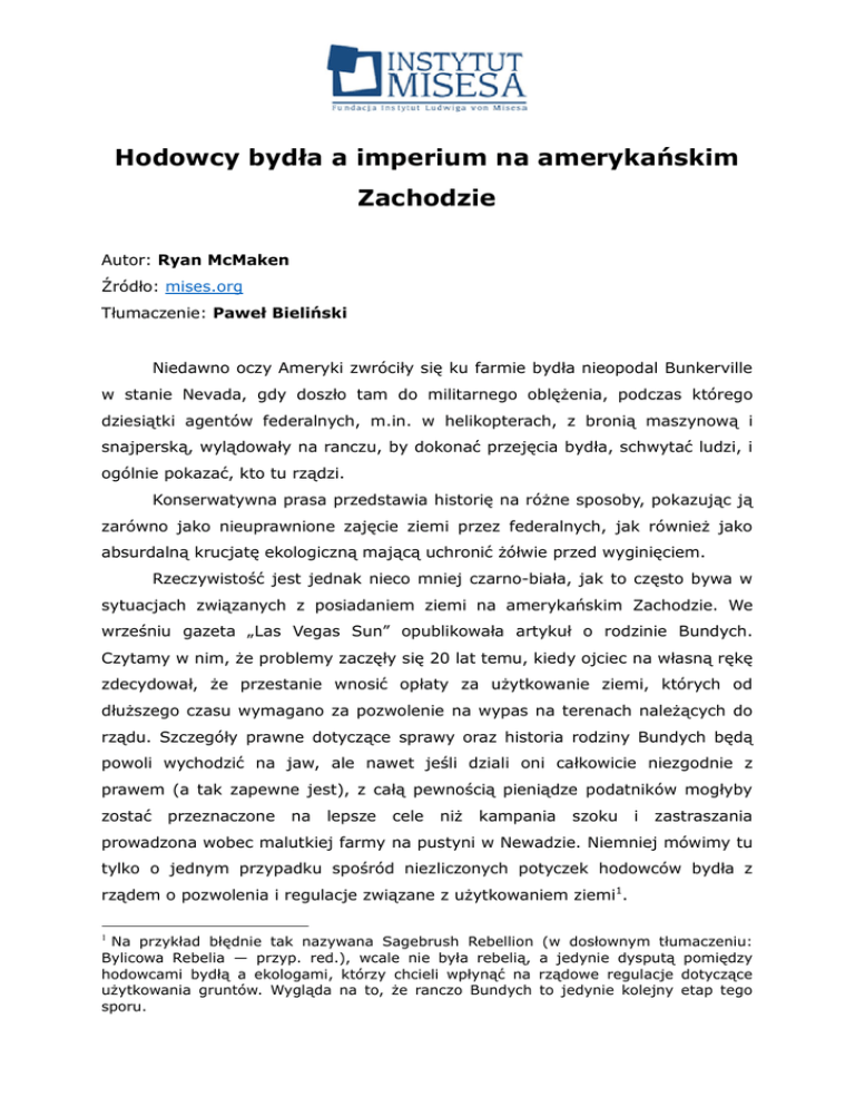 Hodowcy bydła a imperium na amerykańskim Zachodzie Autor: Ryan McMaken Źródło: mises.org Tłumaczenie: Paweł Bieliński Niedawno oczy Ameryki zwróciły się ku farmie bydła nieopodal Bunkerville w stanie Nevada, gdy doszło tam do militarnego oblężenia, podczas którego dziesiątki agentów federalnych, m.in. w helikopterach, z bronią maszynową i snajperską, wylądowały na ranczu, by dokonać przejęcia bydła, schwytać ludzi, i ogólnie pokazać, kto tu rządzi. Konserwatywna prasa przedstawia historię na różne sposoby, pokazując ją zarówno jako nieuprawnione zajęcie ziemi przez federalnych, jak również jako absurdalną krucjatę ekologiczną mającą uchronić żółwie przed wyginięciem. Rzeczywistość jest jednak nieco mniej czarno-biała, jak to często bywa w sytuacjach związanych z posiadaniem ziemi na amerykańskim Zachodzie. We wrześniu gazeta „Las Vegas Sun” opublikowała artykuł o rodzinie Bundych. Czytamy w nim, że problemy zaczęły się 20 lat temu, kiedy ojciec na własną rękę zdecydował, że przestanie wnosić opłaty za użytkowanie ziemi, których od dłuższego czasu wymagano za pozwolenie na wypas na terenach należących do rządu. Szczegóły prawne dotyczące sprawy oraz historia rodziny Bundych będą powoli wychodzić na jaw, ale nawet jeśli dziali oni całkowicie niezgodnie z prawem (a tak zapewne jest), z całą pewnością pieniądze podatników mogłyby zostać przeznaczone na lepsze cele niż kampania szoku i zastraszania prowadzona wobec malutkiej farmy na pustyni w Newadzie. Niemniej mówimy tu tylko o jednym przypadku spośród niezliczonych potyczek hodowców bydła z rządem o pozwolenia i regulacje związane z użytkowaniem ziemi1. 1 Na przykład błędnie tak nazywana Sagebrush Rebellion Bylicowa Rebelia — przyp. red.), wcale nie była rebelią, hodowcami bydłą a ekologami, którzy chcieli wpłynąć na użytkowania gruntów. Wygląda na to, że ranczo Bundych sporu. (w dosłownym tłumaczeniu: a jedynie dysputą pomiędzy rządowe regulacje dotyczące to jedynie kolejny etap tego Podczas gdy nieobeznani z użytkowaniem ziemi na Zachodzie mogą widzieć w tym wszystkim jakiś nowy nikczemny postępek ze strony rządu, faktem jest, że zachodnie zasady najmu ziemi pod wypas (oraz do innych celów) pozostają niezmienne od ponad stu lat, a rząd posiadał co najmniej 40 proc. ziemi w wielu zachodnich stanach, jeszcze zanim zostały one przyłączone do Stanów Zjednoczonych w XIX w. Ponadto na terenie 13 zachodnich stanów znajduje się 93 proc. terenów rządowych, w tym dwie trzecie całego obszaru Utah i 81 proc. całego obszaru Nevady. Zachodnie stany od dawna nie są już oparte na własności prywatnej i błogo niezależne od kontroli rządu, który w rzeczywistości jak dotąd bardziej ingerował w sytuację na zachodzie niż na wschodzie. Dzieje się tak ponieważ, ziemia i inne zasoby naturalne Zachodu są w rękach wielkiej socjalistycznej biurokracji, która od końca XIX w. zarządza wodami, ziemią i minerałami. Z pewnością na rozległych terenach pozostających pod kontrolą federalną, silnie wspieraną przez rząd centralny, który wzbogacił się na wojnie domowej, pewne wspólnoty były wyjątkowo niezależne i można powiedzieć, że miały charakter anarchistyczny. Jednak w szerszej perspektywie od lat 90. XIX w. gospodarka amerykańskiego Zachodu jest zdominowana przez ziemie państwowe, regulacje, subsydia i biurokrację. Rozrost federalnej biurokracji na Zachodzie W swojej historii amerykańskiego Zachodu Richard White pisze: Poczynając od lat 90. XIX w., rząd centralny wycofuje się z roli niańki przyszłych stanów i przestaje marnotrawić zasoby, bez umiaru rozdając je obywatelom i krajowym korporacjom. Waszyngton staje się zarządcą zachodniej ziemi, surowców i — rzecz nieunikniona — ludności2. Kryła się za tym filozofia głosząca, że zasobami amerykańskiego Zachodu rozporządzano w sposób „wydajny". To przekonanie było naturalnym wynikiem ówczesnej odrealnionej i pełnej błędów ekonomii klasycznej, której modele 2 Richard White, It’s Your Misfortune and None of My Own: A New History of the American West (University of Oklahoma Press, 1993), s. 399. opierały się nieistniejących na na założeniach o wyidealizowanych przedindustrialnym Zachodzie. rynkach Innymi i konkurencji, słowy, według dziewiętnastowiecznych intelektualistów potrzeba było rządowej interwencji, by stworzyć odpowiednie warunki dla zaistnienia wydajnego kapitalizmu. Tak jak w przypadku kolei, rząd federalny miał wkroczyć, by zapewnić konkurencję i wydajność na nowych rynkach pogranicza. Do 1903 r. Public Land Commission Teodora Roosevelta wzmocniła koncepcję publicznej własności na Zachodzie. Tym samym zrezygnowano z pomysłu, by cała ziemia była tam rozdzielona na mocy ustaw o gospodarstwach rolnych, które zresztą same w sobie były produktem programów rządowych. Powstanie Bureau of Reclamation (które zarządzało wodami) i Bureau of Land Management oznaczało, że wody i ziemie pozostaną pod bezpośrednią lub pośrednią kontrolą rządu na czas nieokreślony. Niezależnie od filozoficznych pobudek rządu, szybko doszło do znanej nam wszystkim sytuacji, kiedy państwo przejmuje kontrolę nad dystrybucją dóbr. Agencje rządowe stały się celem lobbyingu ze strony drobnych i większych grup interesu skutkiem czego było „zawłaszczanie” regulacji. Podstawą robienia interesów na Zachodzie szybko stało się posiadanie licencji na użytkowanie ziemi pod odwierty, górnictwo i wypas. Ponadto kluczem do sukcesu były, rzecz jasna, wpływy w agencjach rządowych. Wśród mieszkańców Zachodu panowało powszechne poparcie dla kontroli federalnej. Jako region biedniejszy i przyciągający kapitał w mniejszym stopniu niż Wschód, Zachód szybko pogodził się z systemem własności publicznej, głównie dlatego, że rząd, poprzez subsydia, programy rob