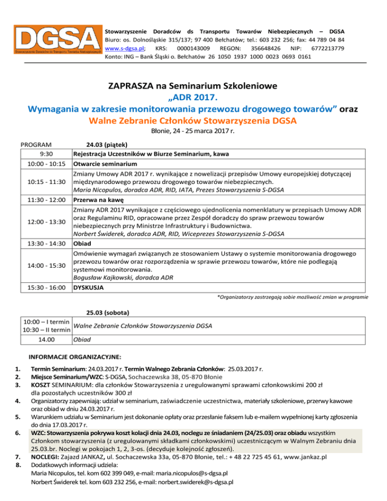 Stowarzyszenie Doradców ds Transportu Towarów Niebezpiecznych – DGSA Biuro: os. Dolnośląskie 315/137; 97 400 Bełchatów; tel.: 603 232 256; fax: 44 789 04 84 www.s-dgsa.pl; KRS: 0000143009 REGON: 356648426 NIP: 6772213779 Konto: ING – Bank Śląski o. Bełchatów 26 1050 1937 1000 0023 0693 0161 ZAPRASZA na Seminarium Szkoleniowe „ADR 2017. Wymagania w zakresie monitorowania przewozu drogowego towarów” oraz Walne Zebranie Członków Stowarzyszenia DGSA Błonie, 24 - 25 marca 2017 r. PROGRAM 9:30 24.03 (piątek) Rejestracja Uczestników w Biurze Seminarium, kawa 10:00 - 10:15 Otwarcie seminarium 10:15 - 11:30 Zmiany Umowy ADR 2017 r. wynikające z nowelizacji przepisów Umowy europejskiej dotyczącej międzynarodowego przewozu drogowego towarów niebezpiecznych. Maria Nicopulos, doradca ADR, RID, IATA, Prezes Stowarzyszenia S-DGSA 11:30 - 12:00 Przerwa na kawę 12:00 - 13:30 13:30 - 14:30 14:00 - 15:30 15:30 - 16:00 Zmiany ADR 2017 wynikające z częściowego ujednolicenia nomenklatury w przepisach Umowy ADR oraz Regulaminu RID, opracowane przez Zespół doradczy do spraw przewozu towarów niebezpiecznych przy Ministrze Infrastruktury i Budownictwa. Norbert Świderek, doradca ADR, RID, Wiceprezes Stowarzyszenia S-DGSA Obiad Omówienie wymagań związanych ze stosowaniem Ustawy o systemie monitorowania drogowego przewozu towarów oraz rozporządzenia w sprawie przewozu towarów, które nie podlegają systemowi monitorowania. Bogusław Kajkowski, doradca ADR DYSKUSJA *Organizatorzy zastrzegają sobie możliwość zmian w programie 25.03 (sobota) 10:00 – I termin Walne Zebranie Członków Stowarzyszenia DGSA 10:30 – II termin 14.00 Obiad INFORMACJE ORGANIZACYJNE: 1. 2. 3. 4. 5. 6. 7. 8. Termin Seminarium: 24.03.2017 r. Termin Walnego Zebrania Członków: 25.03.2017 r. Miejsce Seminarium/WZC: S-DGSA, Sochaczewska 38, 05-870 Błonie KOSZT SEMINARIUM: dla członków Stowarzyszenia z uregulowanymi sprawami członkowskimi 200 zł dla pozostałych uczestników 300 zł Organizatorzy zapewniają: udział w seminarium, zaświadczenie uczestnictwa, materiały szkoleniowe, przerwy kawowe oraz obiad w dniu 24.03.2017 r. Warunkiem udziału w Seminarium jest dokonanie opłaty oraz przesłanie faksem lub e-mailem wypełnionej karty zgłoszenia do dnia 17.03.2017 r. WZC: Stowarzyszenia pokrywa koszt kolacji dnia 24.03, noclegu ze śniadaniem (24/25.03) oraz obiadu wszystkim Członkom stowarzyszenia (z uregulowanymi składkami członkowskimi) uczestniczącym w Walnym Zebraniu dnia 25.03.br. Noclegi w pokojach 1, 2, 3-os. (decyduje kolejność zgłoszeń). NOCLEGI: Zajazd JANKAZ, ul. Sochaczewska 33a, 05-870 Błonie, tel.: + 48 22 725 45 61, www.jankaz.pl Dodatkowych informacji udziela: Maria Nicopulos, tel. kom 602 399 049, e-mail: [email protected] Norbert Świderek tel. kom 603 232 256, e-mail: [email protected] KARTA ZGŁOSZENIA udziału w Seminarium Szkoleniowym „ADR 2017. Wymagania w zakresie monitorowanie przewozu drogowego towarów” oraz Walnym Zebranie Członków Stowarzyszenia DGSA Wypełnioną DRUKOWANYMI LITERAMI kartę prosimy przesyłać do dnia 17.03.17 r. pocztą elektroniczną na adres: [email protected] lub faxem na nr 44 789 04 84. Zgłoszenie uczestnictwa w seminarium szkoleniowym dnia 24.03.2017 r. Imię i nazwisko uczestnika Członek Stowarzyszenia (z uregulowanymi składkami członkowskimi) TAK * NIE* NIE DOTYCZY* Firma zgłaszająca uczestnika Adres firmy NIP Płatnik: pełna nazwa, adres, NIP Telefon kontaktowy e-mail Zgłoszenie uczestnictwa w Walnym Zebraniu Członków dnia 25.03.2017 r. Imię i nazwisko członka Stowarzyszenia Członek Stowarzyszenia (z uregulowanymi składkami członkowskimi) TAK * NIE* TAK * NIE* Proszę o rezerwację: Kolacji oraz noclegu ze śniadaniem (24/25.03) * - odpowiednie zaznaczyć Wpłat należy dokonać na konto Stowarzyszenia Doradców ds. Transportu Towarów Niebezpiecznych – DGSA: w INGBank Śląski o/Bełchatów 26 1050 1937 1000 0023 0693 0161 z adnotacją: „Błonie 2017” oraz imieniem i nazwiskiem uczestnika w terminie do 17.03.2017 r.