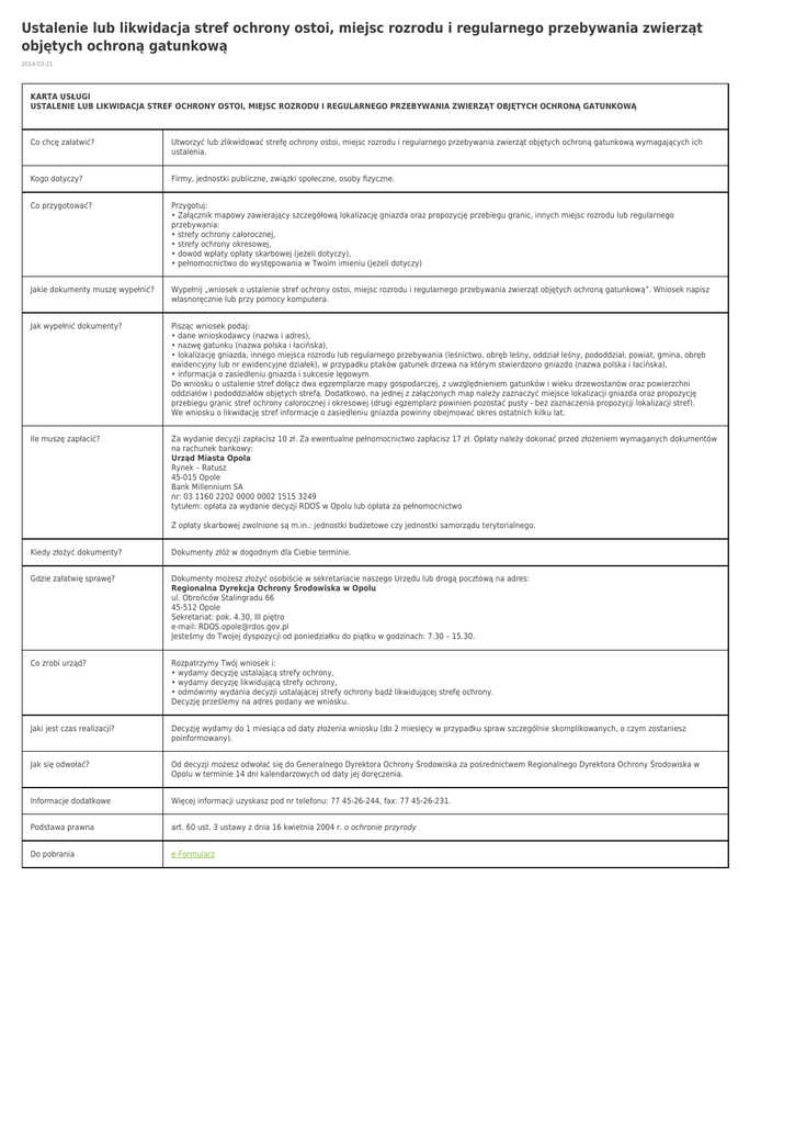 Ustalenie lub likwidacja stref ochrony ostoi, miejsc rozrodu i regularnego przebywania zwierząt objętych ochroną gatunkową 2014-03-21 KARTA USŁUGI USTALENIE LUB LIKWIDACJA STREF OCHRONY OSTOI, MIEJSC ROZRODU I REGULARNEGO PRZEBYWANIA ZWIERZĄT OBJĘTYCH OCHRONĄ GATUNKOWĄ Co chcę załatwić? Utworzyć lub zlikwidować strefę ochrony ostoi, miejsc rozrodu i regularnego przebywania zwierząt objętych ochroną gatunkową wymagających ich ustalenia. Kogo dotyczy? Firmy, jednostki publiczne, związki społeczne, osoby fizyczne. Co przygotować? Przygotuj: • Załącznik mapowy zawierający szczegółową lokalizację gniazda oraz propozycję przebiegu granic, innych miejsc rozrodu lub regularnego przebywania: • strefy ochrony całorocznej, • strefy ochrony okresowej, • dowód wpłaty opłaty skarbowej (jeżeli dotyczy), • pełnomocnictwo do występowania w Twoim imieniu (jeżeli dotyczy) Jakie dokumenty muszę wypełnić? Wypełnij „wniosek o ustalenie stref ochrony ostoi, miejsc rozrodu i regularnego przebywania zwierząt objętych ochroną gatunkową”. Wniosek napisz własnoręcznie lub przy pomocy komputera. Jak wypełnić dokumenty? Pisząc wniosek podaj: • dane wnioskodawcy (nazwa i adres), • nazwę gatunku (nazwa polska i łacińska), • lokalizację gniazda, innego miejsca rozrodu lub regularnego przebywania (leśnictwo, obręb leśny, oddział leśny, pododdział, powiat, gmina, obręb ewidencyjny lub nr ewidencyjne działek), w przypadku ptaków gatunek drzewa na którym stwierdzono gniazdo (nazwa polska i łacińska), • informacja o zasiedleniu gniazda i sukcesie lęgowym. Do wniosku o ustalenie stref dołącz dwa egzemplarze mapy gospodarczej, z uwzględnieniem gatunków i wieku drzewostanów oraz powierzchni oddziałów i pododdziałów objętych strefą. Dodatkowo, na jednej z załączonych map należy zaznaczyć miejsce lokalizacji gniazda oraz propozycję przebiegu granic stref ochrony całorocznej i okresowej (drugi egzemplarz powinien pozostać pusty - bez zaznaczenia propozycji lokalizacji stref). We wniosku o likwidację stref informacje o zasiedleniu gniazda powinny obejmować okres ostatnich kilku lat. Ile muszę zapłacić? Za wydanie decyzji zapłacisz 10 zł. Za ewentualne pełnomocnictwo zapłacisz 17 zł. Opłaty należy dokonać przed złożeniem wymaganych dokumentów na rachunek bankowy: Urząd Miasta Opola Rynek – Ratusz 45-015 Opole Bank Millennium SA nr: 03 1160 2202 0000 0002 1515 3249 tytułem: opłata za wydanie decyzji RDOŚ w Opolu lub opłata za pełnomocnictwo Z opłaty skarbowej zwolnione są m.in.: jednostki budżetowe czy jednostki samorządu terytorialnego. Kiedy złożyć dokumenty? Dokumenty złóż w dogodnym dla Ciebie terminie. Gdzie załatwię sprawę? Dokumenty możesz złożyć osobiście w sekretariacie naszego Urzędu lub drogą pocztową na adres: Regionalna Dyrekcja Ochrony Środowiska w Opolu ul. Obrońców Stalingradu 66 45-512 Opole Sekretariat: pok. 4.30, III piętro e-mail: [email protected] Jesteśmy do Twojej dyspozycji od poniedziałku do piątku w godzinach: 7.30 – 15.30. Co zrobi urząd? Rozpatrzymy Twój wniosek i: • wydamy decyzję ustalającą strefy ochrony, • wydamy decyzję likwidującą strefy ochrony, • odmówimy wydania decyzji ustalającej strefy ochrony bądź likwidującej strefę ochrony. Decyzję prześlemy na adres podany we wniosku. Jaki jest czas realizacji? Decyzję wydamy do 1 miesiąca od daty złożenia wniosku (do 2 miesięcy w przypadku spraw szczególnie skomplikowanych, o czym zostaniesz poinformowany). Jak się odwołać? Od decyzji możesz odwołać się do Generalnego Dyrektora Ochrony Środowiska za pośrednictwem Regionalnego Dyrektora Ochrony Środowiska w Opolu w terminie 14 dni kalendarzowych od daty jej doręczenia. Informacje dodatkowe Więcej informacji uzyskasz pod nr telefonu: 77 45-26-244, fax: 77 45-26-231. Podstawa prawna art. 60 ust. 3 ustawy z dnia 16 kwietnia 2004 r. o ochronie przyrody Do pobrania e-Formularz
